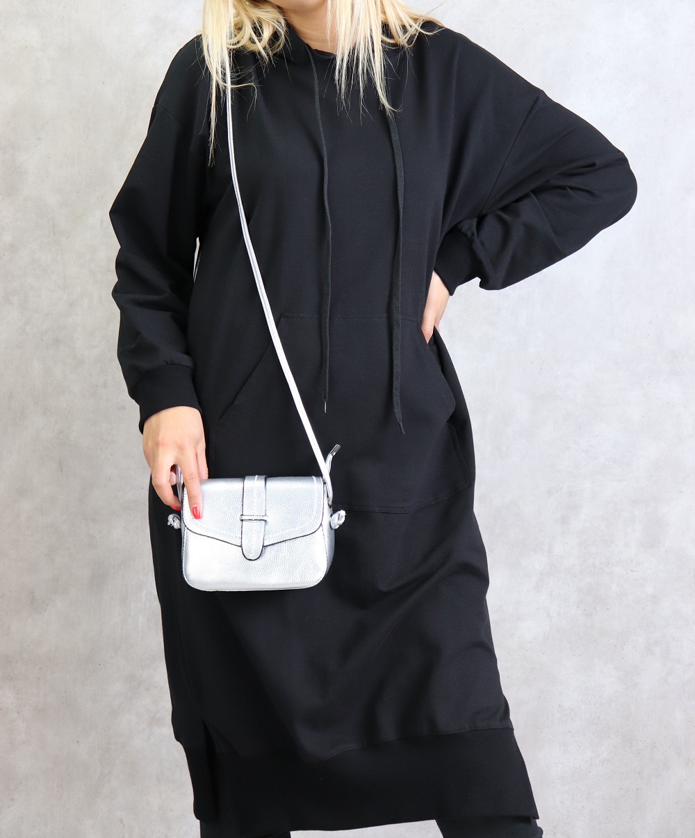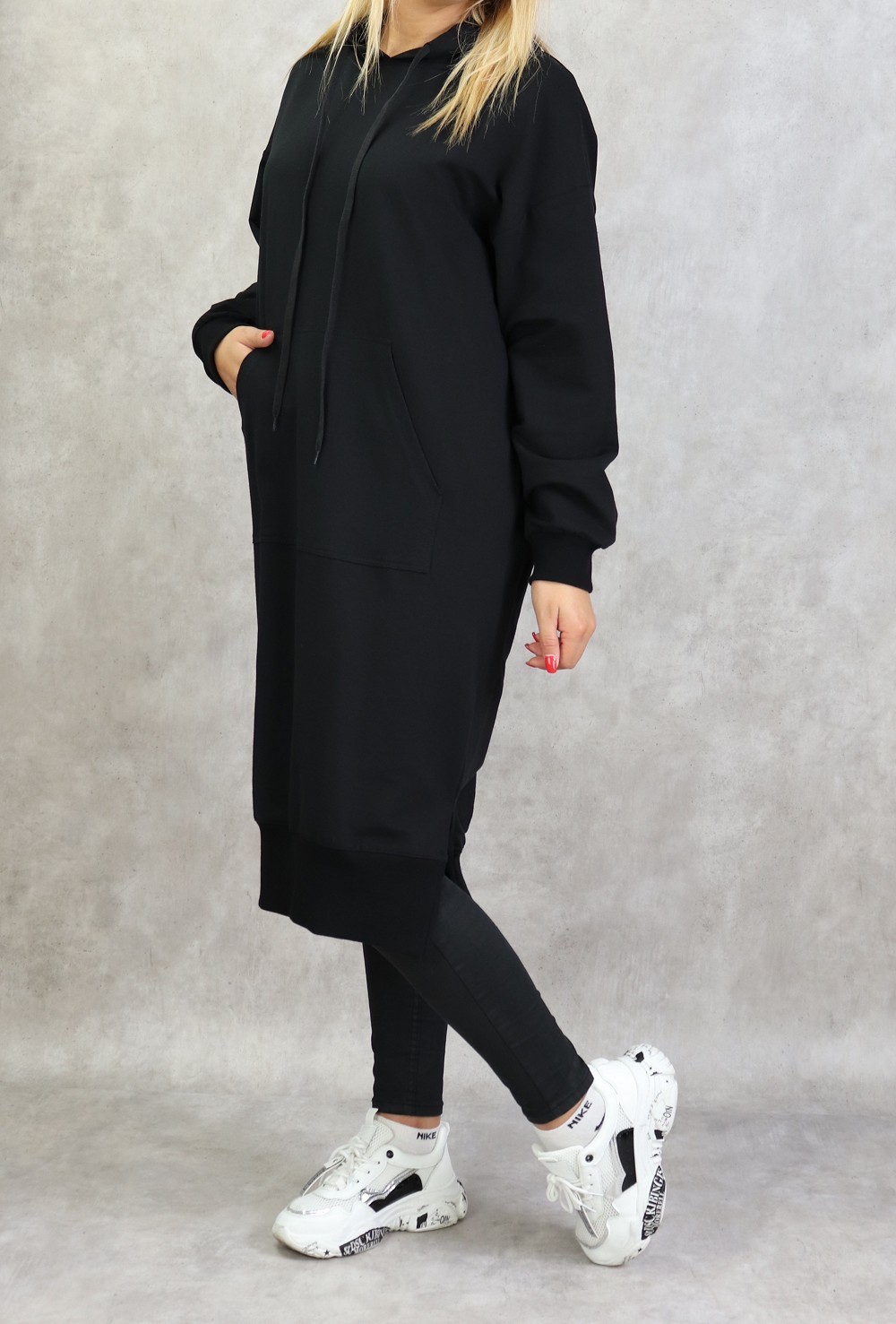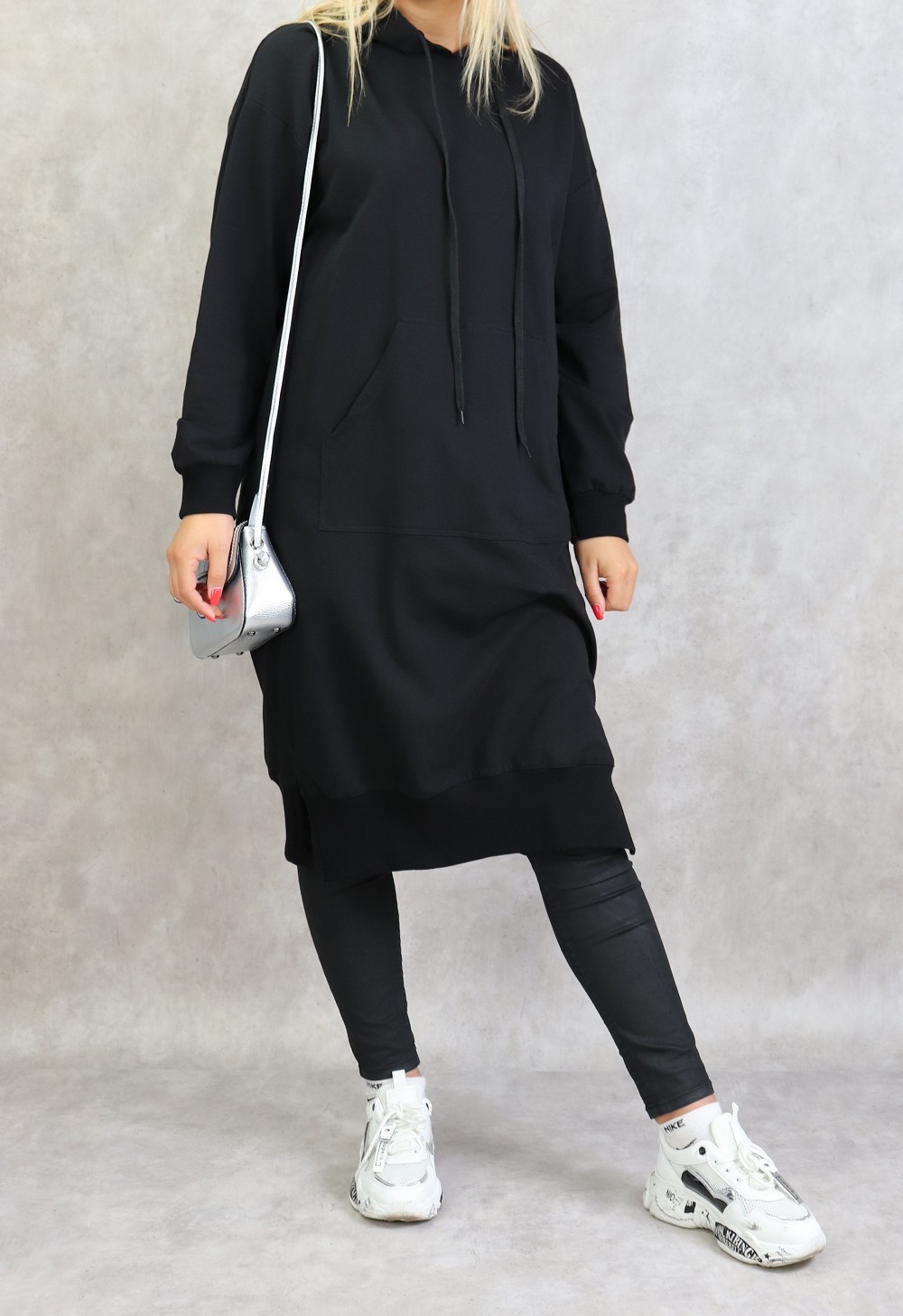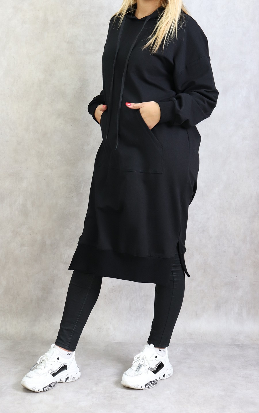 Sweat long, capuche avec cordon de serrage, manches longues , poignets cotelés, poche kangourou. Coupe droite, fentes sur les cotés, matière sweat agréable au toucher et à porter.