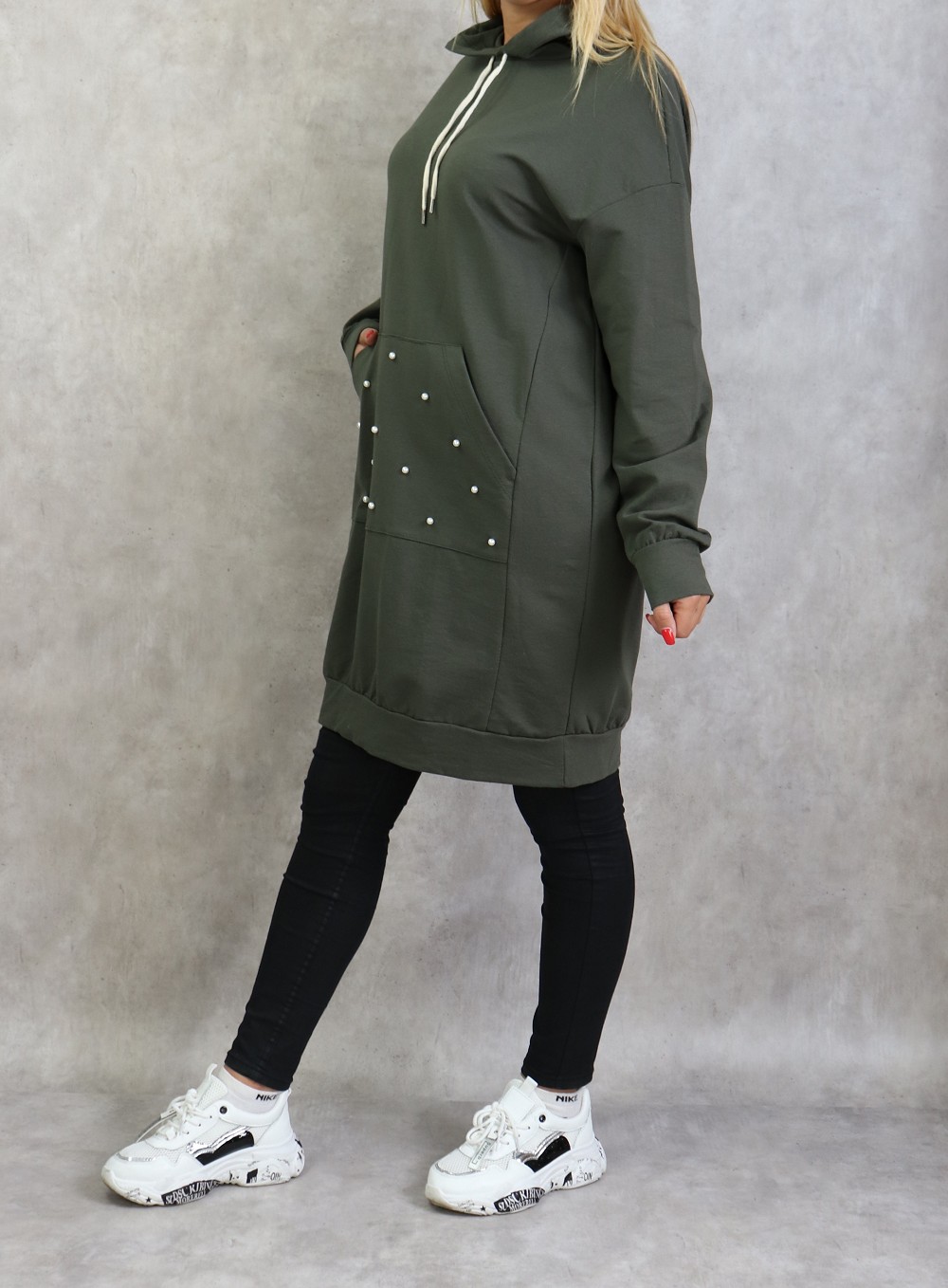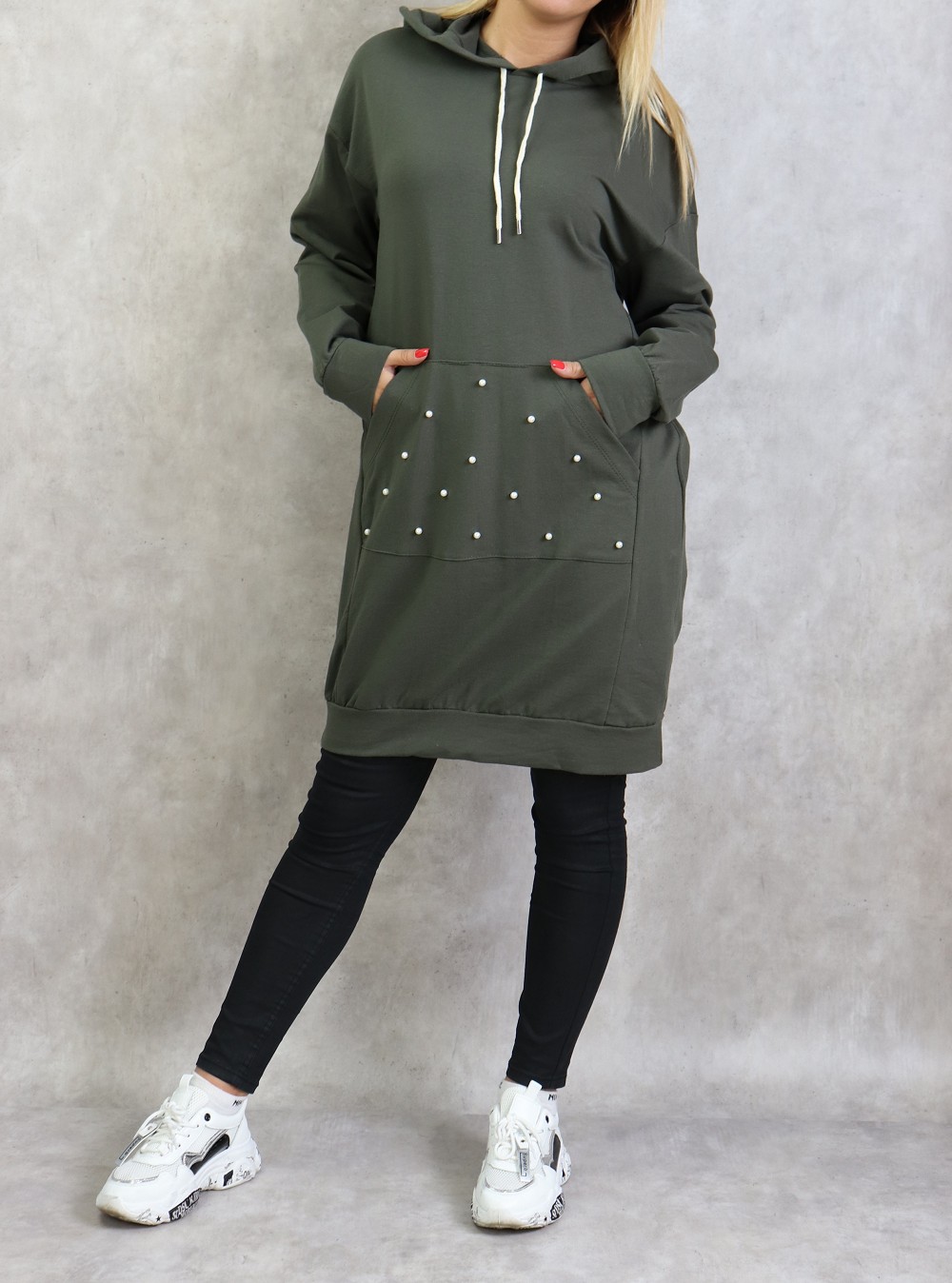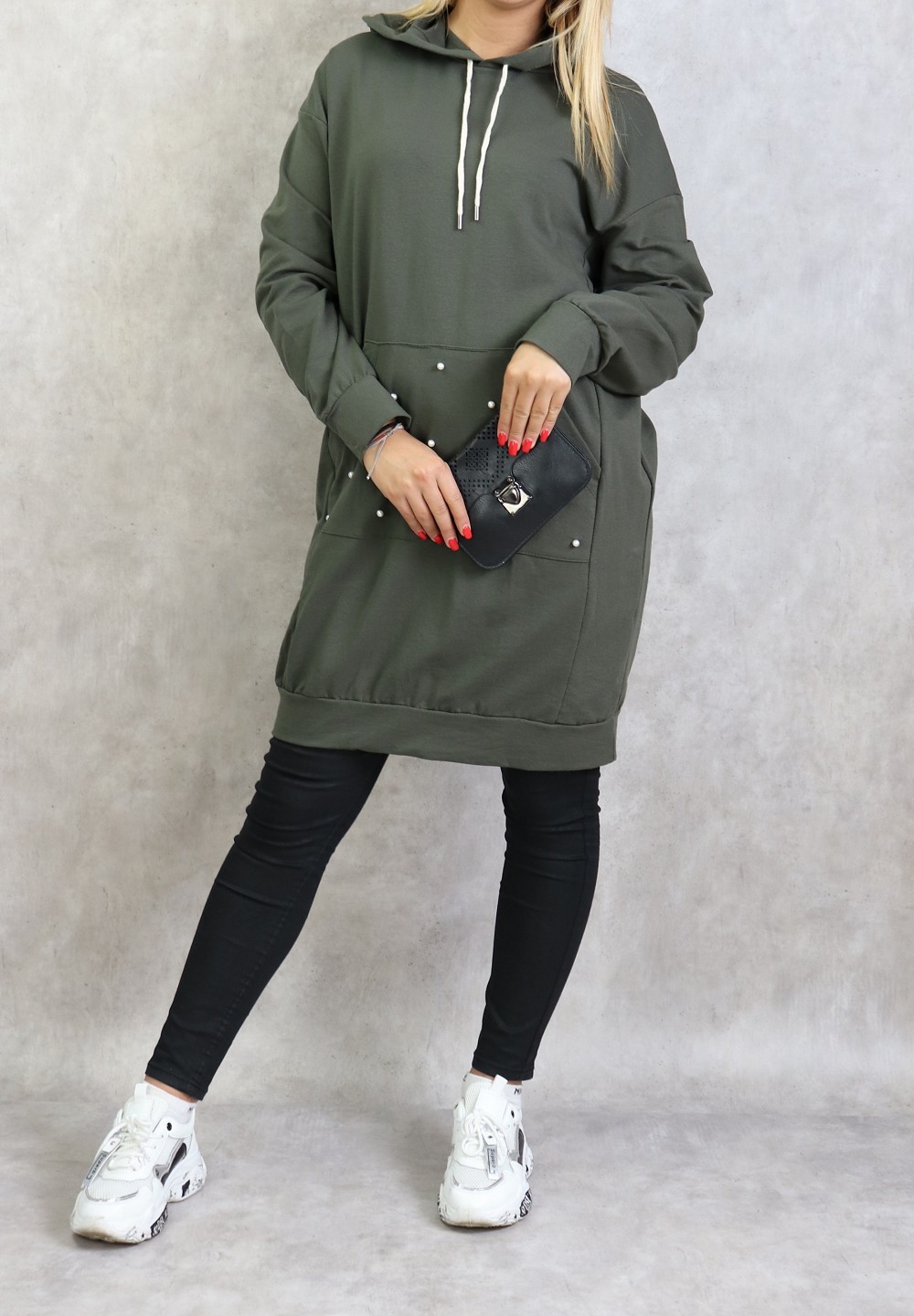 Sweat long à capuche avec lien de serrage et poche kangourou décoré de petites perles nacrées. Parfait pour être en mode Urban Classic.