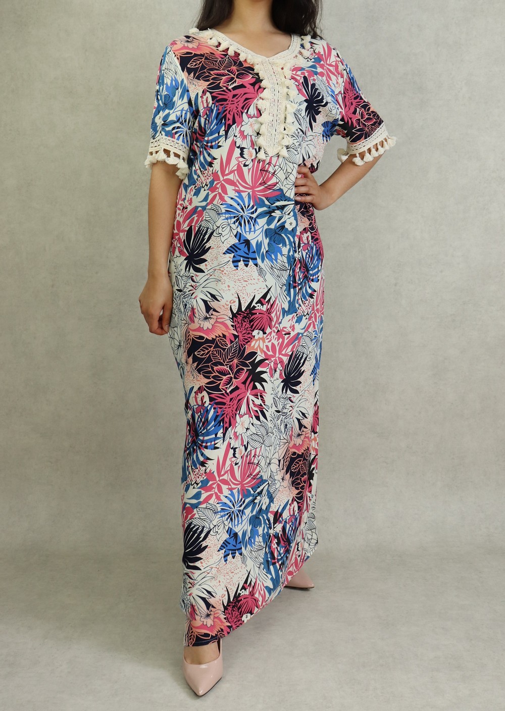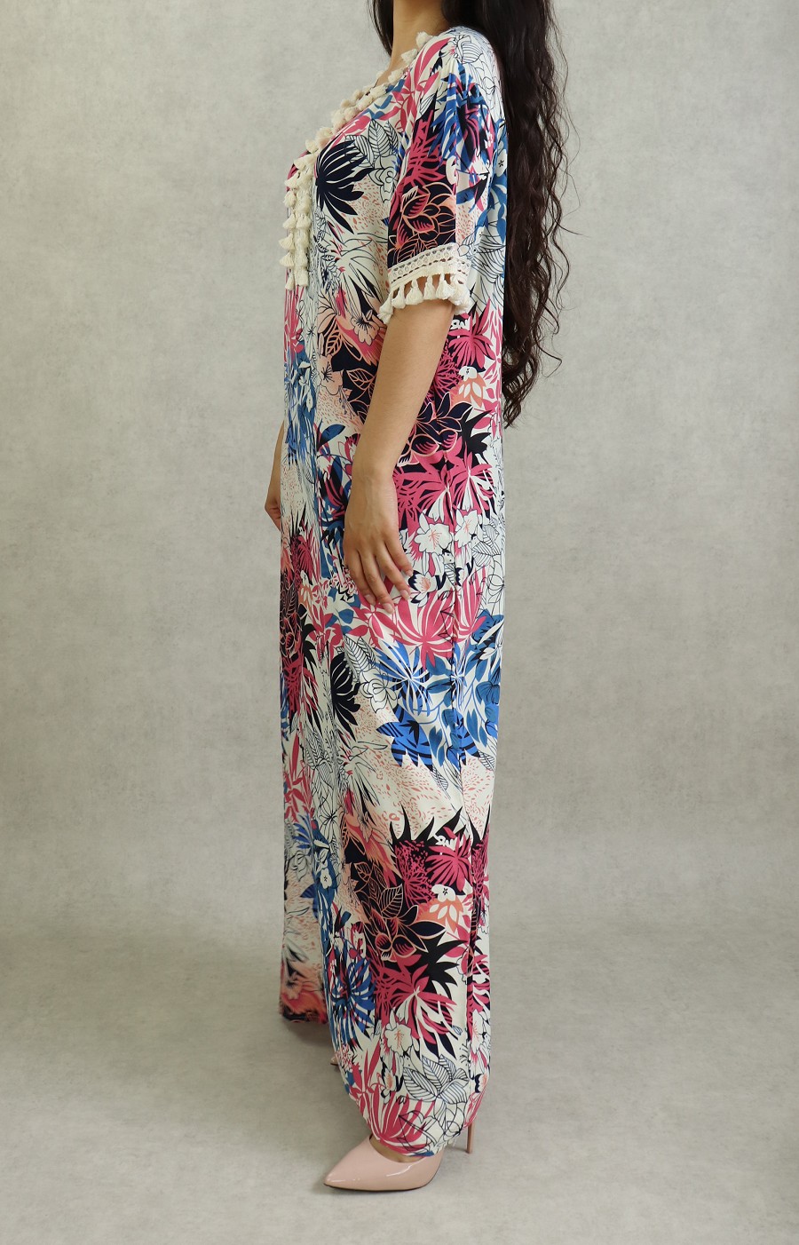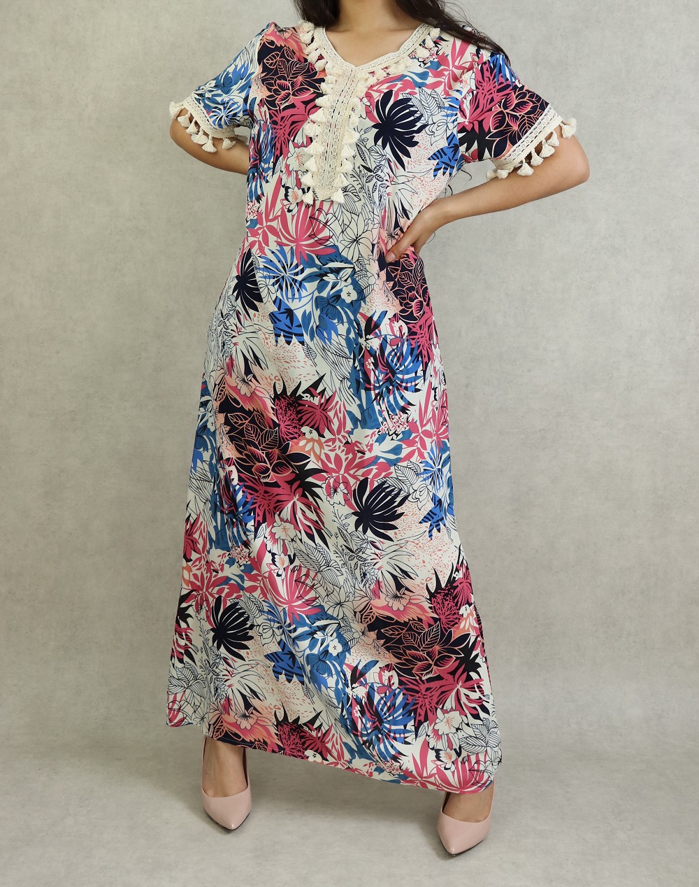 Robe longue d'été ou pour la maison à imprimé exotique pour femme, manches courtes avec broderies et pompons beige, coupe droite, tissu fluide et doux au toucher coton.