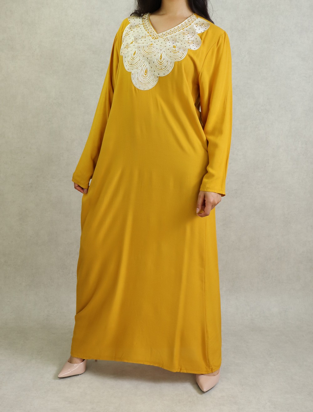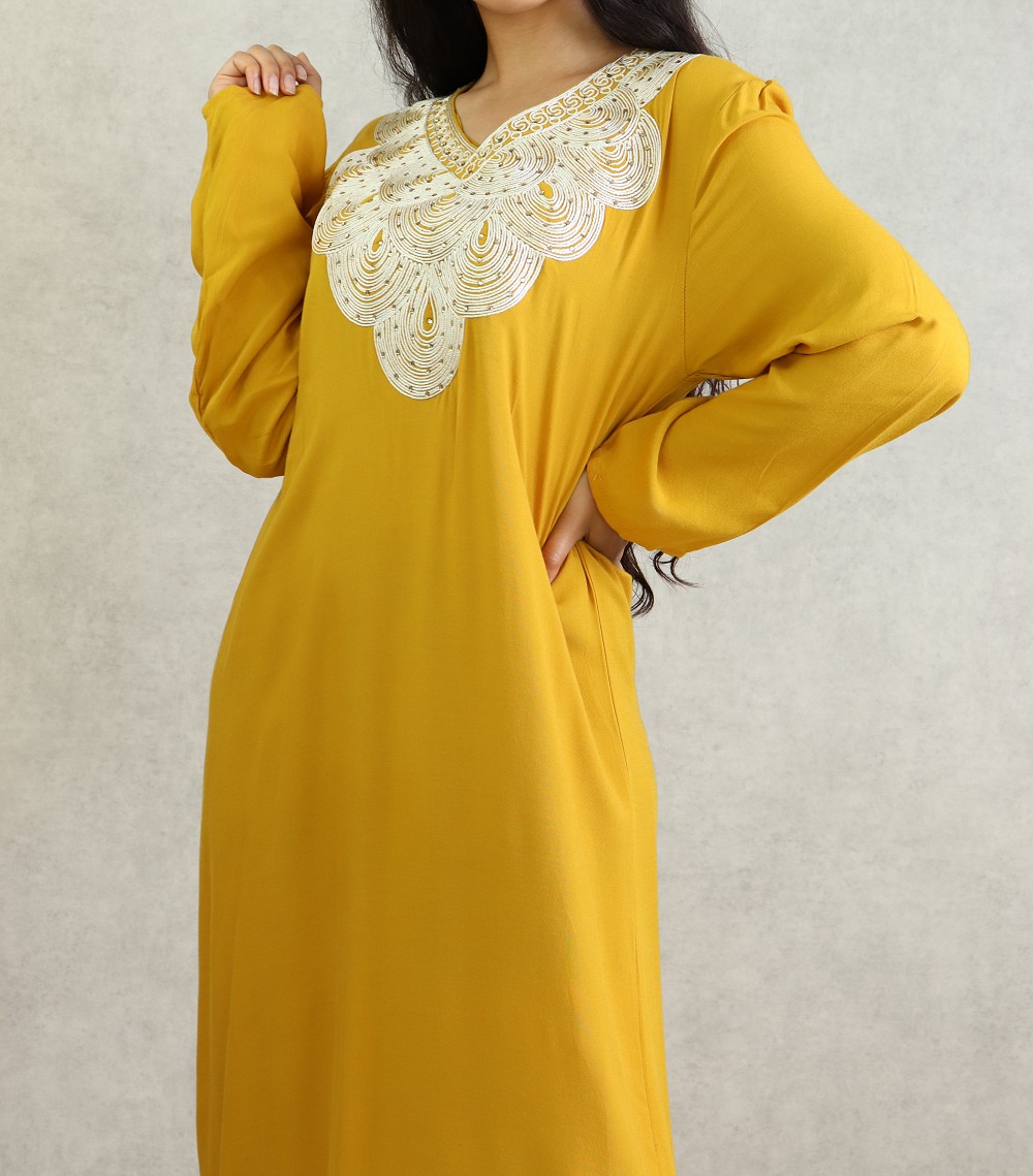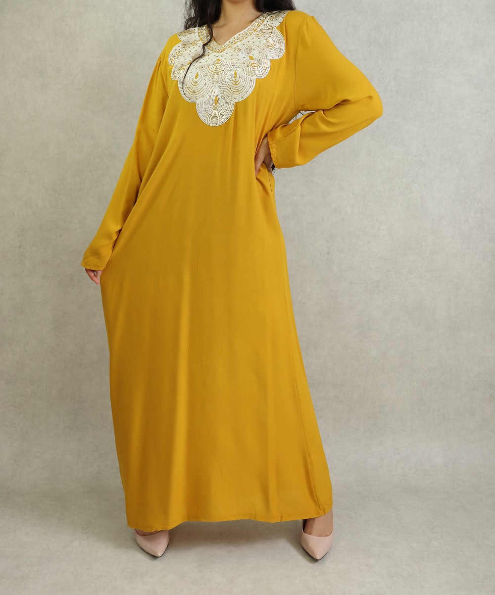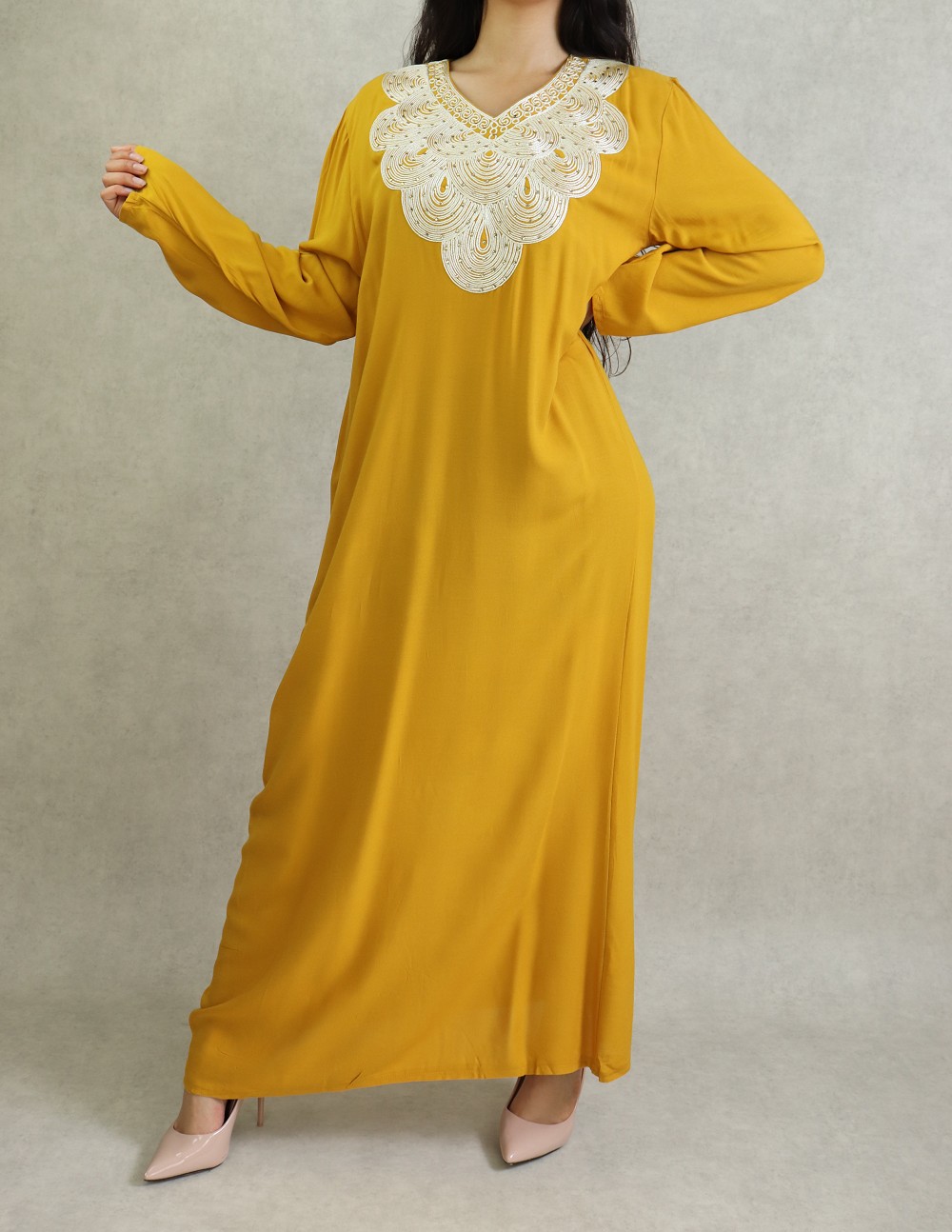 Robe orientale longue avec broderies - Manches longues - Couleur Jaune Moutarde Vetement & Accessoire