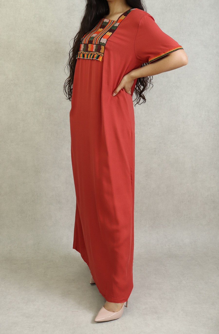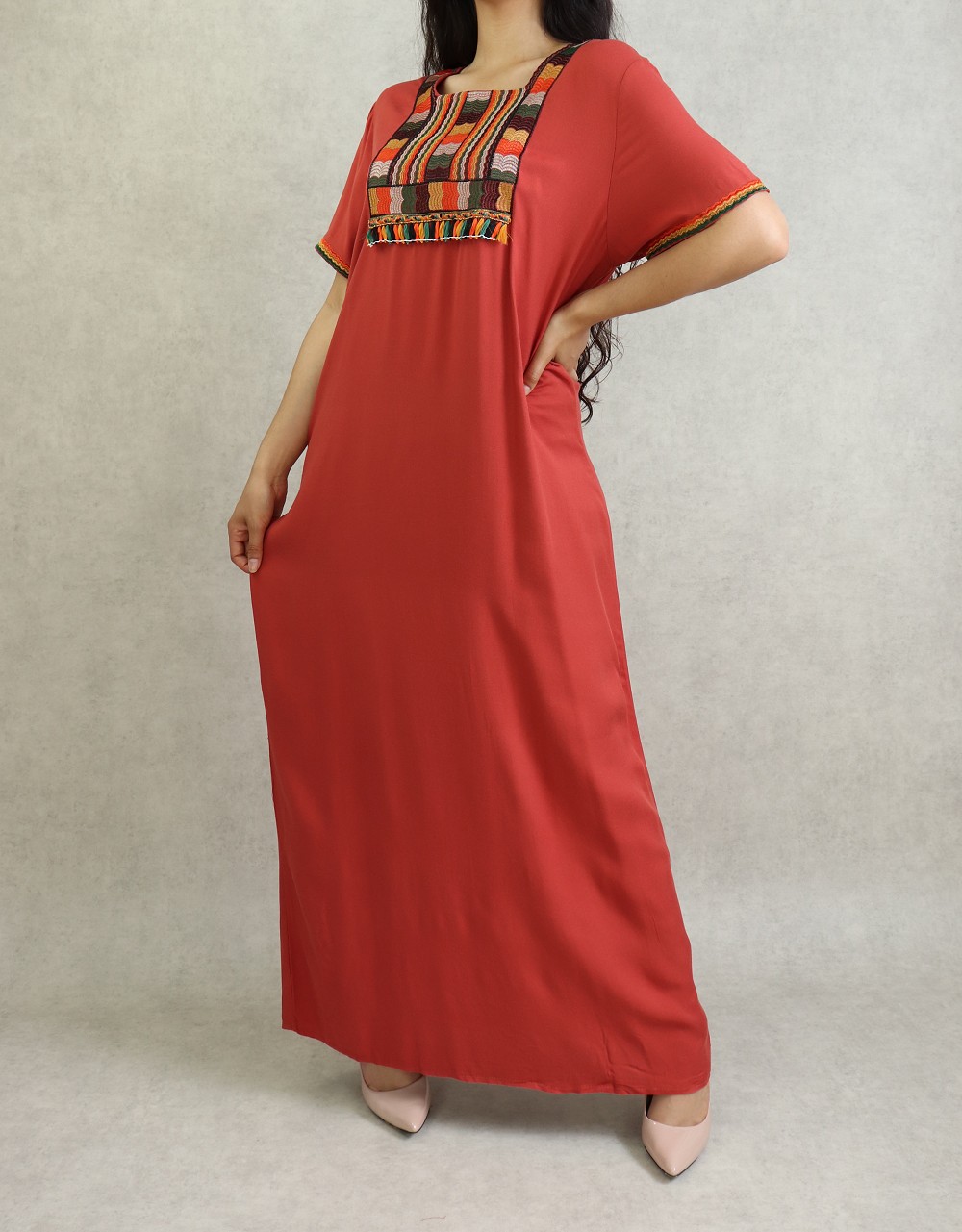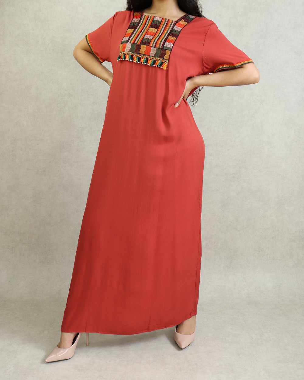 Robe longue manches courtes pour femme avec broderies originales, coupe droite, tissu fluide et doux au toucher coton.