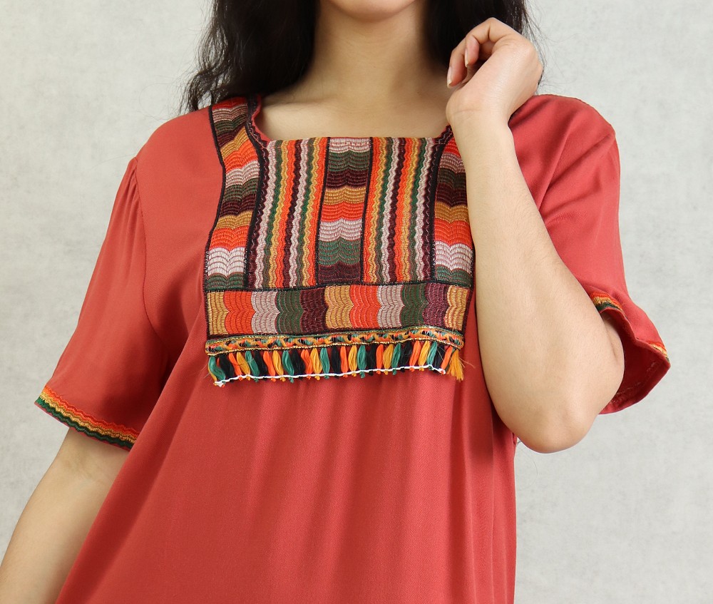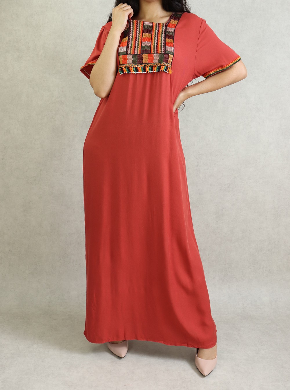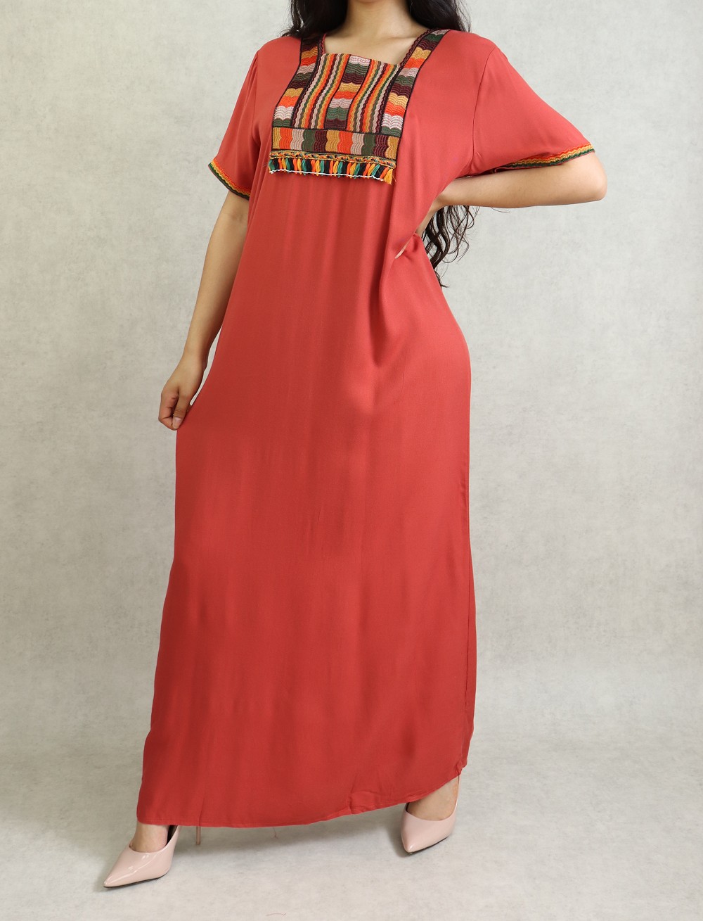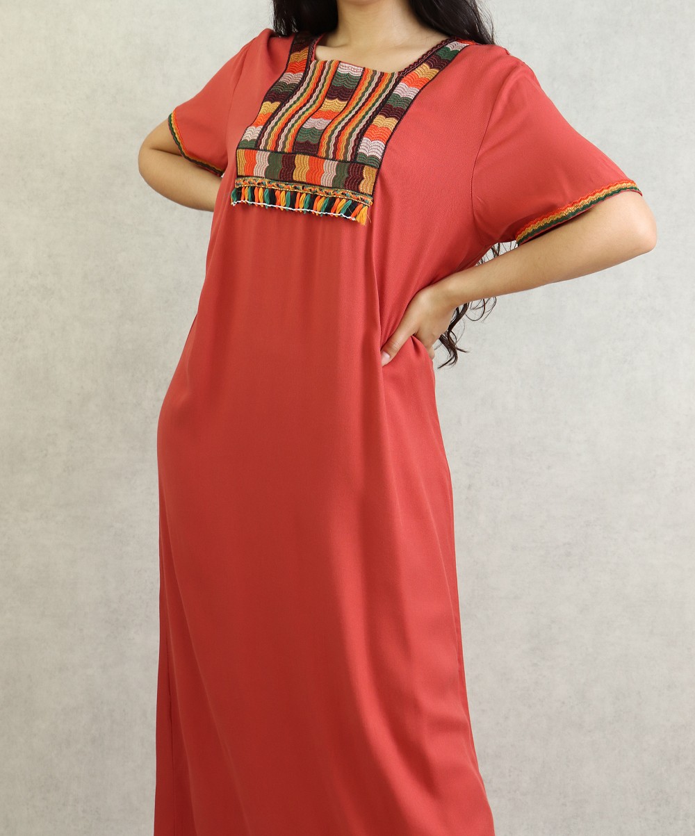 Robe longue manches courtes pour femme avec broderies originales, coupe droite, tissu fluide et doux au toucher coton.