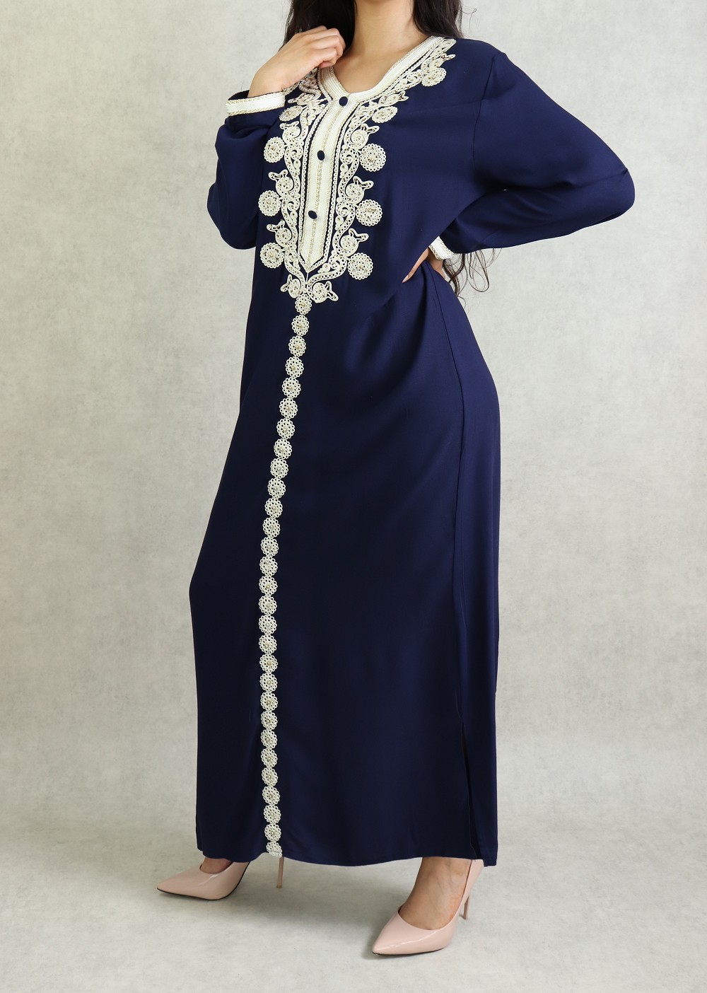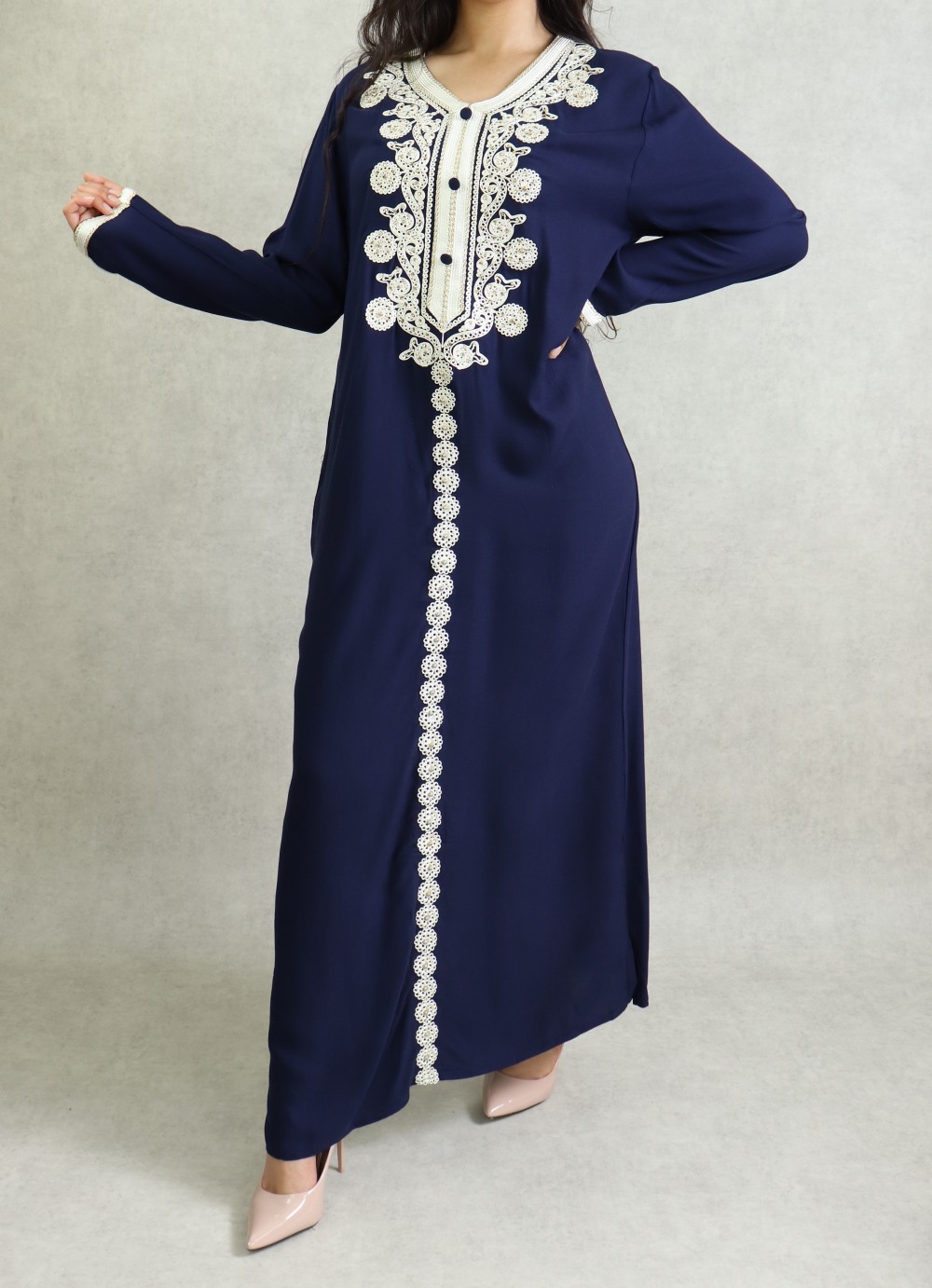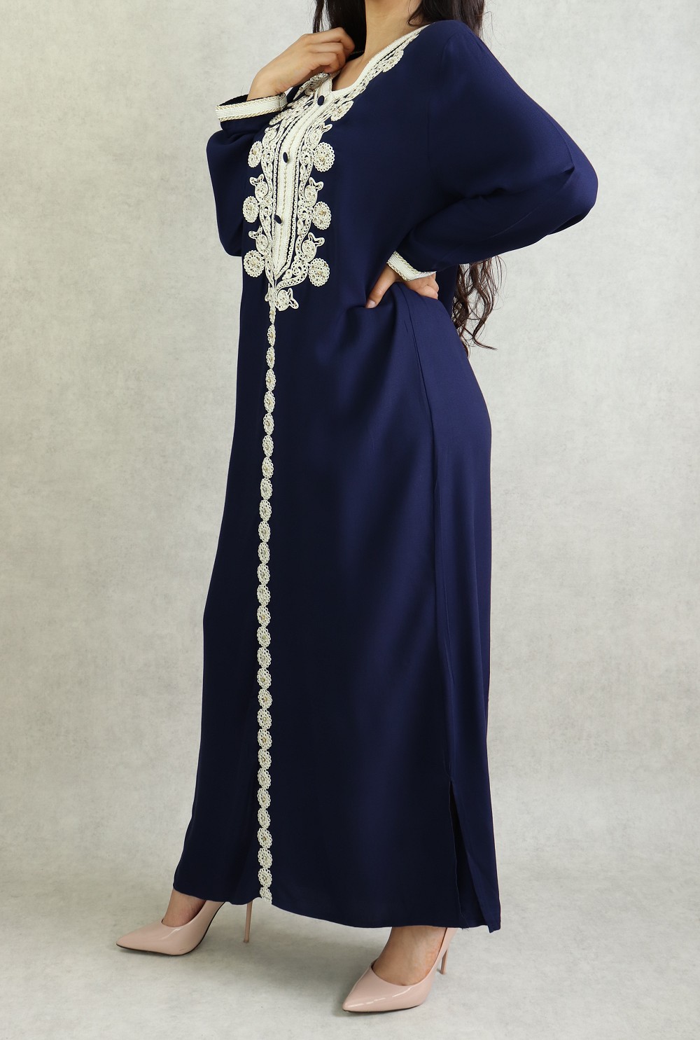 Robe orientale longue, style caftan algérien, avec broderie et strass sur toute la longueur. Le double avantage de ce modèle est d'être confortable et élégant à la fois.