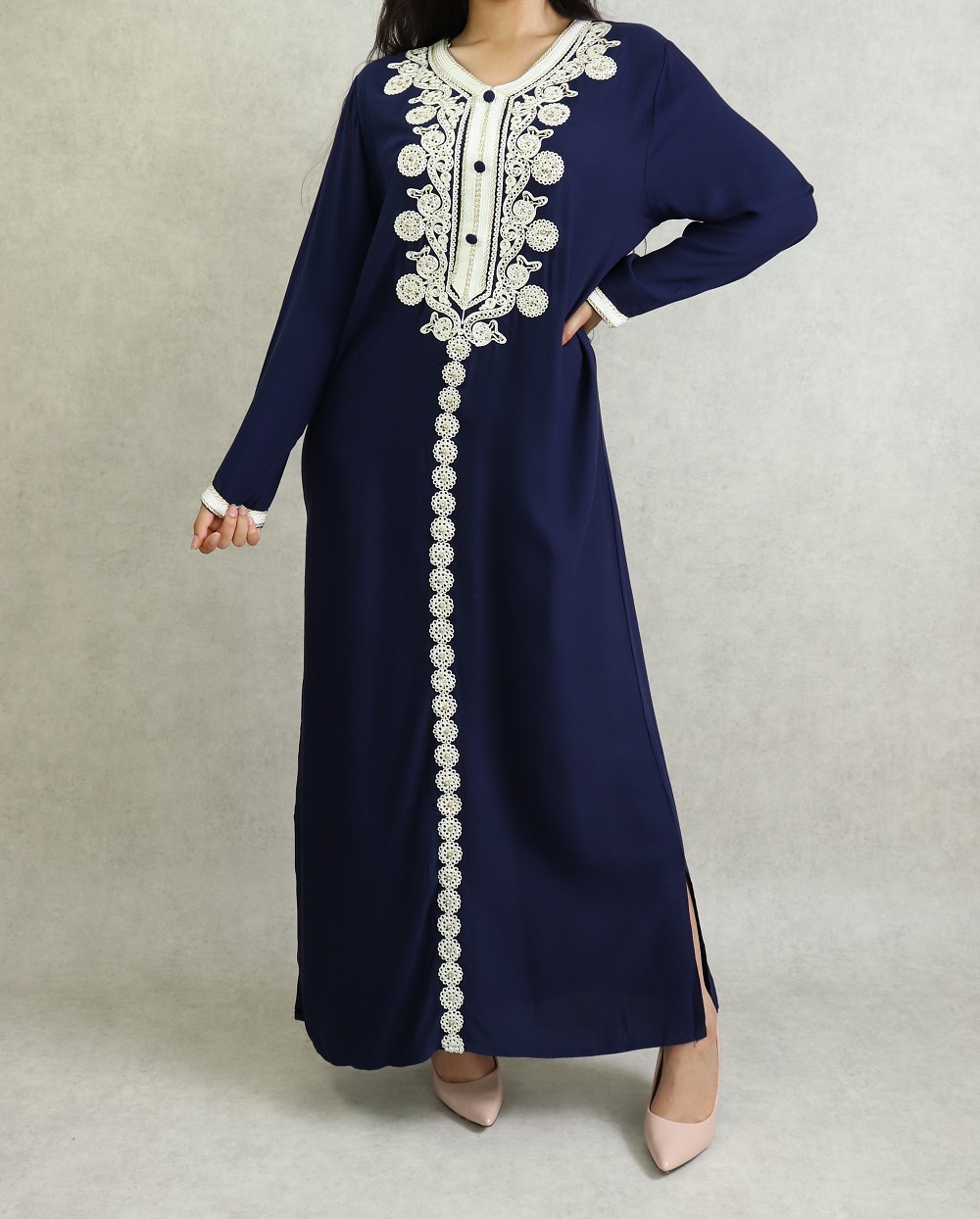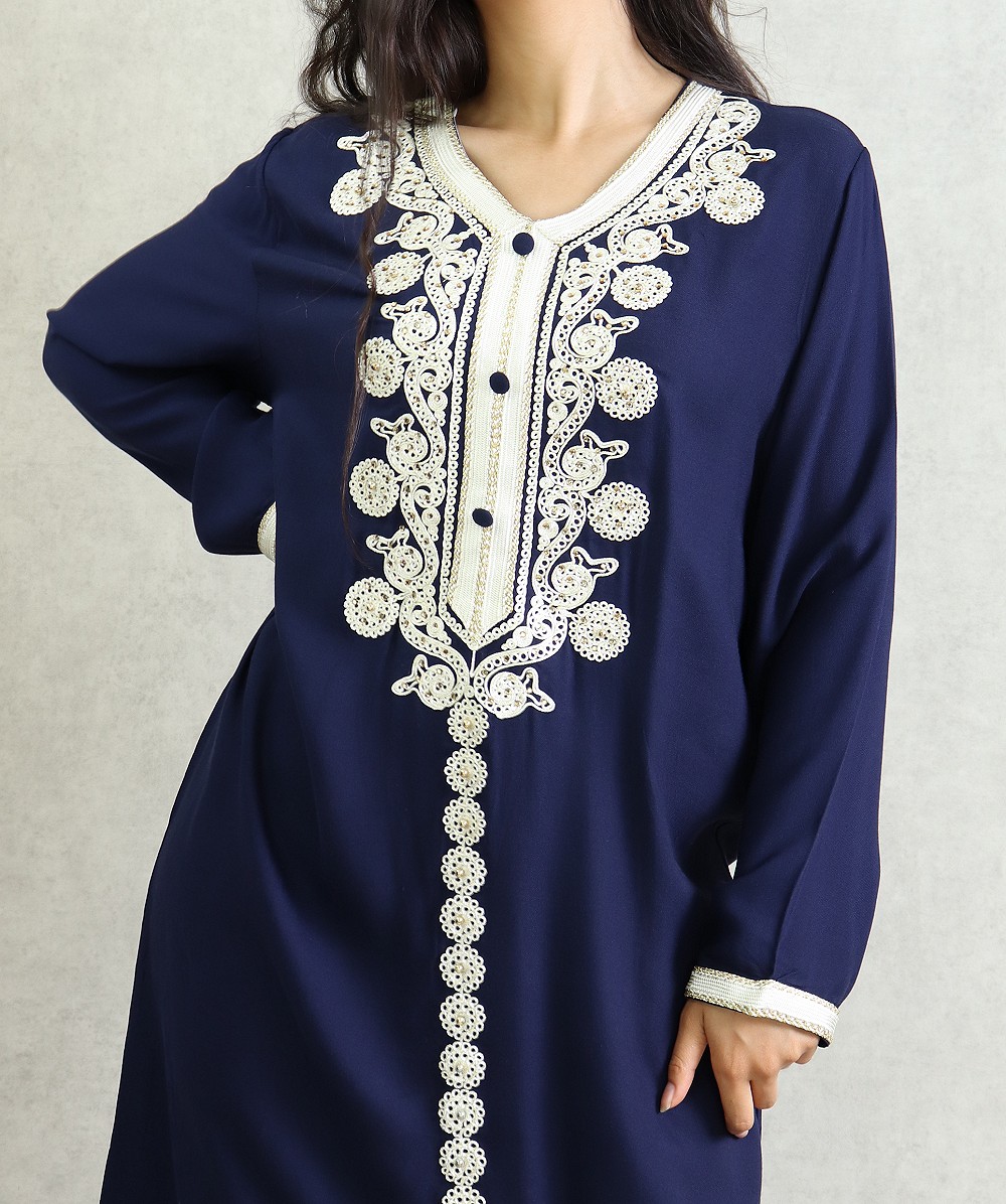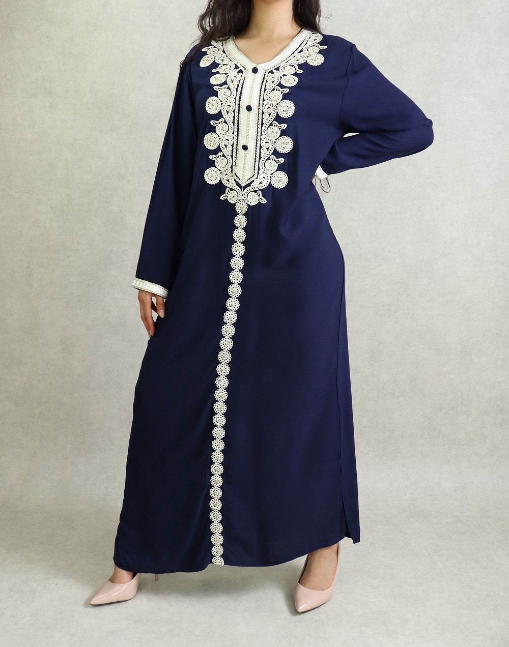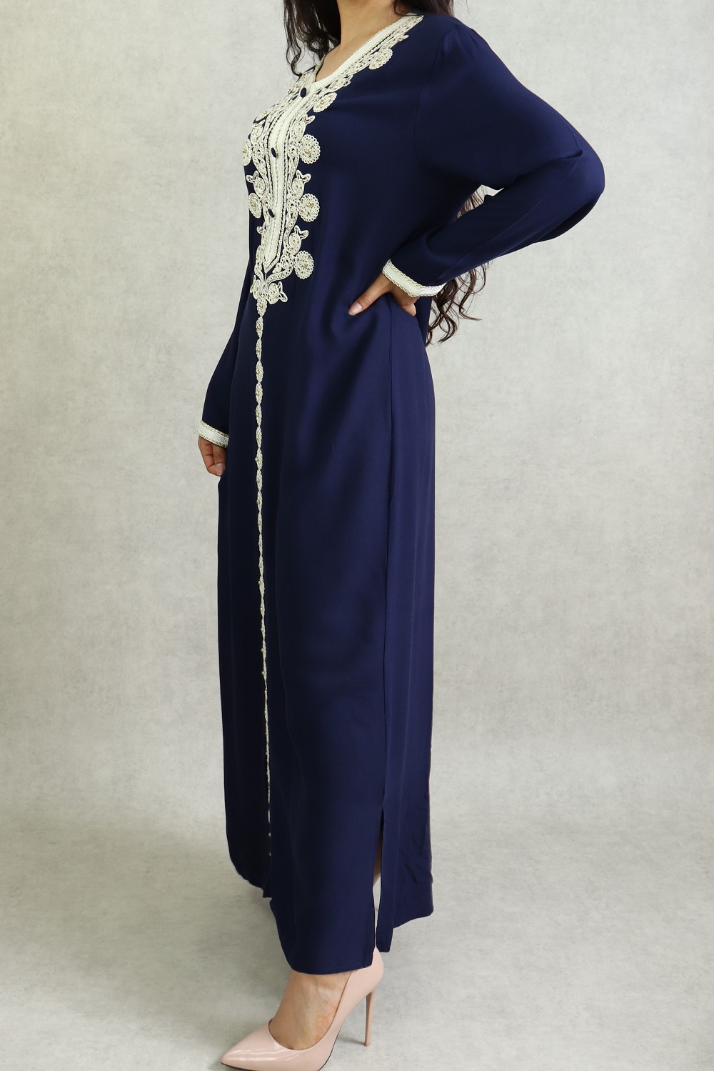 Robe orientale longue, style caftan algérien, avec broderie et strass sur toute la longueur. Le double avantage de ce modèle est d'être confortable et élégant à la fois.