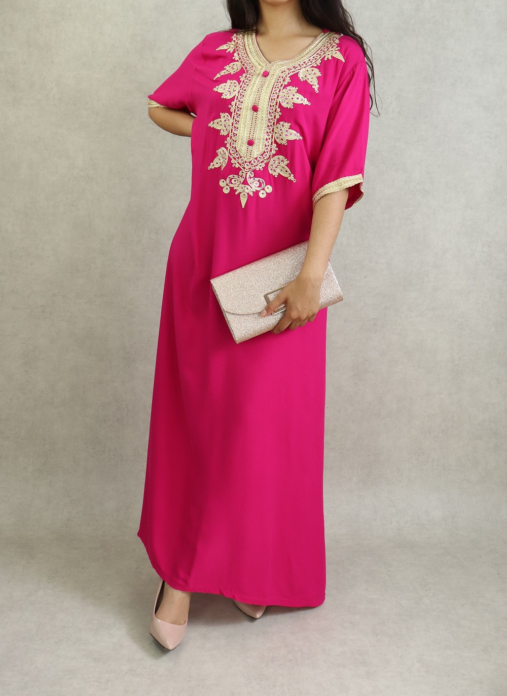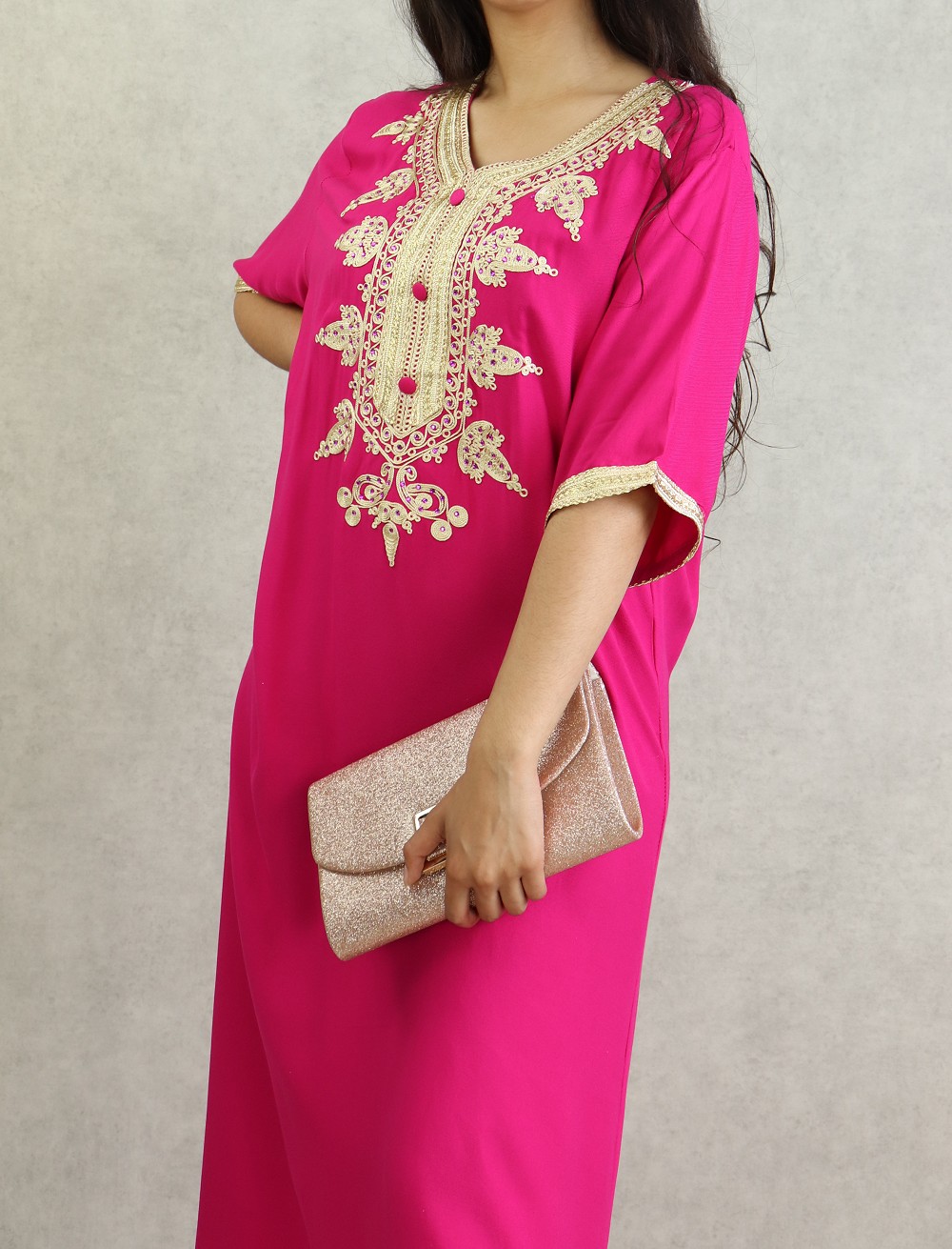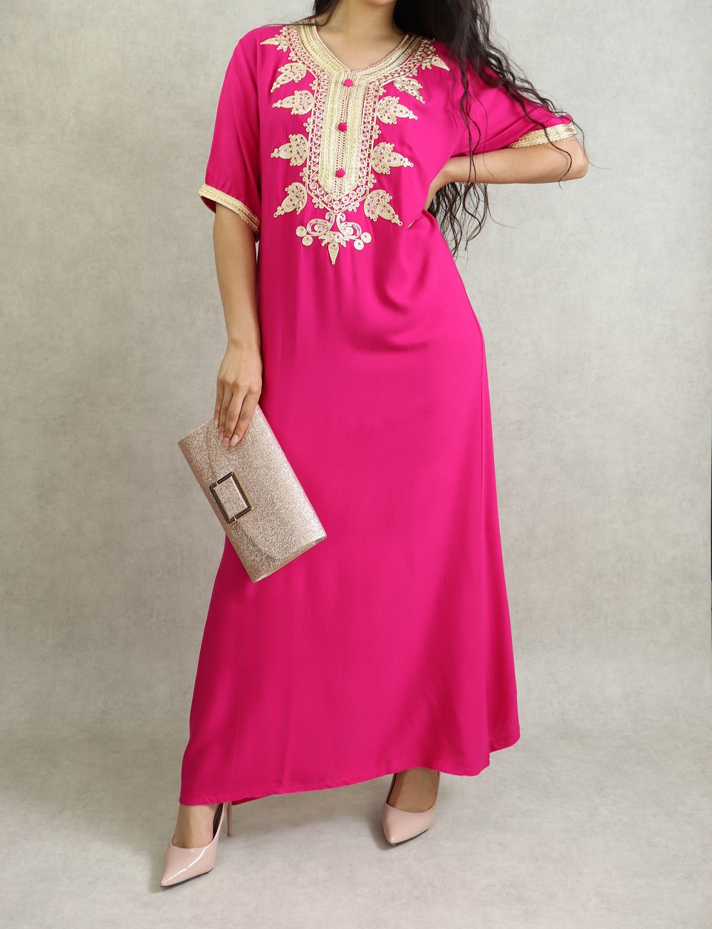 Robe Orientale Algerienne manches courtes avec broderies dorees et strasses - Couleur Fuchsia
