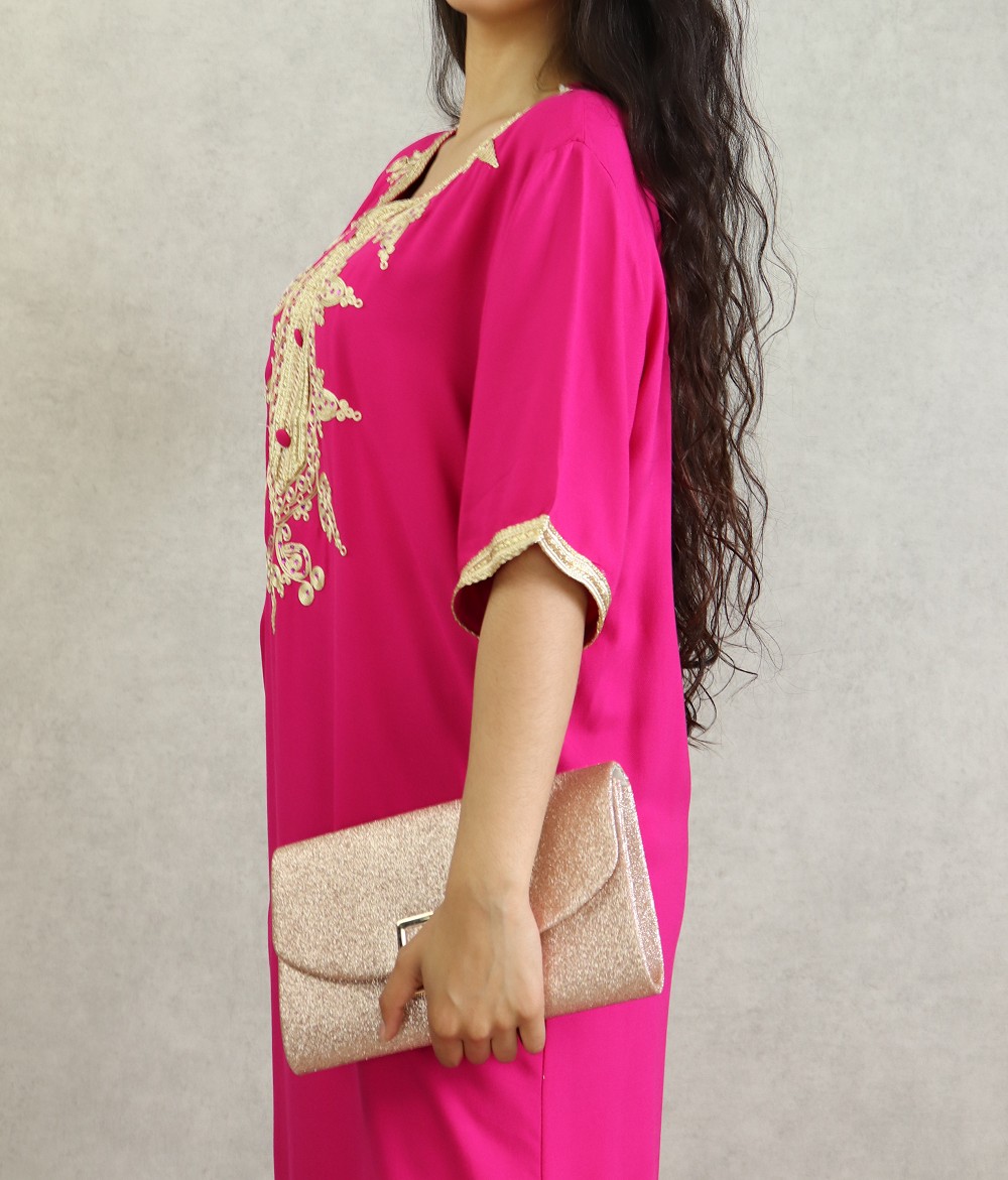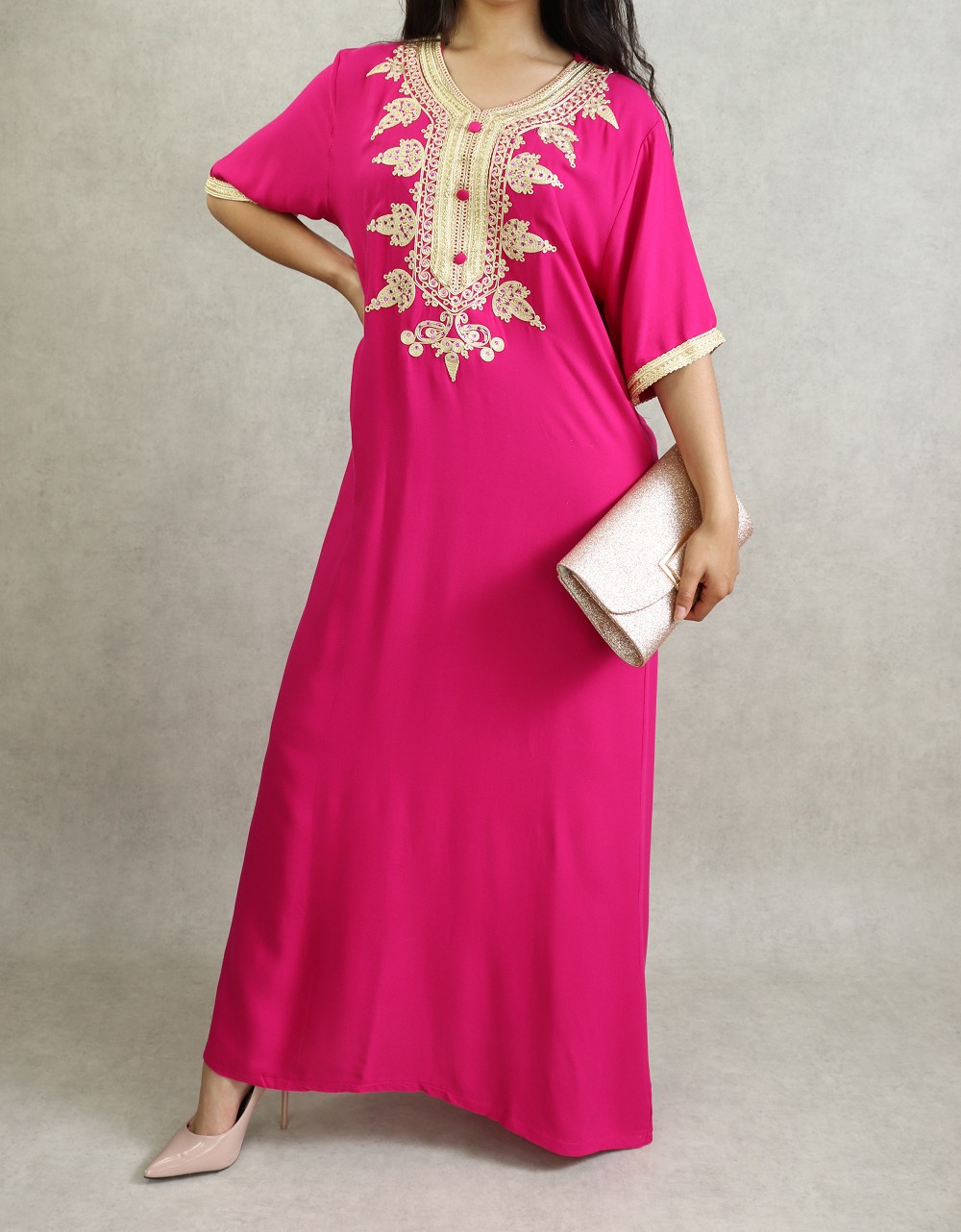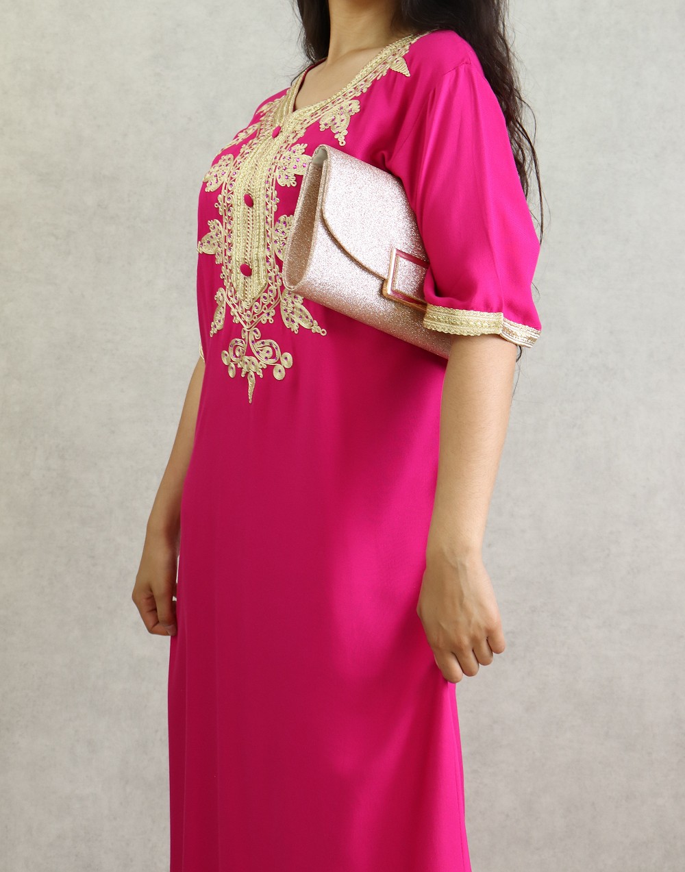 Robe Orientale Algerienne manches courtes avec broderies dorees et strasses - Couleur Fuchsia