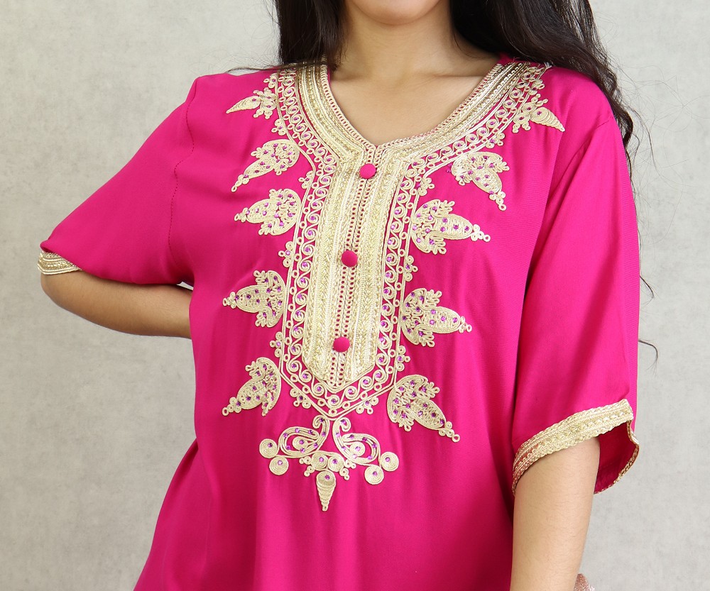 Robe Orientale Algérienne manches courtes avec broderies dorées et strasses - Couleur Fuchsia Vetement & Accessoire