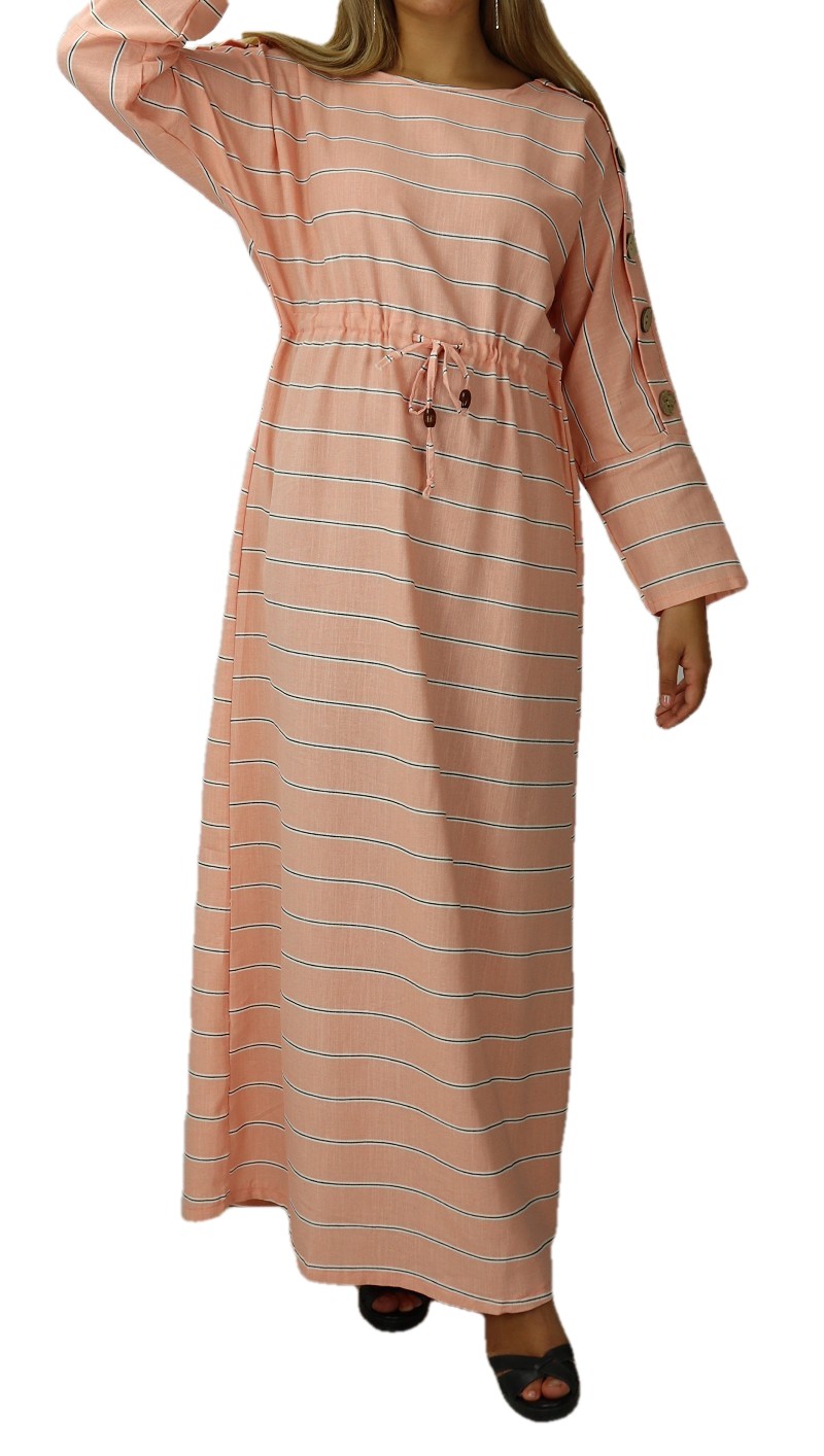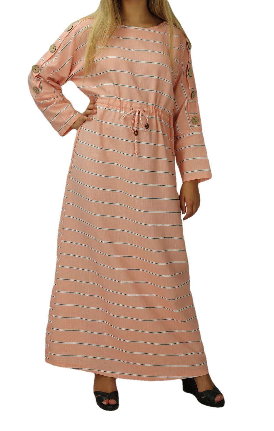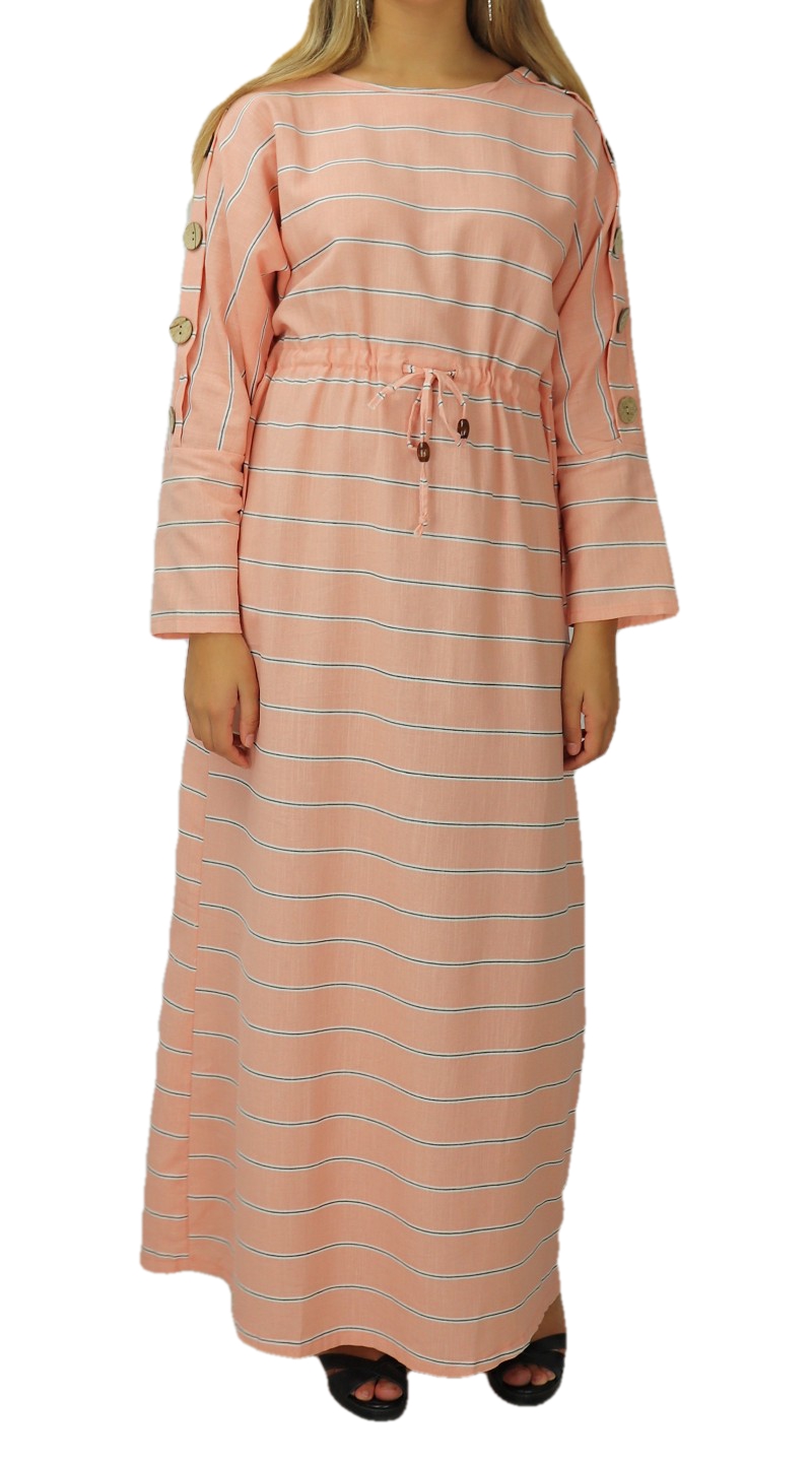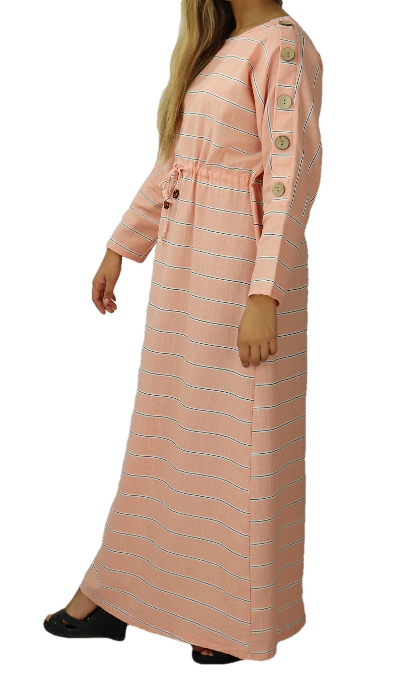 Robe longue en coton pour femme à rayures décorée de boutons - Couleur rose saumon Vetement & Accessoire