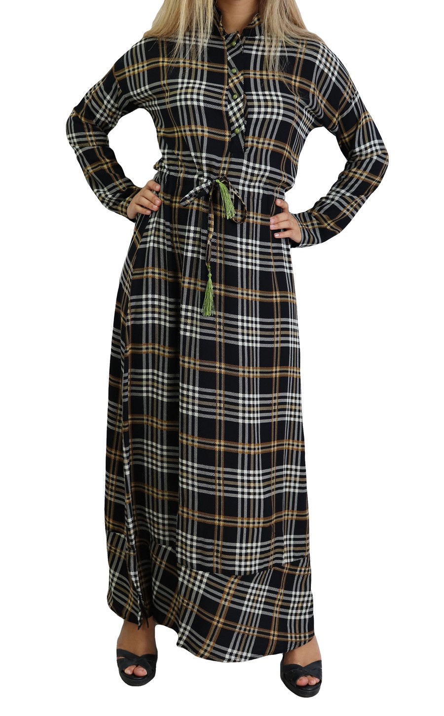 Robe longue a carreaux mi-saison en coton pour femme