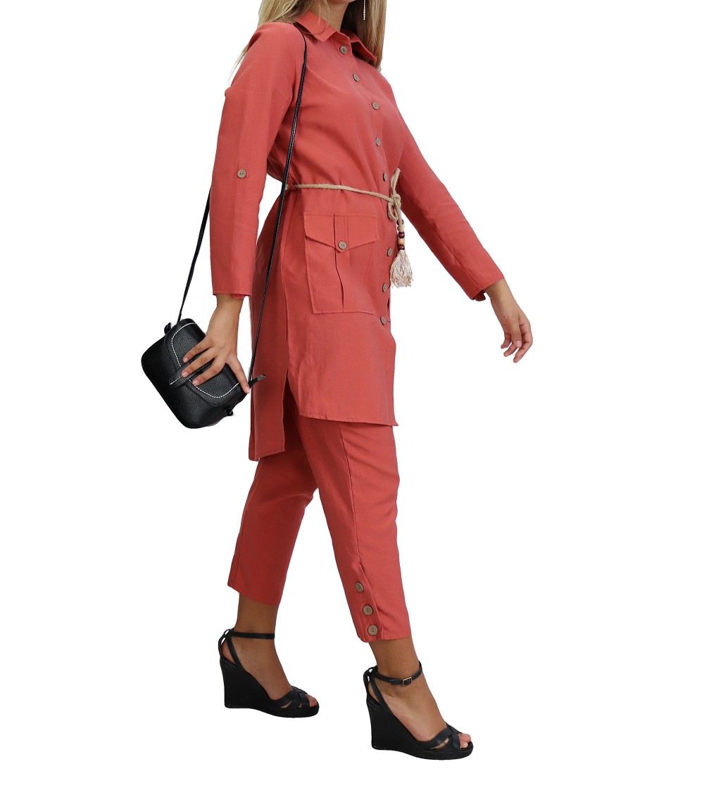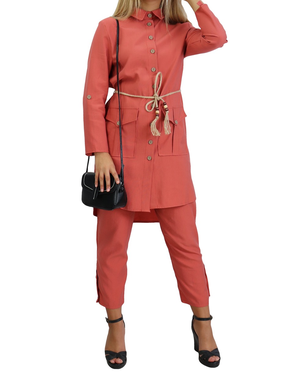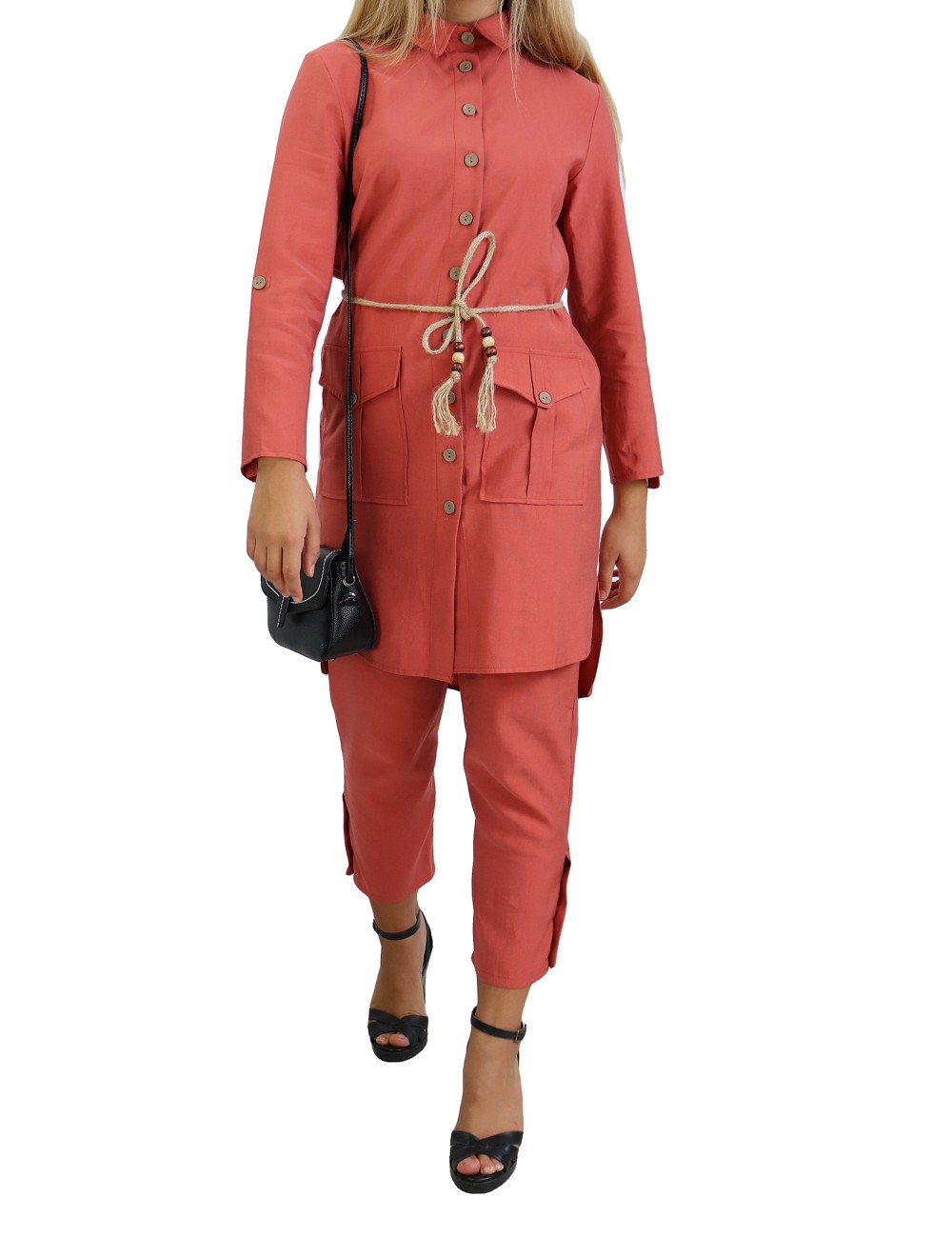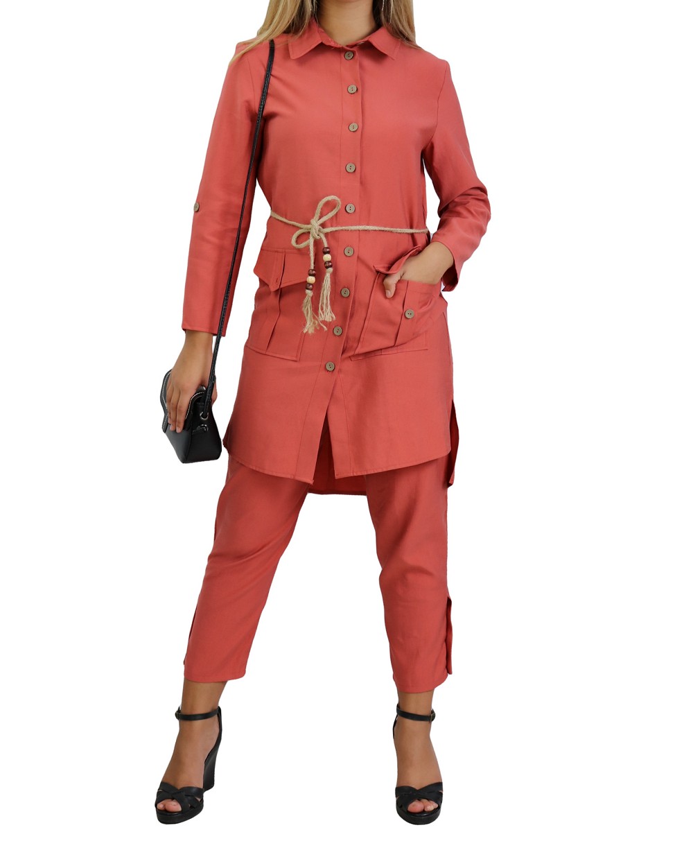 Ensemble 2 pièces. Veste : mi longue, col chemise, fermeture boutons, manches ajustables, ceinture tressée ornée de perles en bois, 2 poches plaquées à rabats. Pantalon : coupe droite, fermeture à glissière, boutons sur le bas. Tissu léger et opaque, effet tissé.