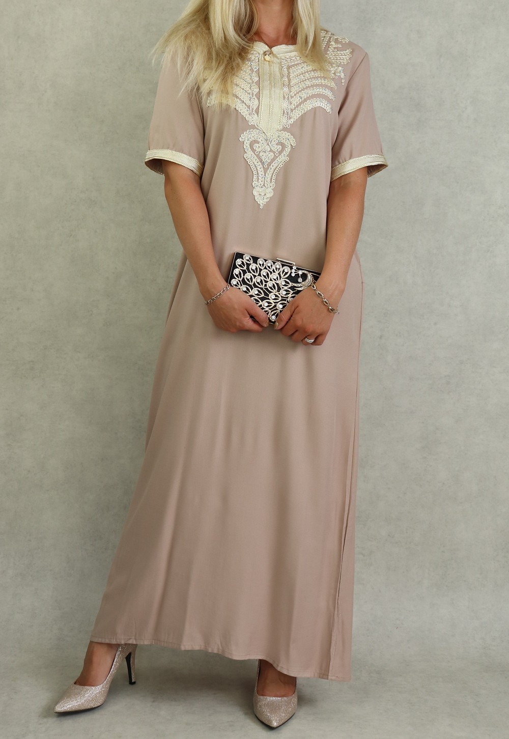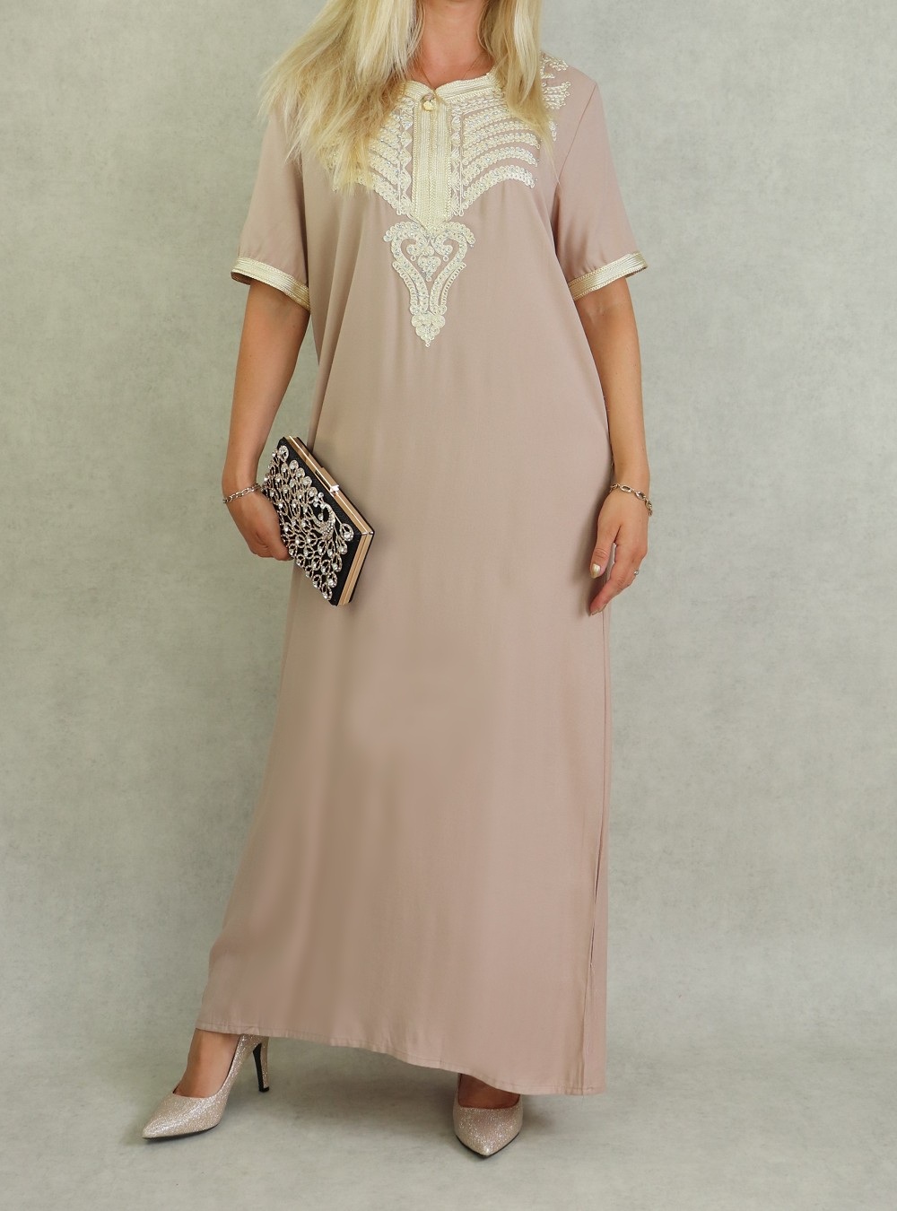 Cette robe orientale à manches courtes, encolure en cœur, tissu doux et léger type coton, vous donnera une allure incroyable.