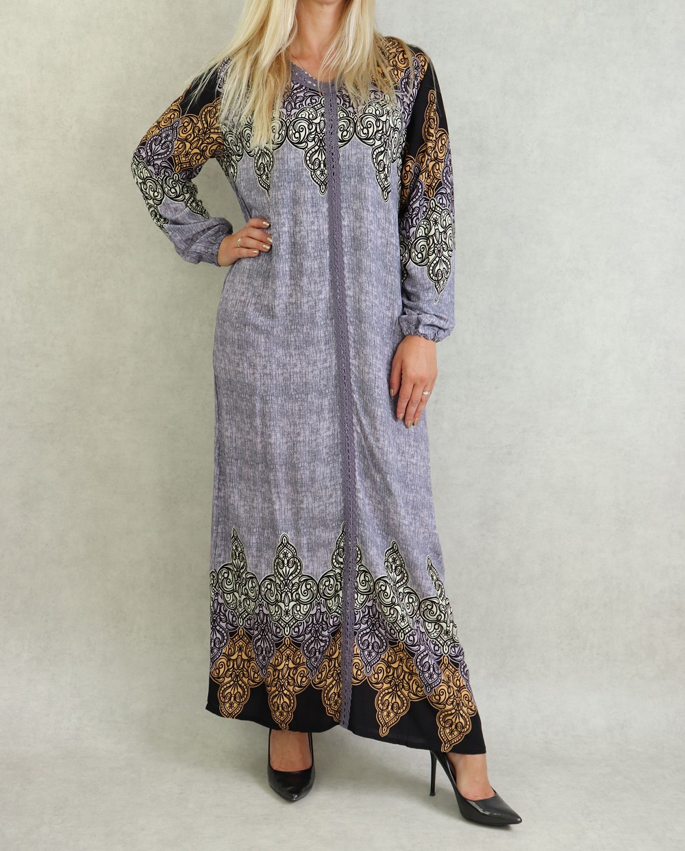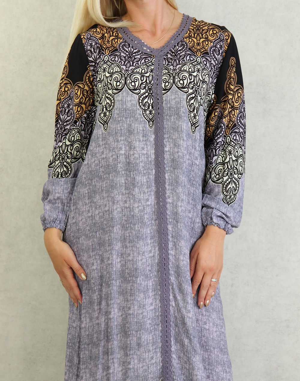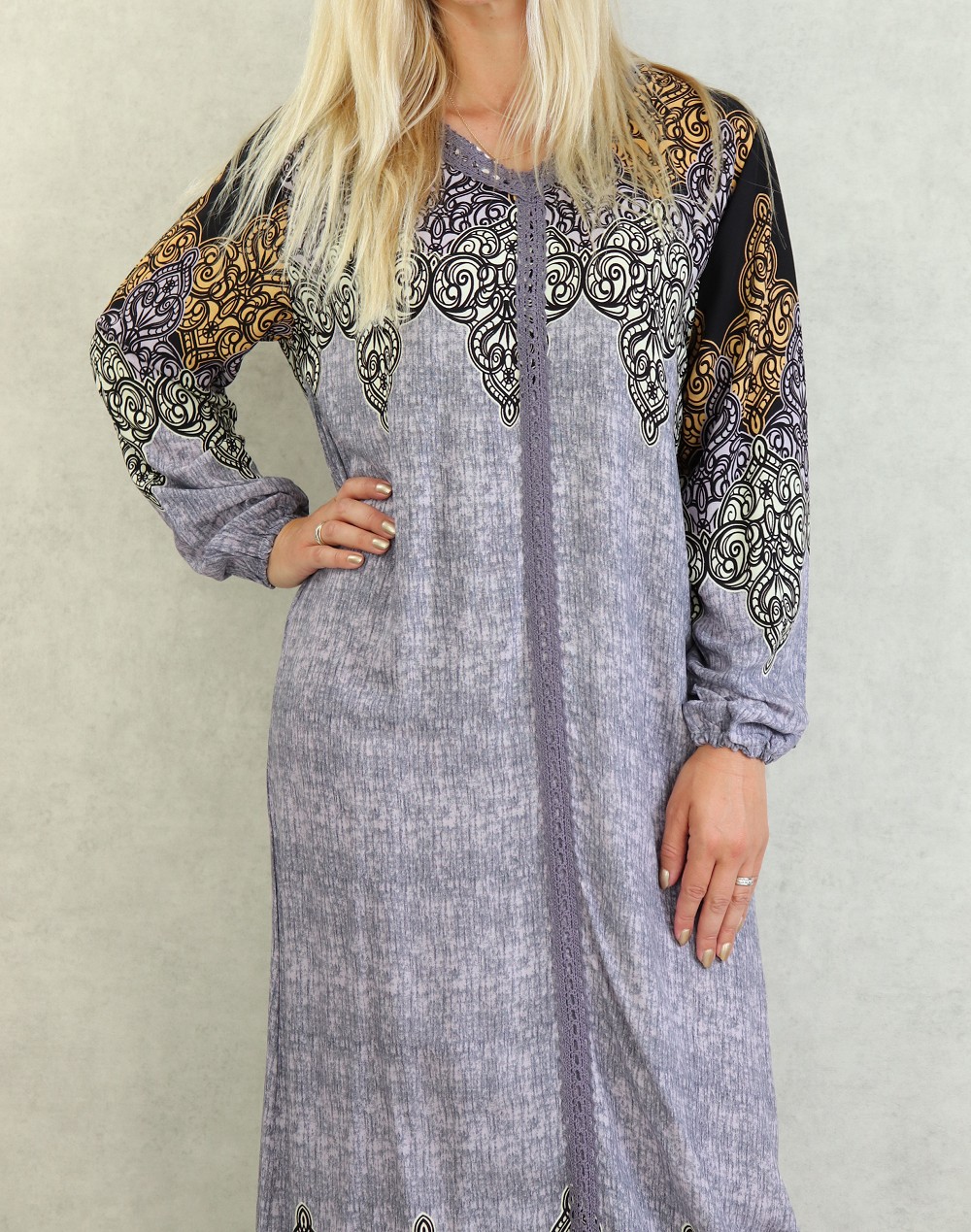 Longue robe imprimée avec motifs d'été, manches longues élastique aux poignets, col en V avec dentelles ainsi que sur toute la longueur devant, non transparente. Coupe droite, tissu léger et fluide.