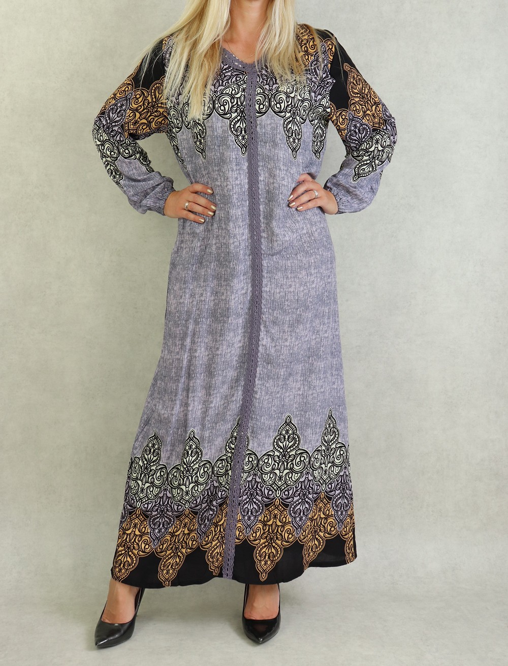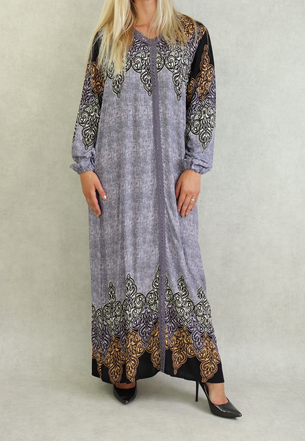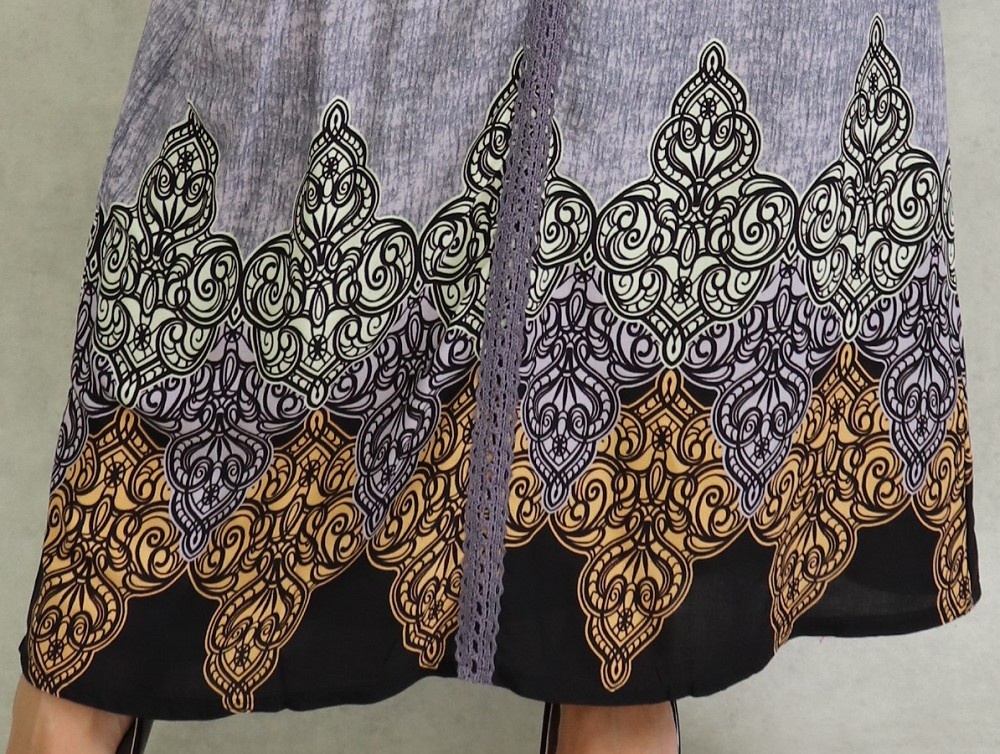 Longue robe imprimée avec motifs d'été, manches longues élastique aux poignets, col en V avec dentelles ainsi que sur toute la longueur devant, non transparente. Coupe droite, tissu léger et fluide.