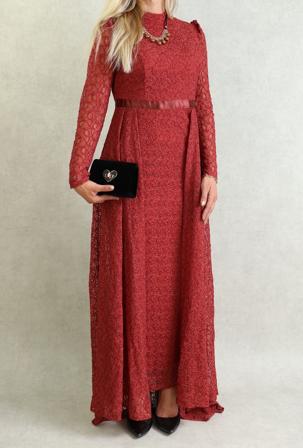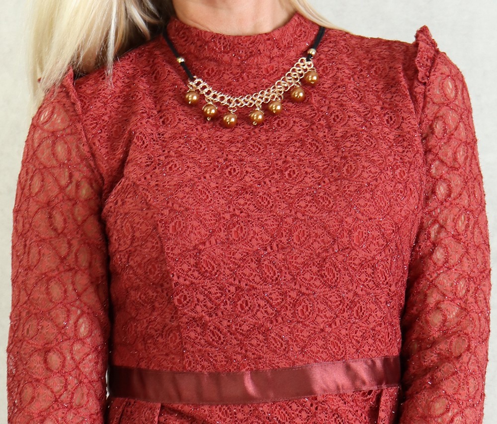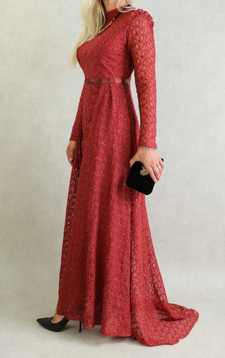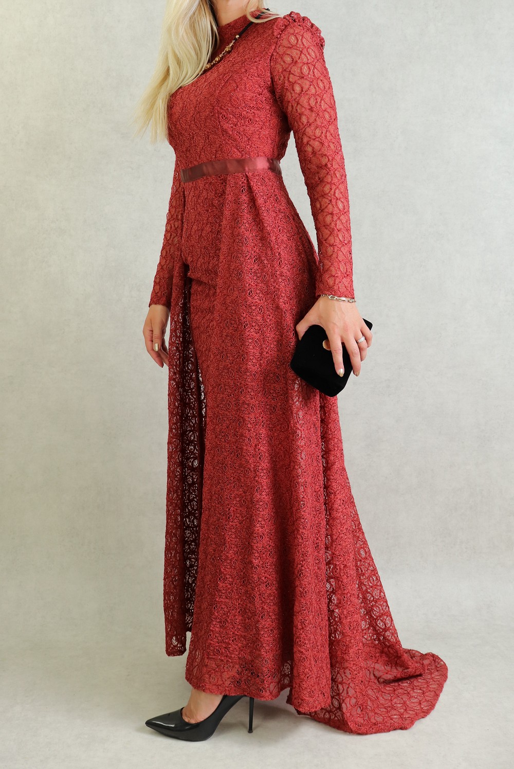 La beauté de cette robe se porte sur les détails, un modèle tout en dentelle, une ceinture satinée pour définir les courbes et une traine à l’arrière qui allonge la silhouette et un collier assorti.
