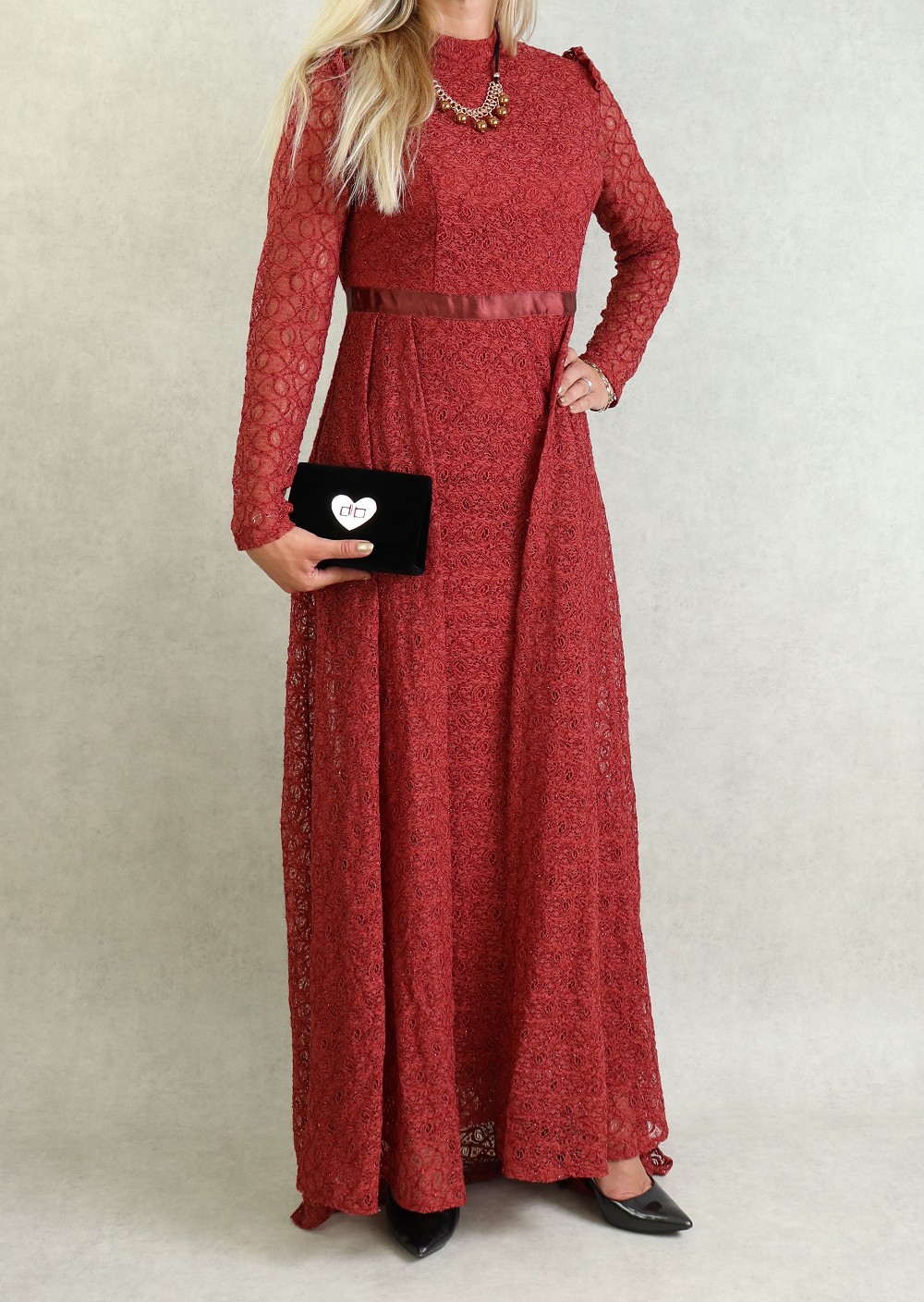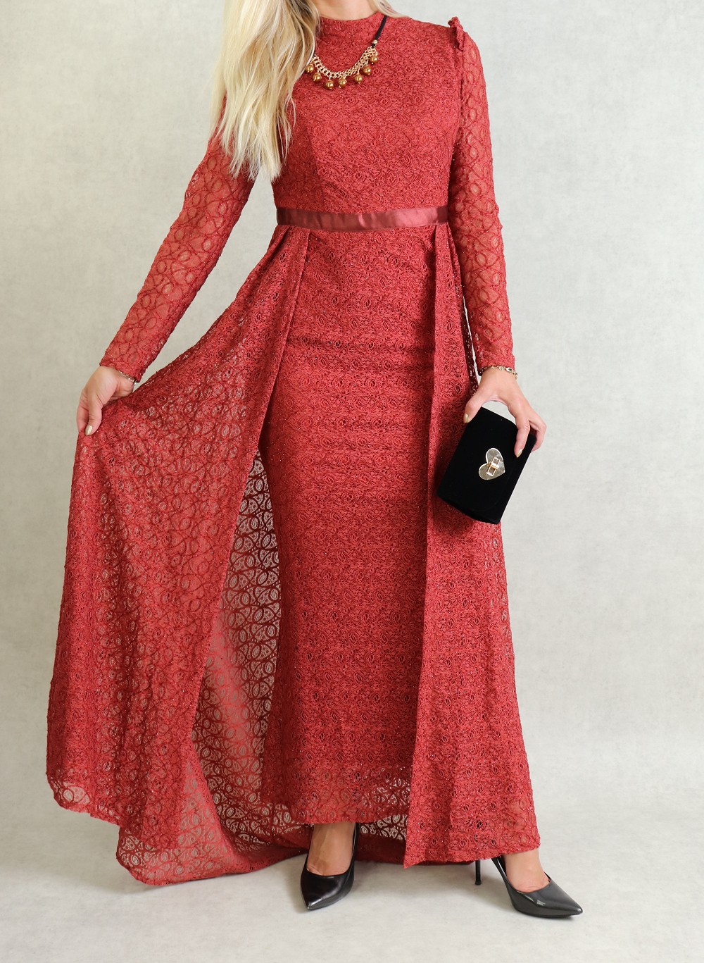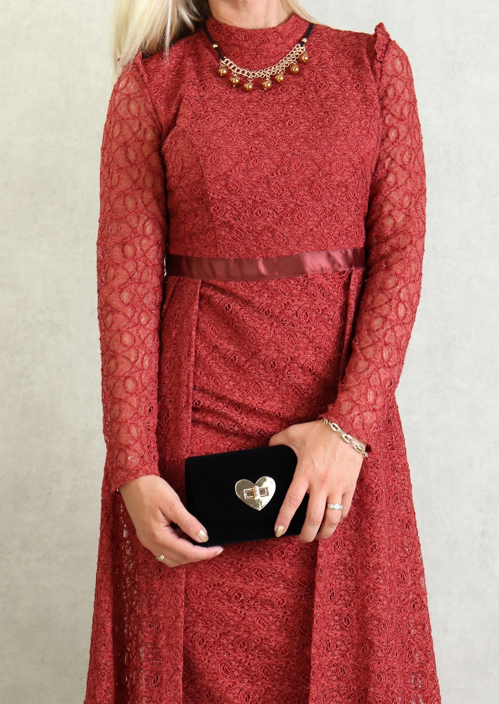 La beauté de cette robe se porte sur les détails, un modèle tout en dentelle, une ceinture satinée pour définir les courbes et une traine à l’arrière qui allonge la silhouette et un collier assorti.