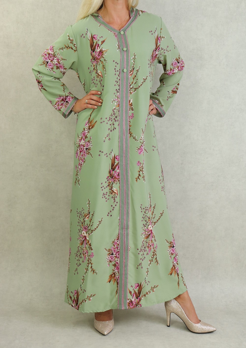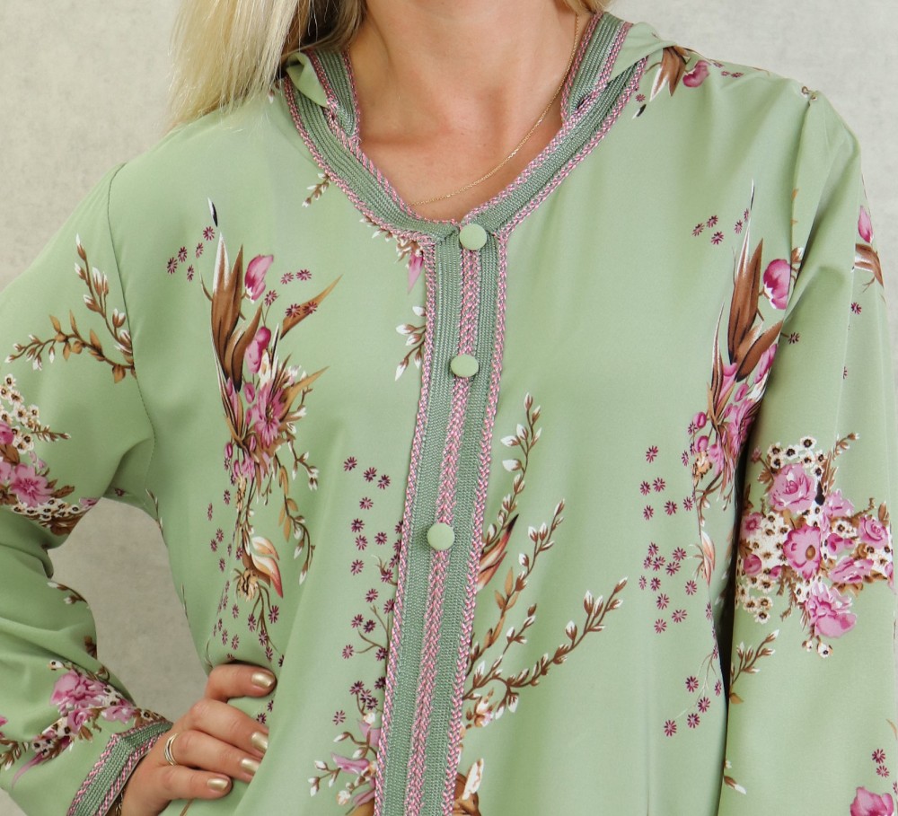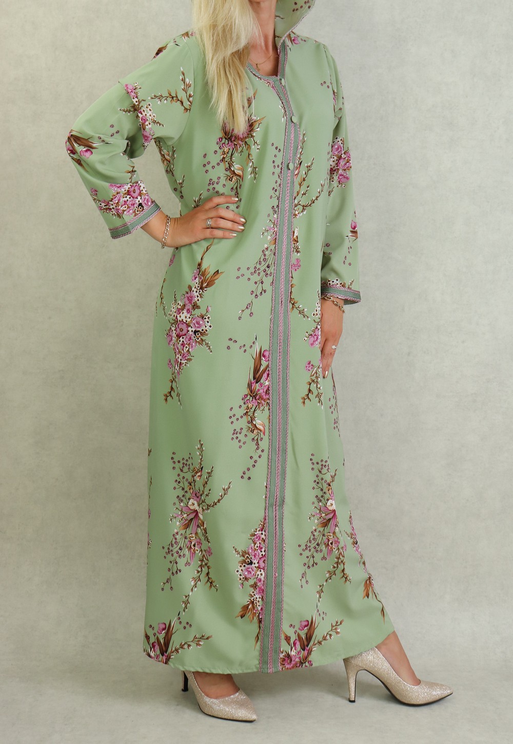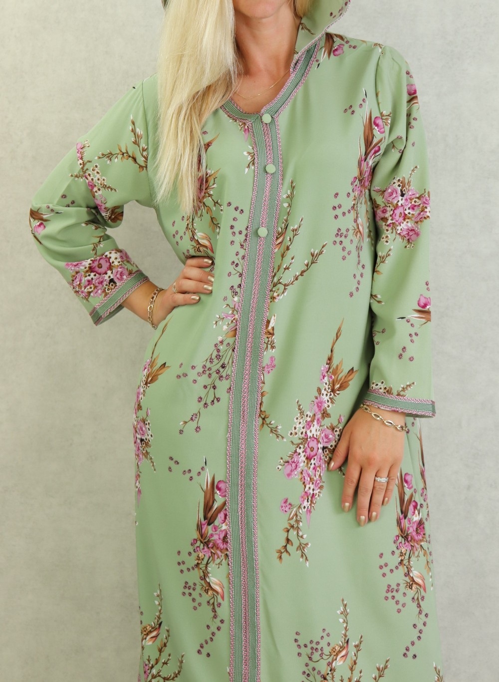 Robe fluide style djellaba marocaine fleurie avec capuche sur un fond vert amande pour femme