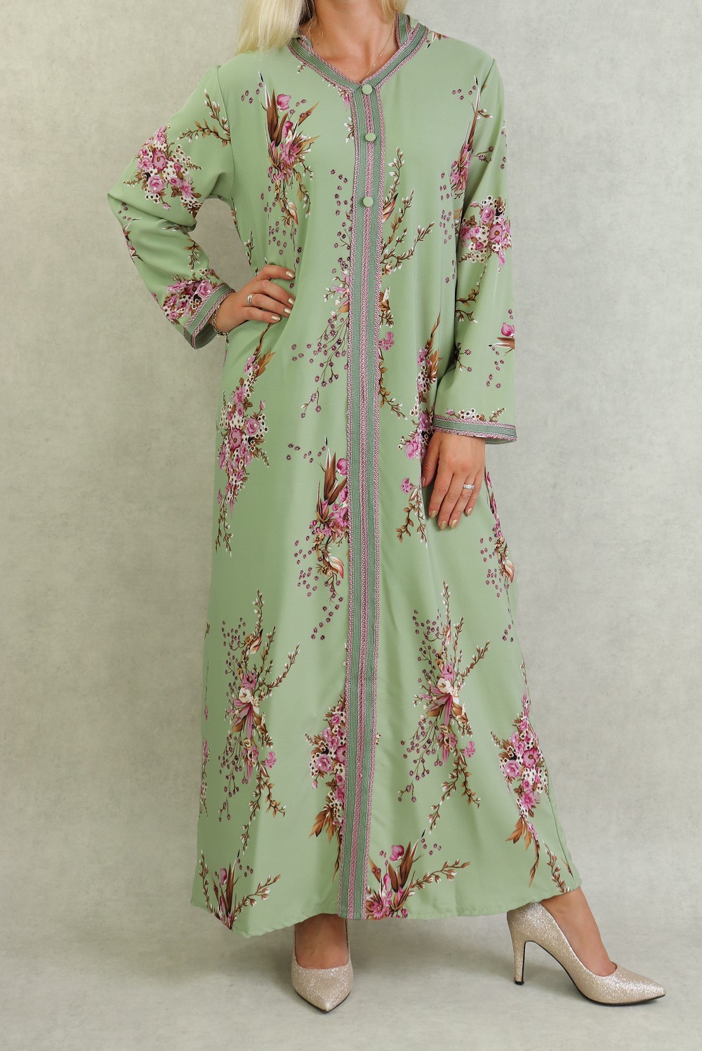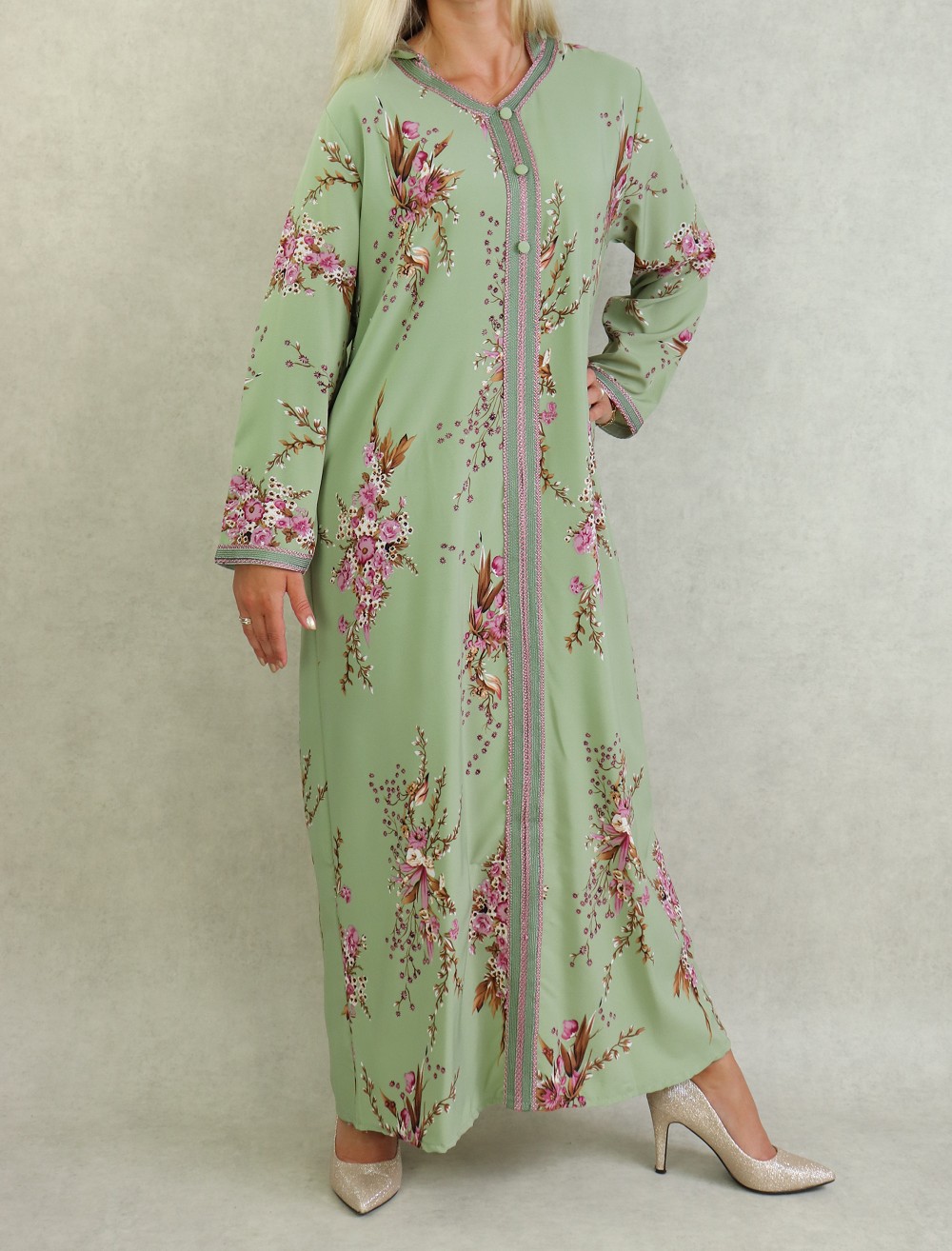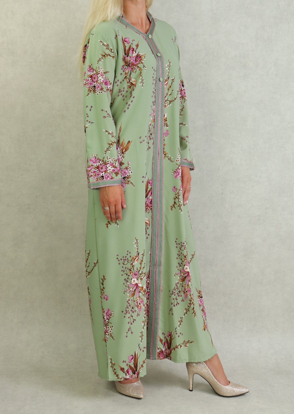 Très jolie robe fluide style djellaba décorée de motifs fleuris sur fond vert amande, avec sa capuche.