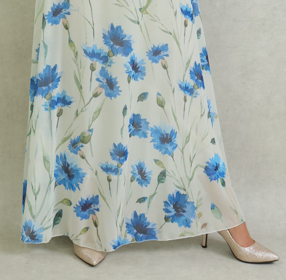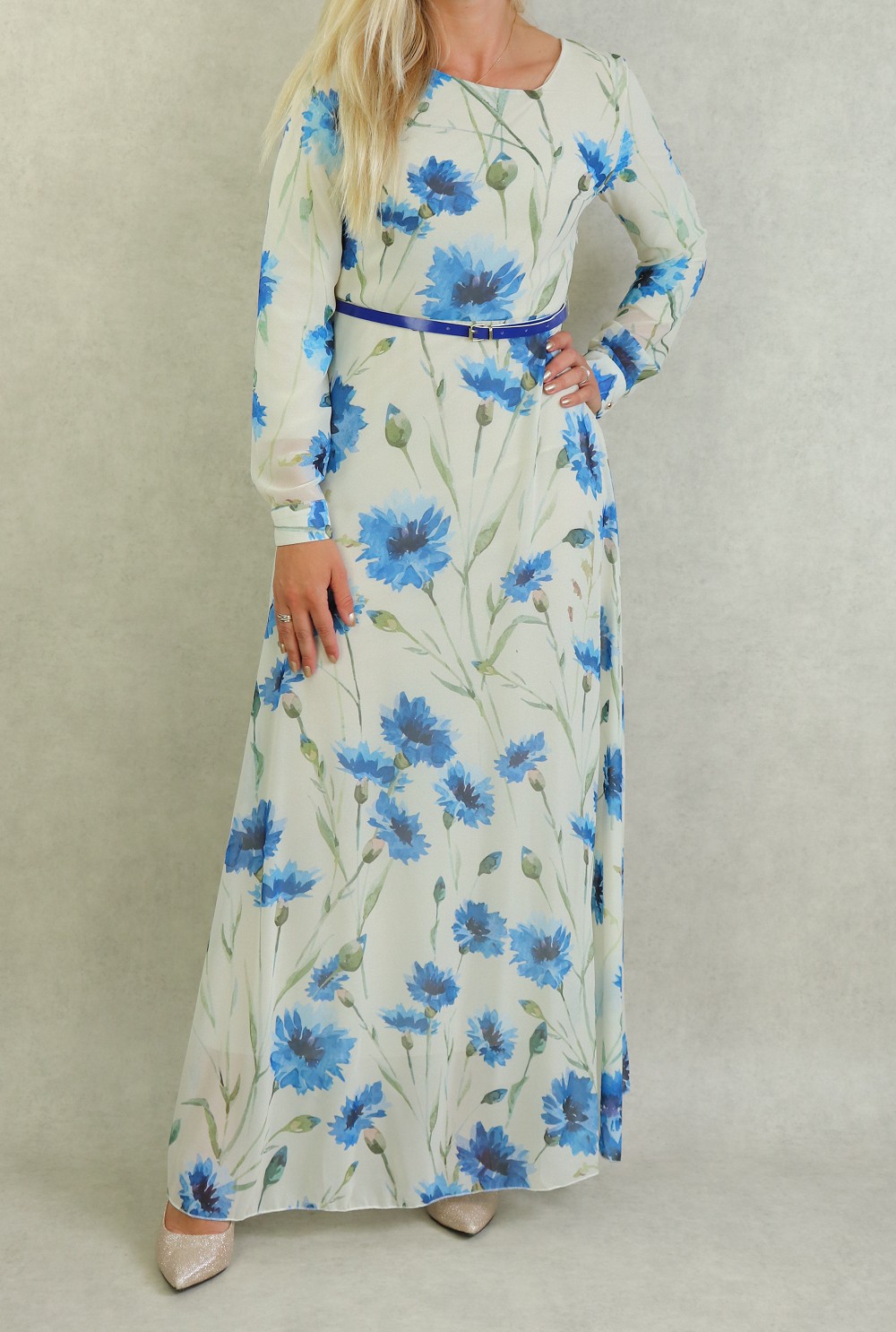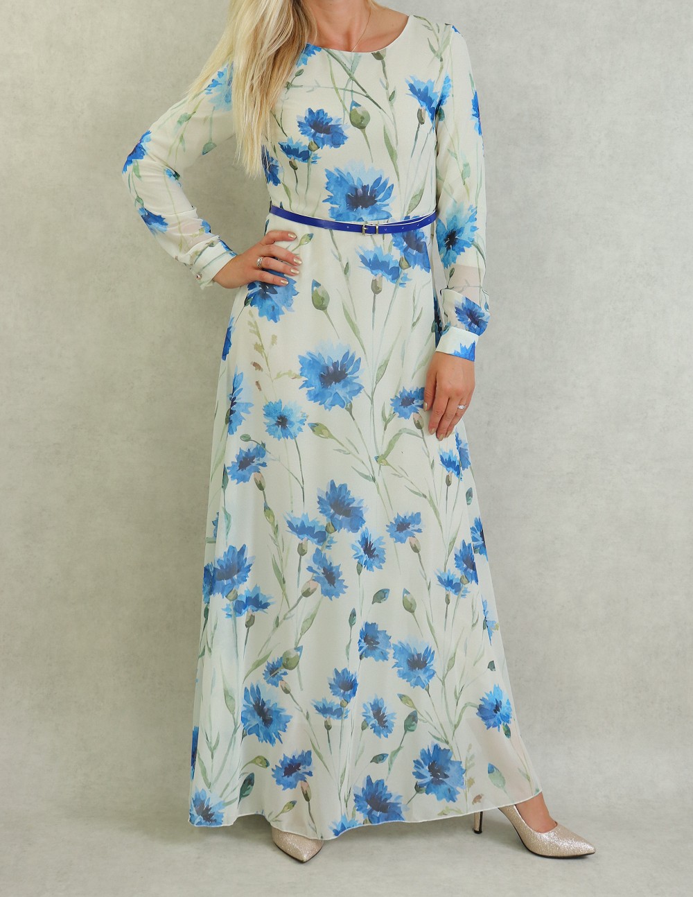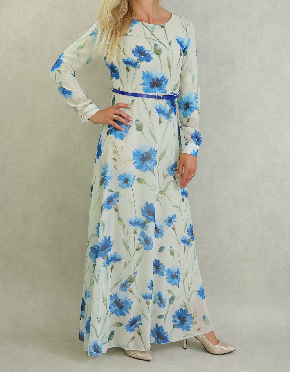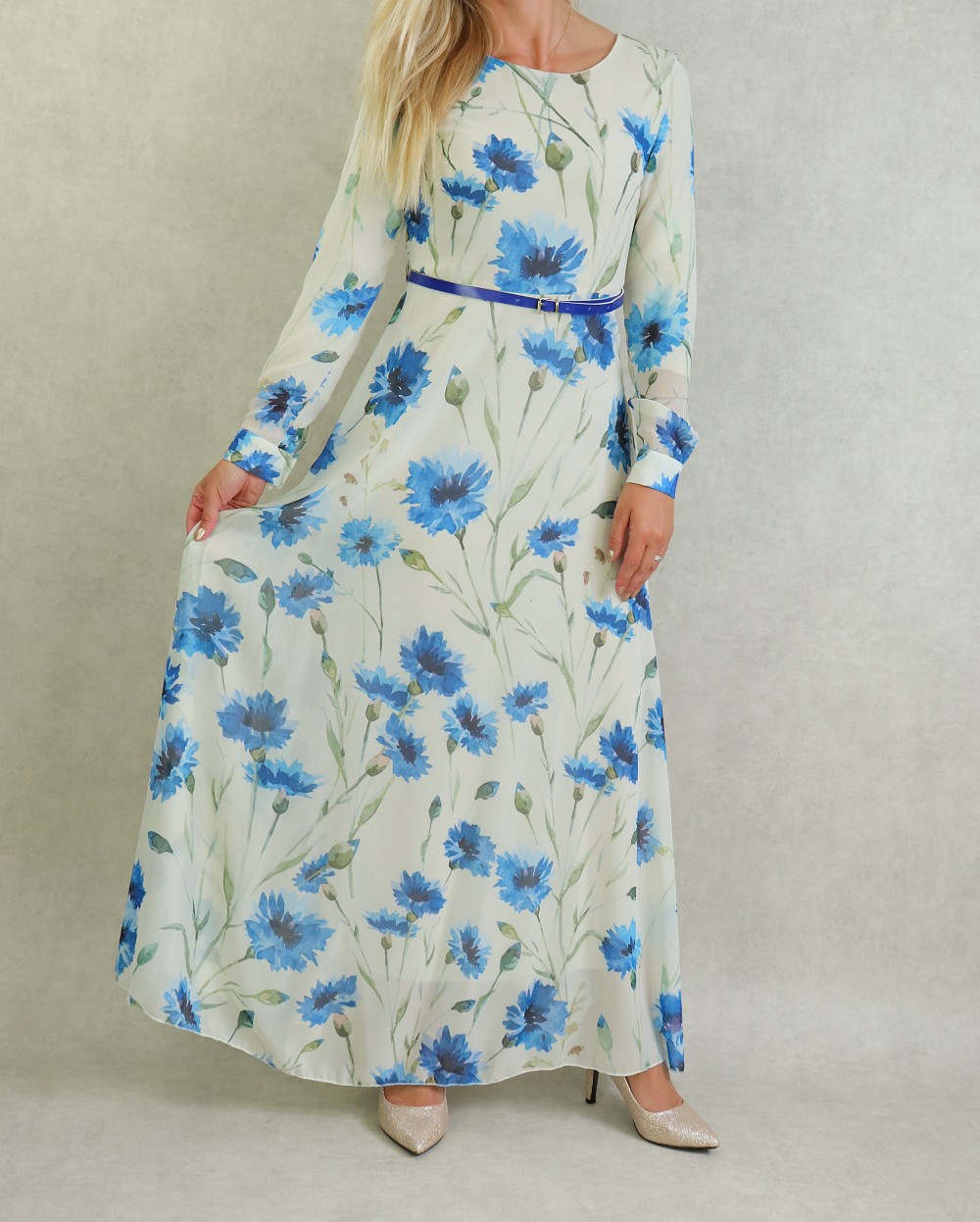 Robe longue fluide en mousseline de couleur blanc cassé avec motifs fleuris bleus et ceinture assortie Vetement & Accessoire