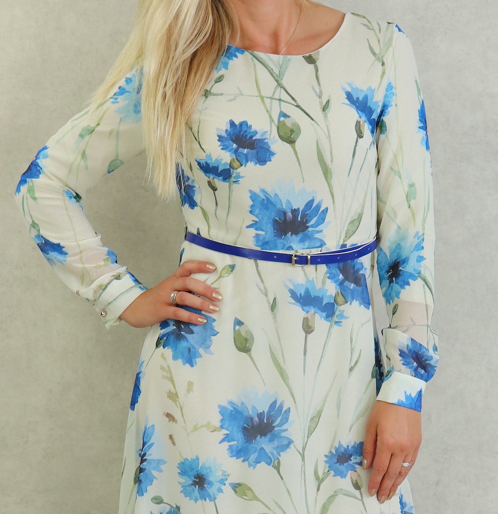 Robe longue fluide en mousseline de couleur blanc casse avec motifs fleuris bleus et ceinture assortie