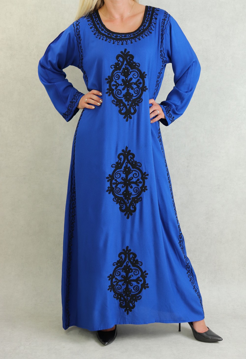 Robe orientale maxi-longue avec de nombreuses broderies à motif fleurs pour femme - Couleur bleu Vetement & Accessoire