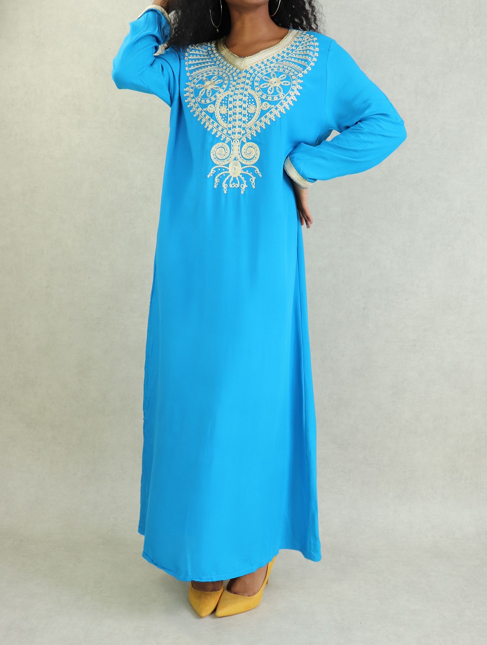 Robe orientale longue à strass et broderies en coton pour femme - Couleur Bleu Vetement & Accessoire