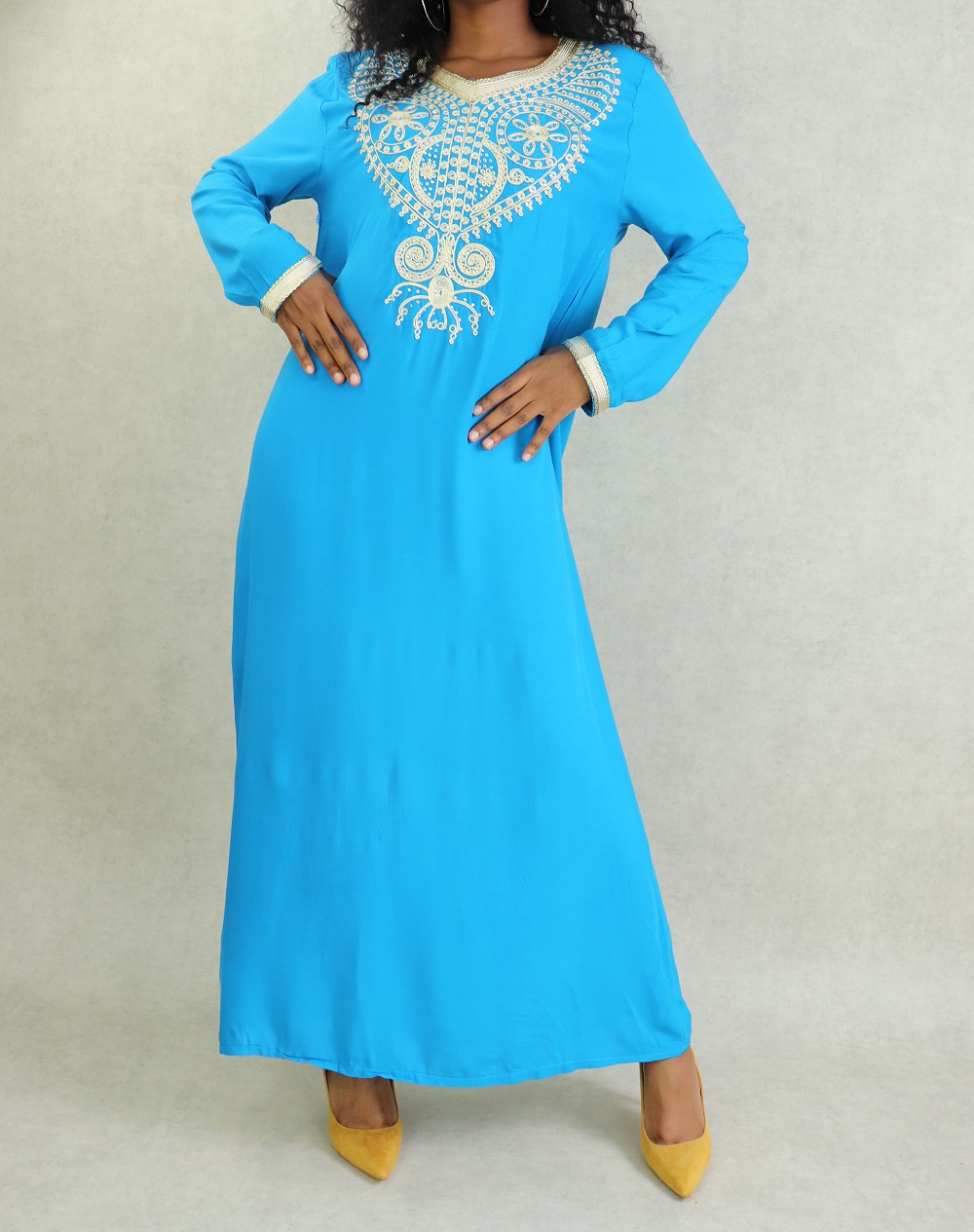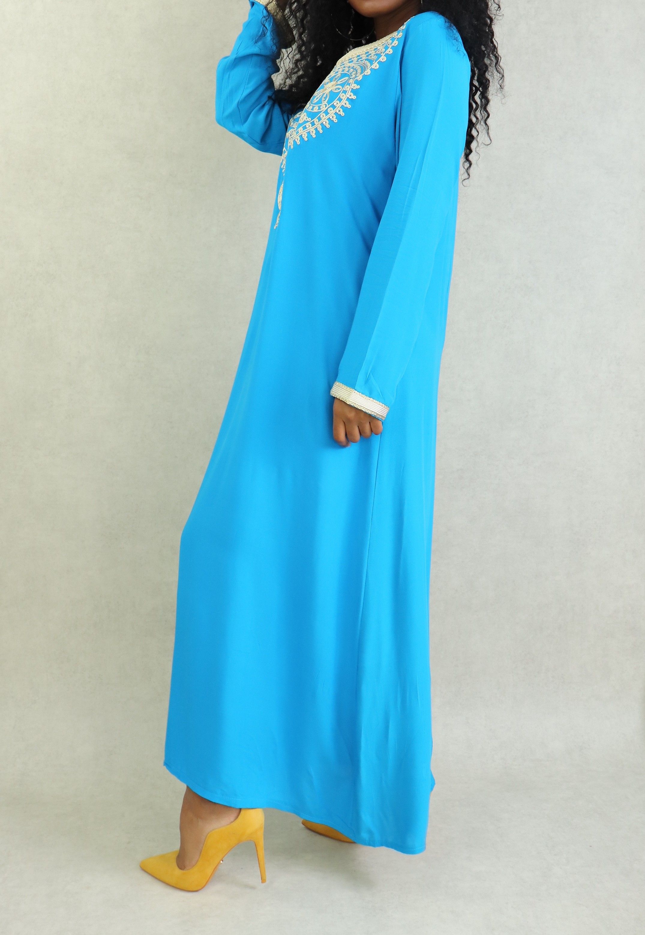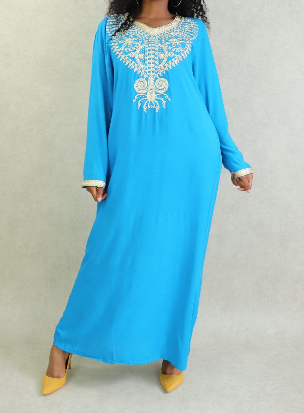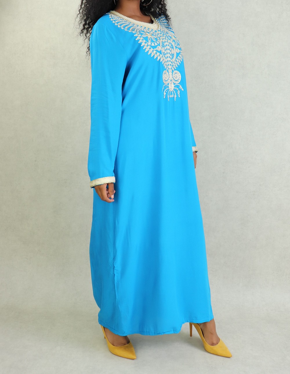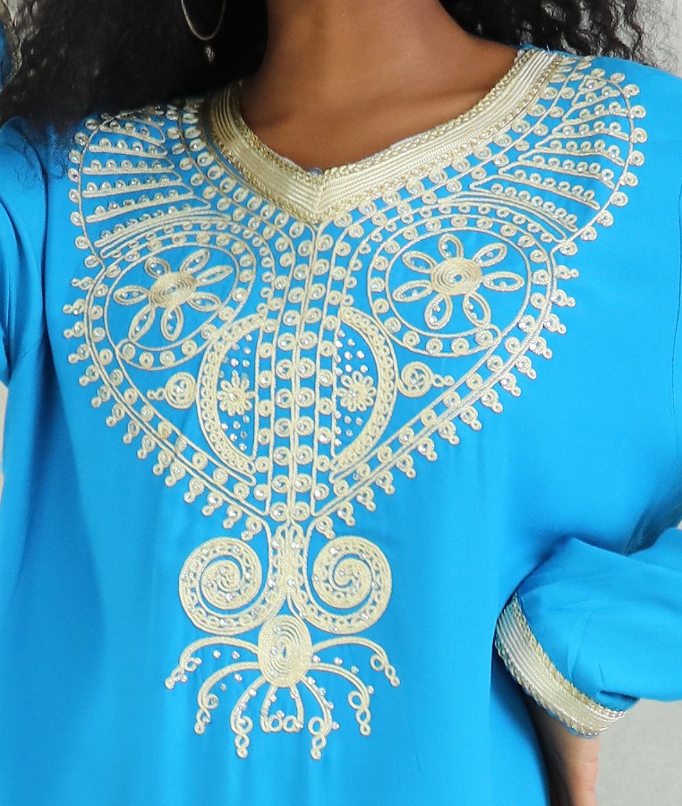 Robe orientale longue a strass et broderies en coton pour femme - Couleur Bleu