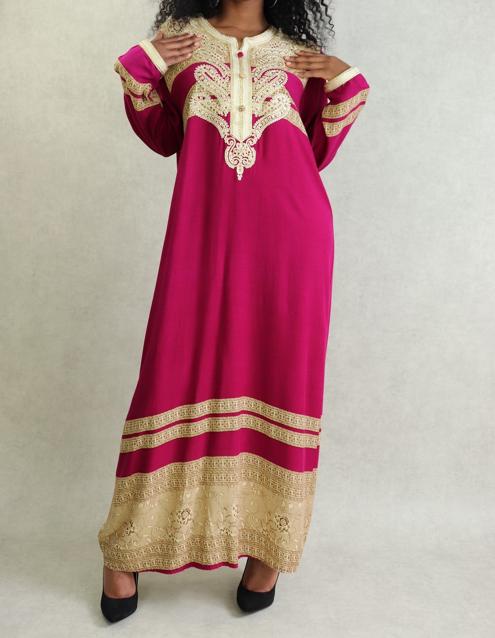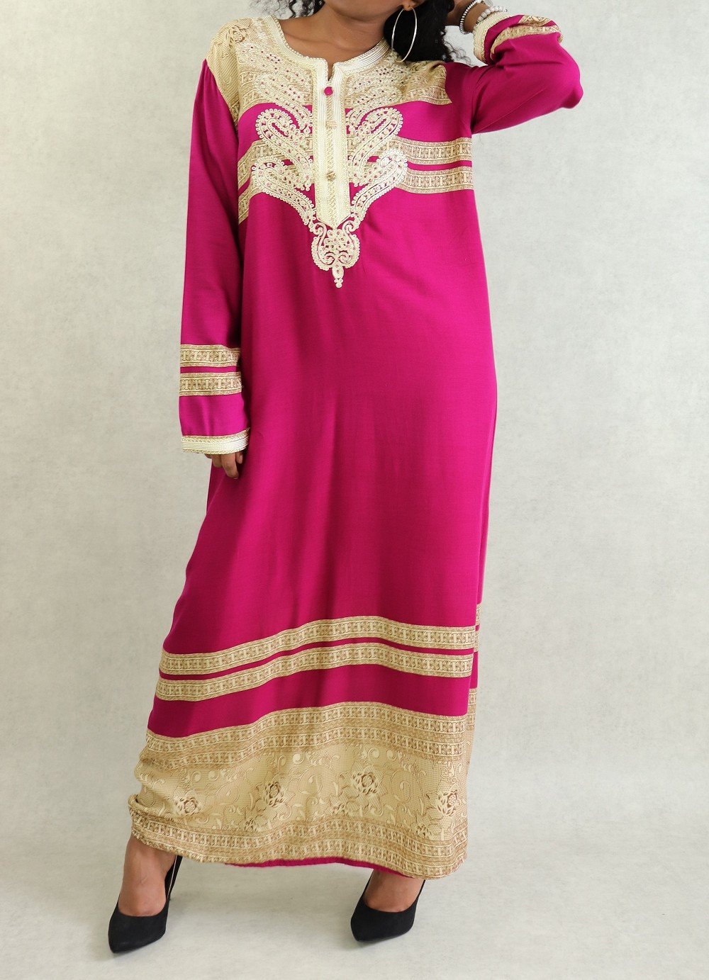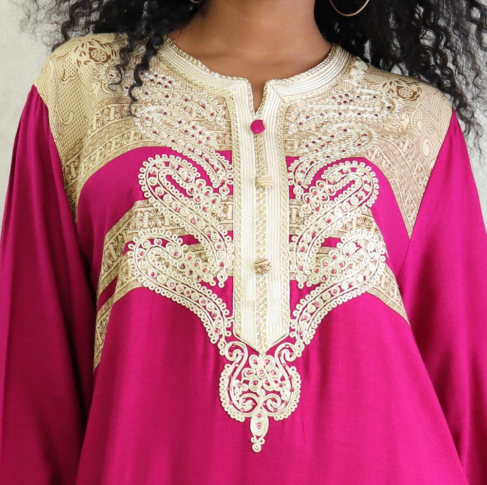 Robe orientale longue d'été ou d'intérieur bi-couleur, manches longues, col rond, orné de broderies et strass sur le buste et les poignets. Cette robe est dotée d'une magnifique tissu opaque, fluide avec un imprimé original.