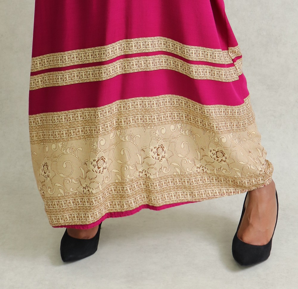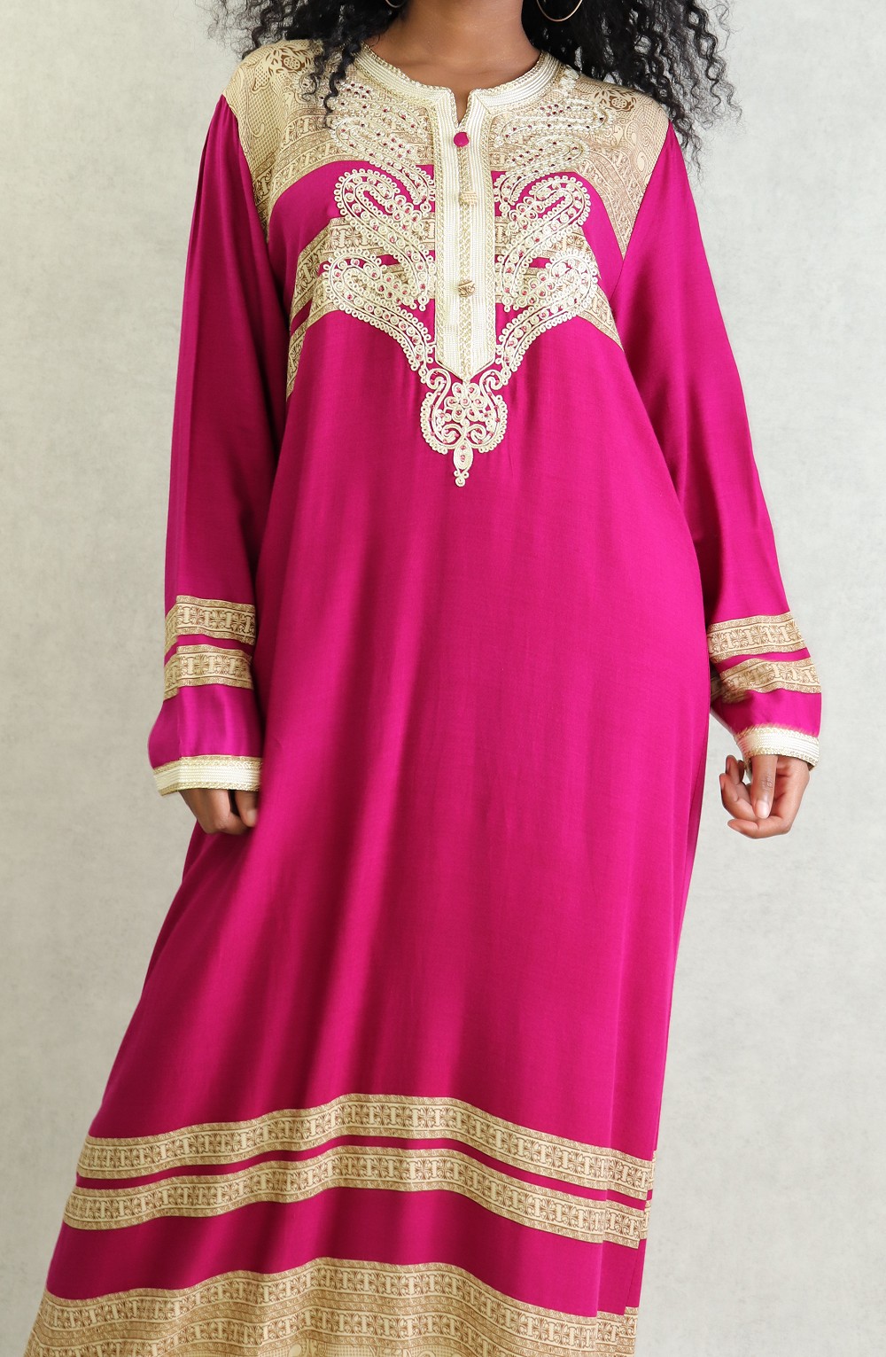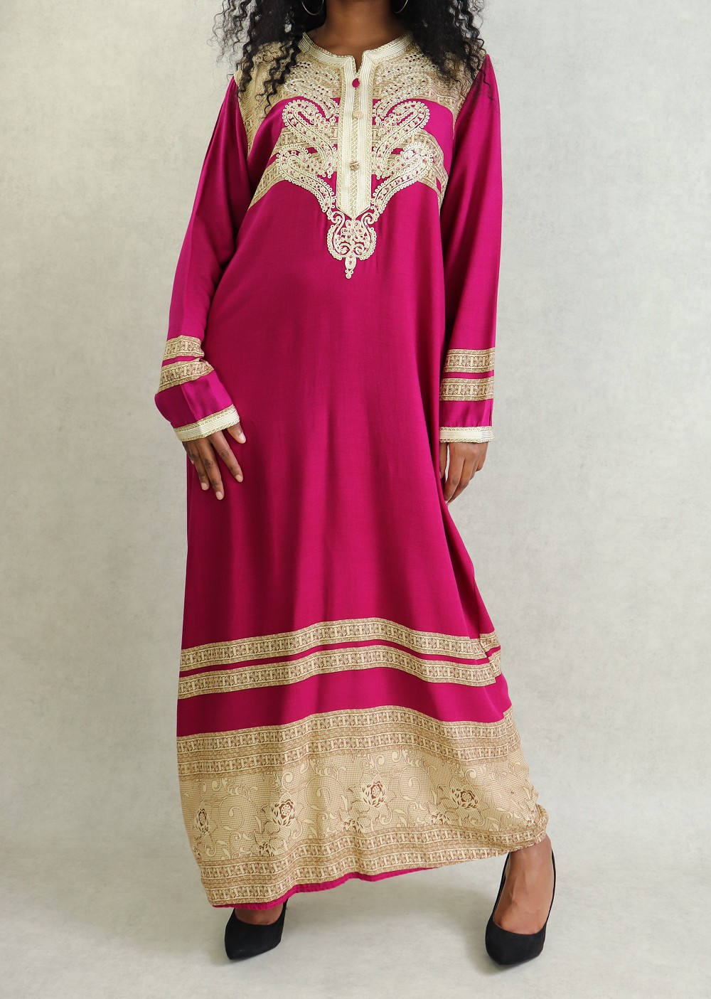 Robe orientale longue d'été ou d'intérieur bi-couleur, manches longues, col rond, orné de broderies et strass sur le buste et les poignets. Cette robe est dotée d'une magnifique tissu opaque, fluide avec un imprimé original.