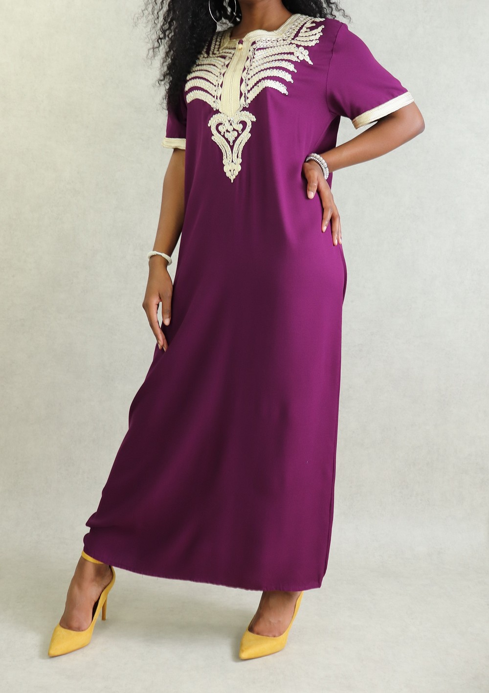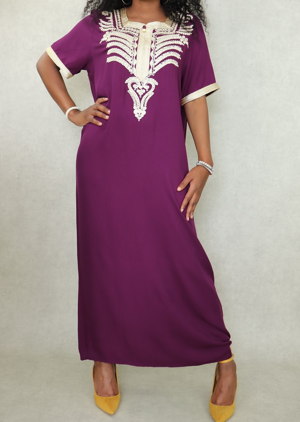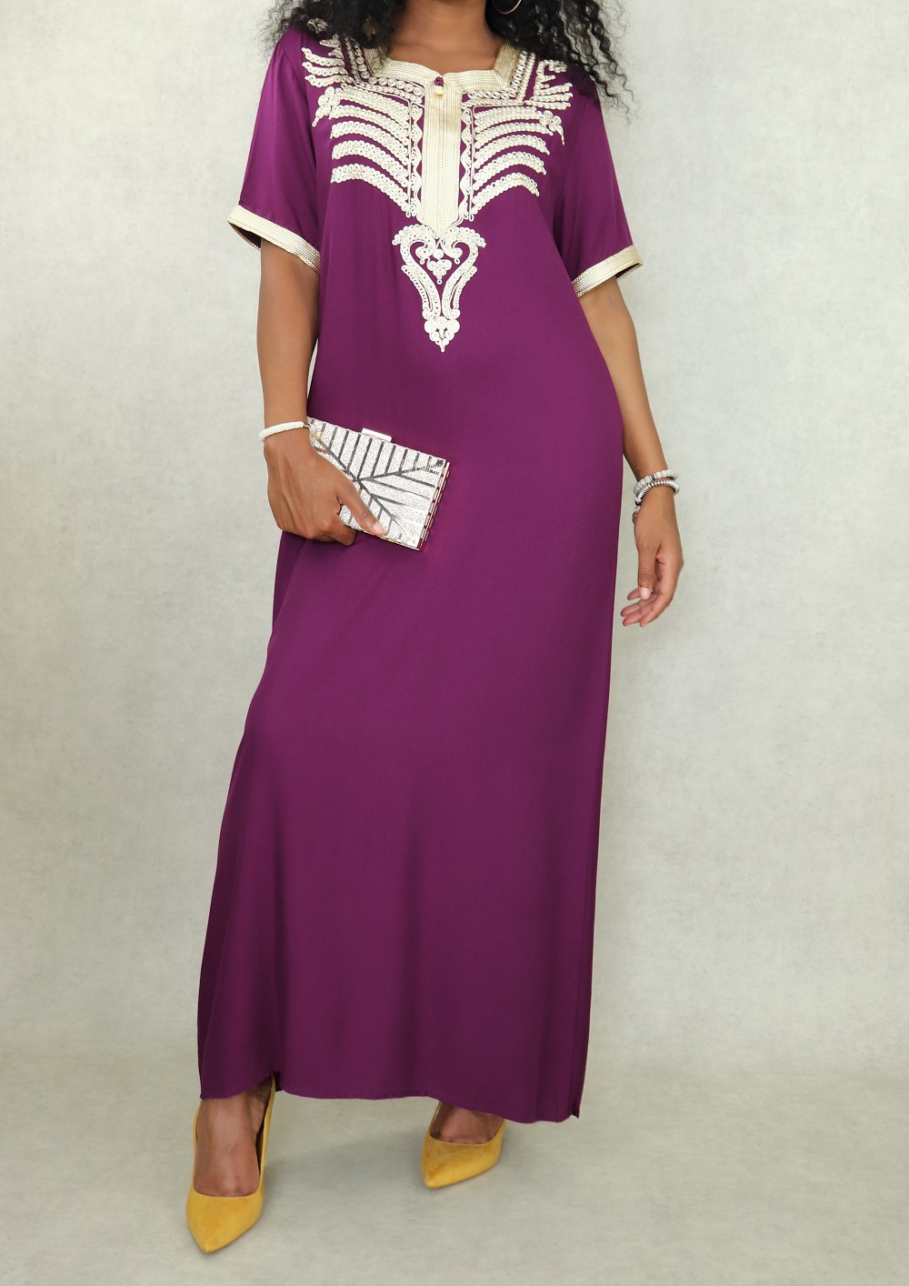 Robe orientale longue brodée manches courtes fluide et décontractée pour femme - Couleur Violet Vetement & Accessoire