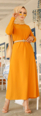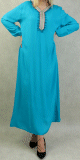 Robe longue, col en V, manches longues finition élastique aux poignets. Coupe droite, tissu doux et fluide.