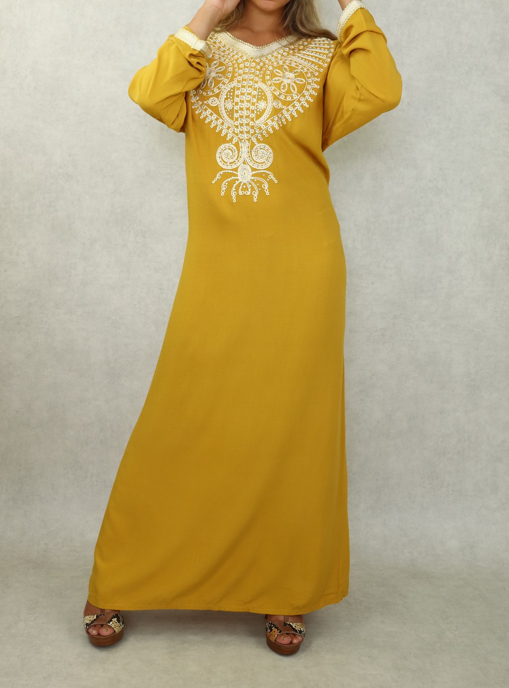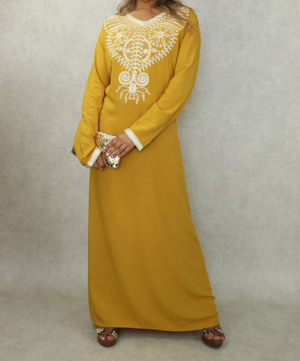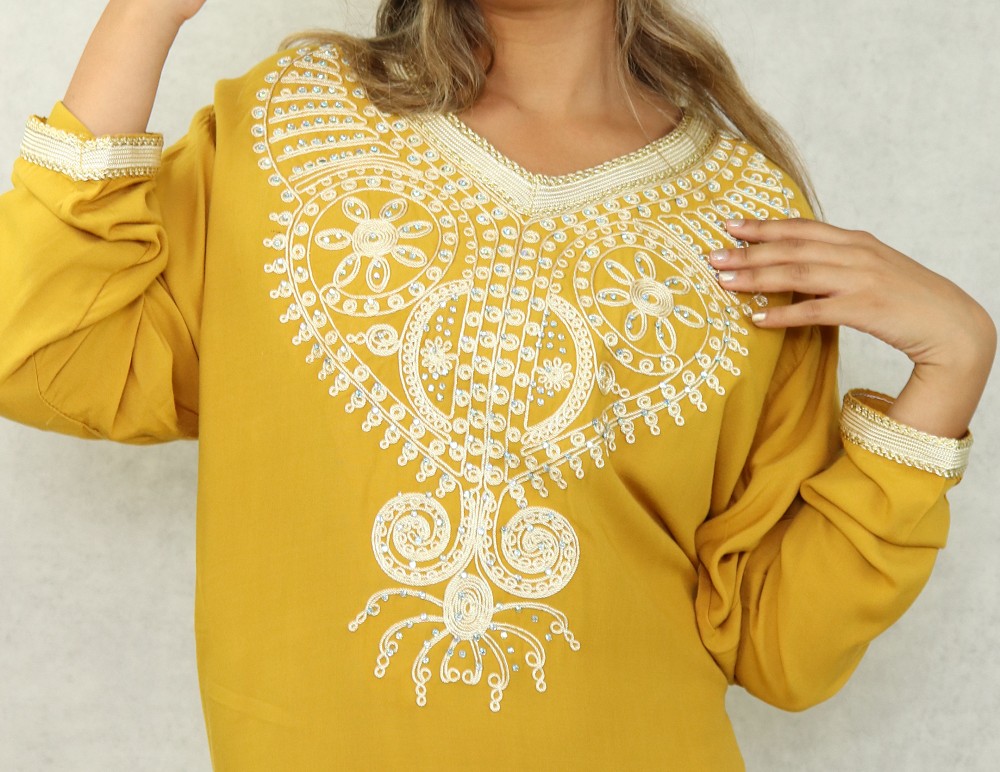 Robe orientale longue à strass et broderies en coton pour femme - Couleur moutarde Vetement & Accessoire