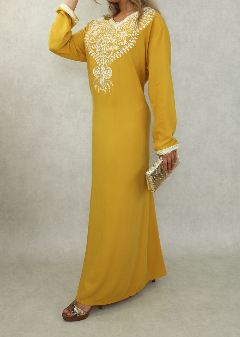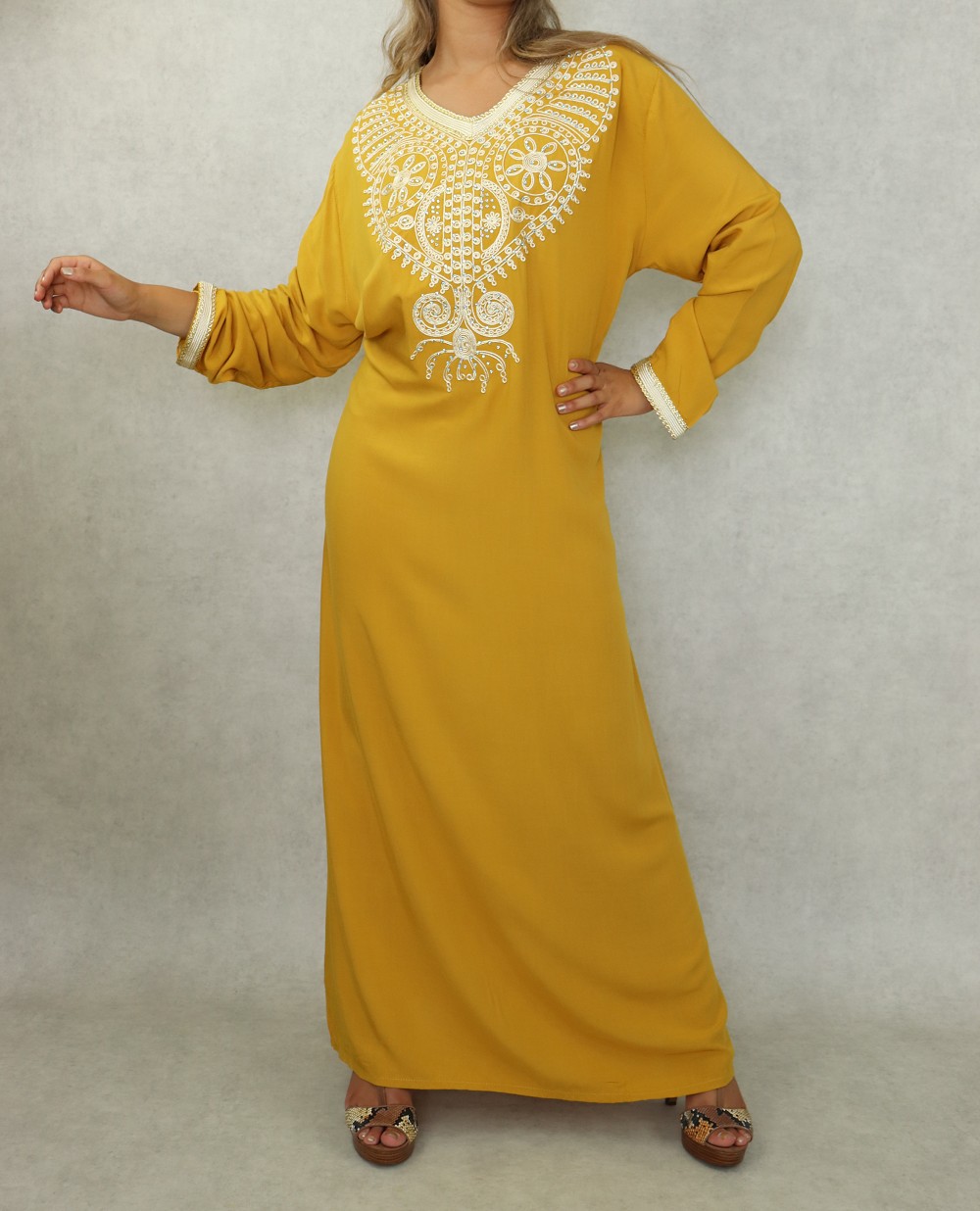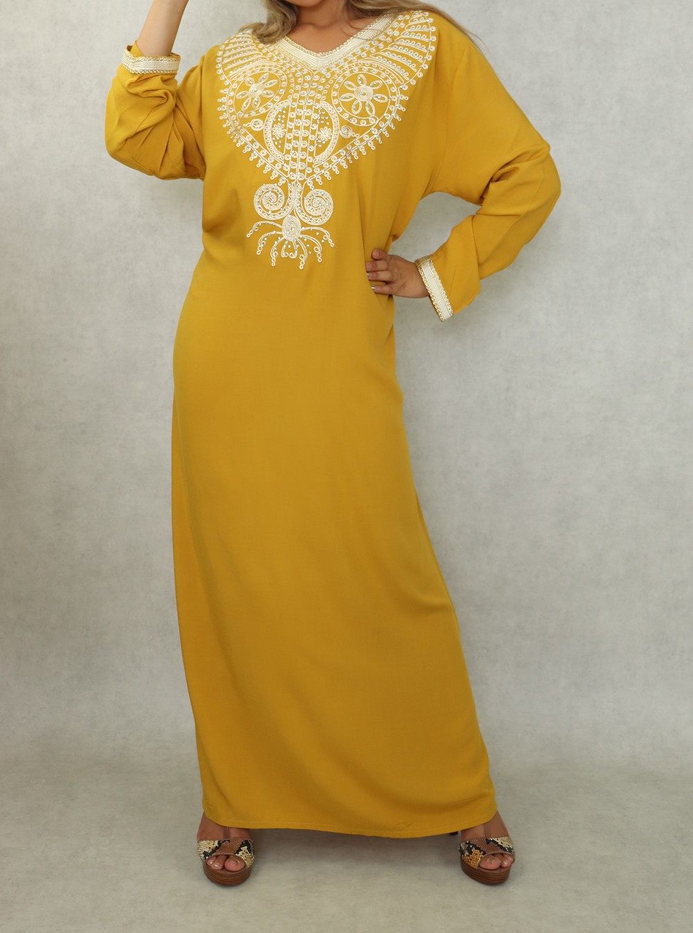 Robe orientale longue à strass et broderies en coton pour femme - Couleur moutarde Vetement & Accessoire