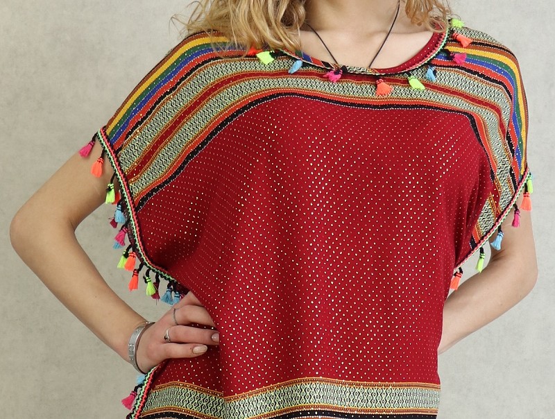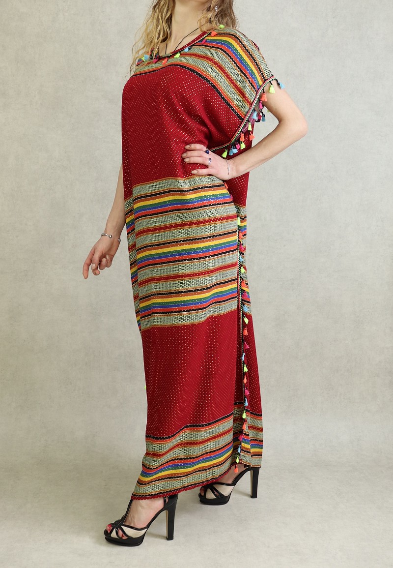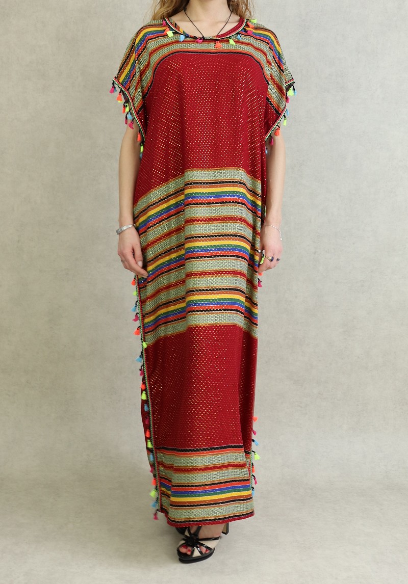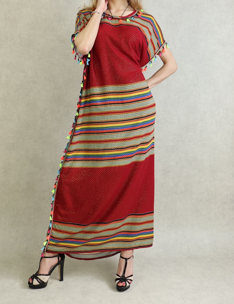 Robe orientale longue à rayures horizontales multicolores, mini-pompons sur toute la longueur et au niveau du col, paillettes brillantes sur toute la robe, coupe droite, col rond. On aime son tissu au toucher et un tombé fluide et confortable. Agréable robe d'été ou pour la maison.