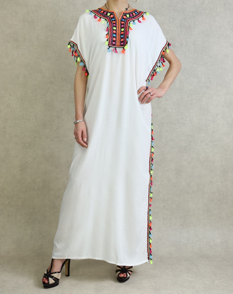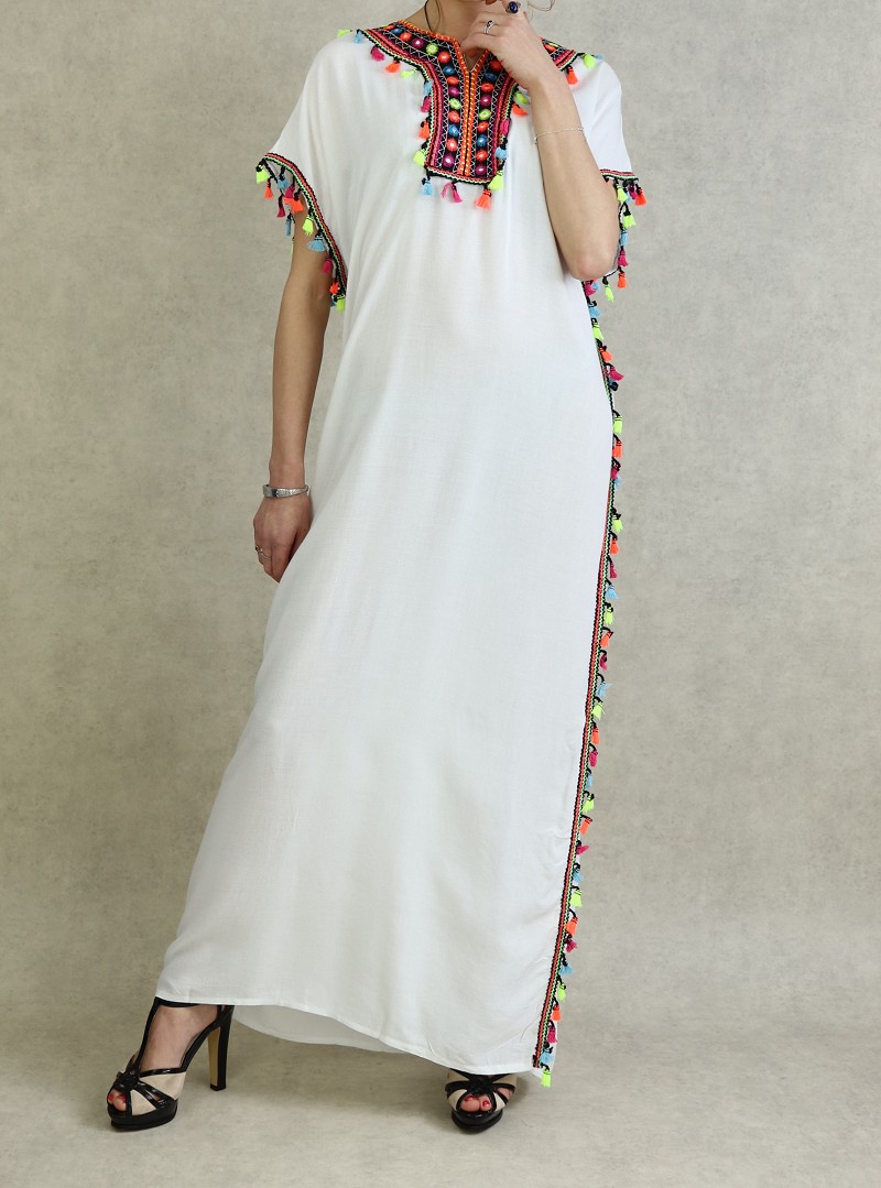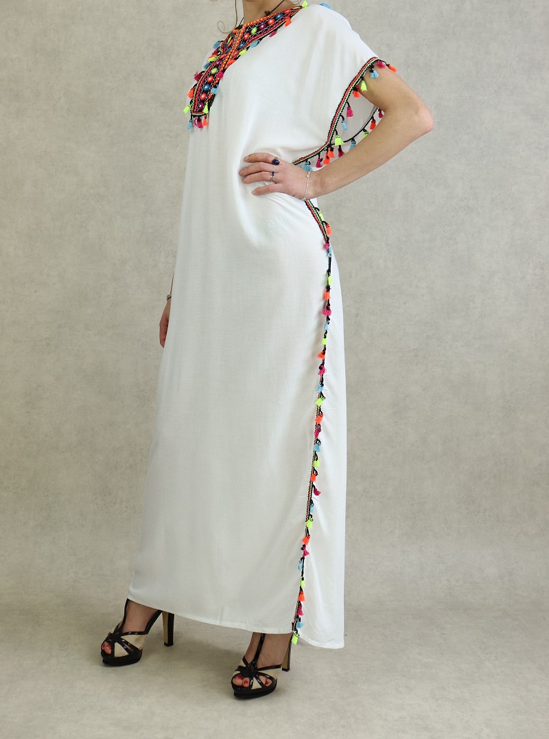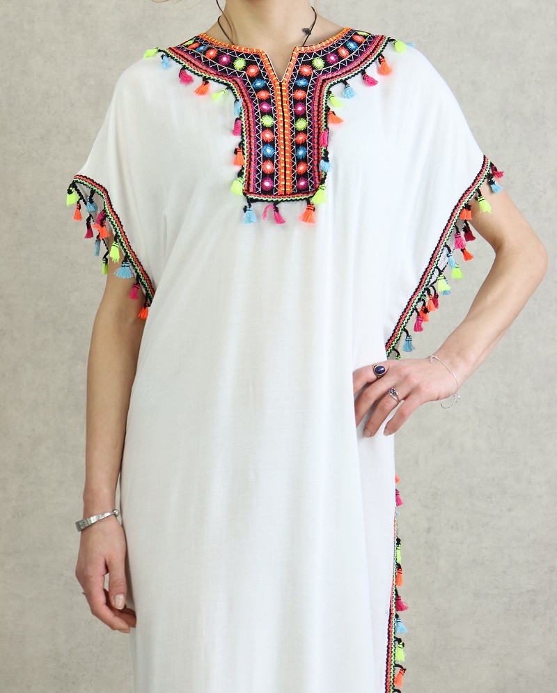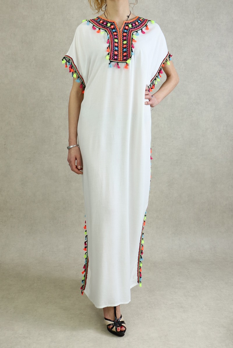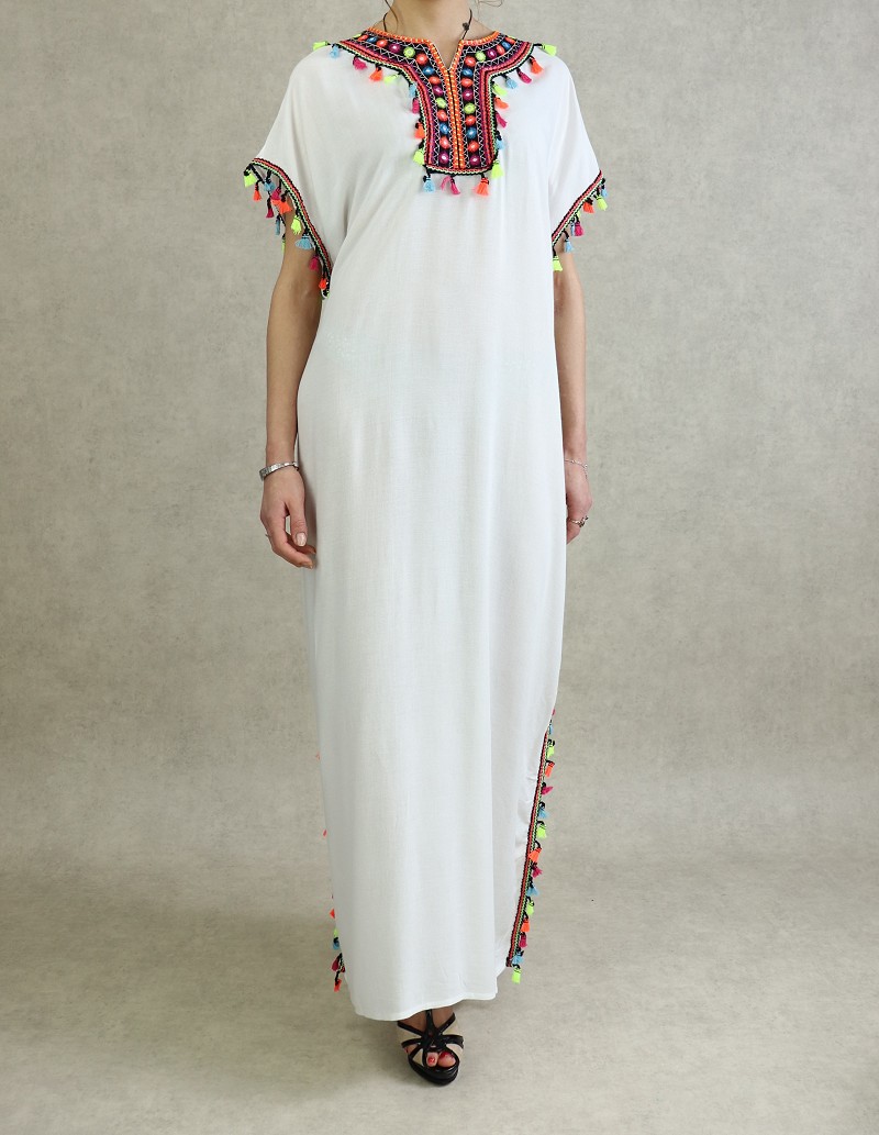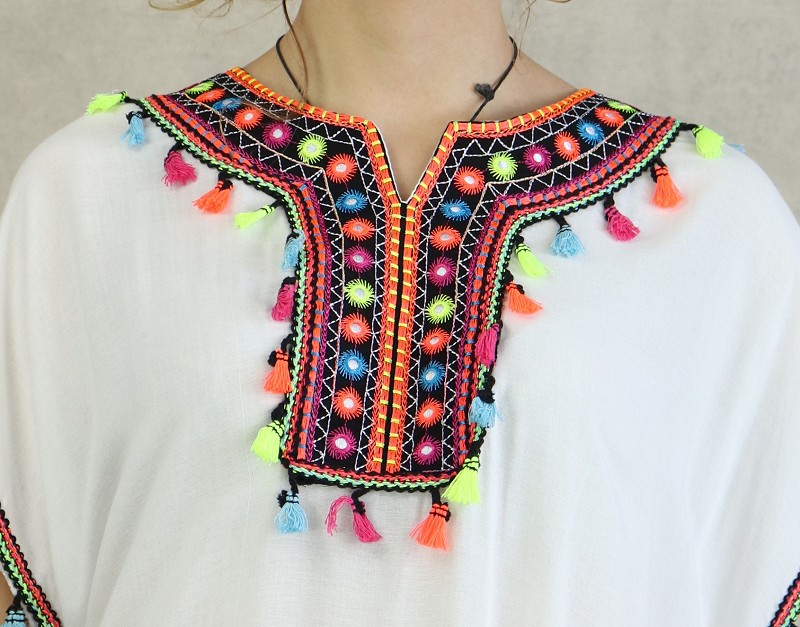Robe orientale extra large avec broderies et pompons, coupe droite, col rond semi ouvert, sans manches. La coupe ainsi que sa matière faciliteront une décontraction évidente.