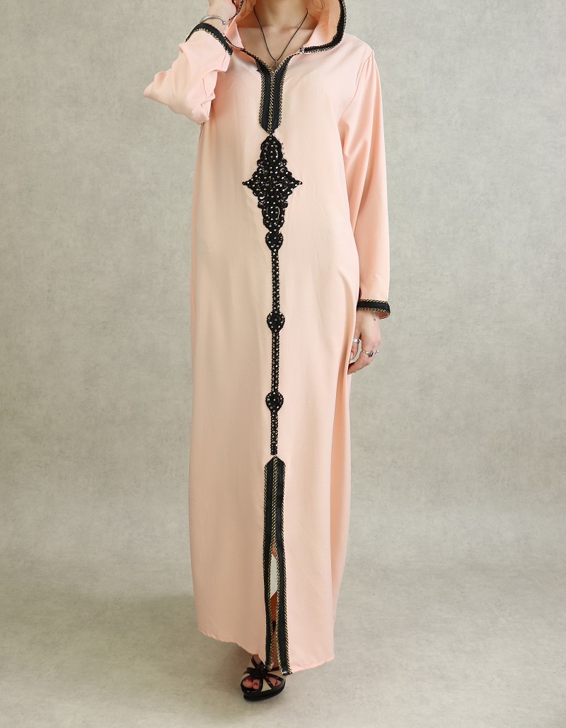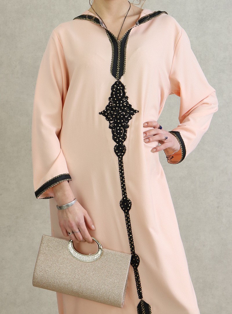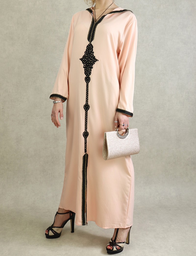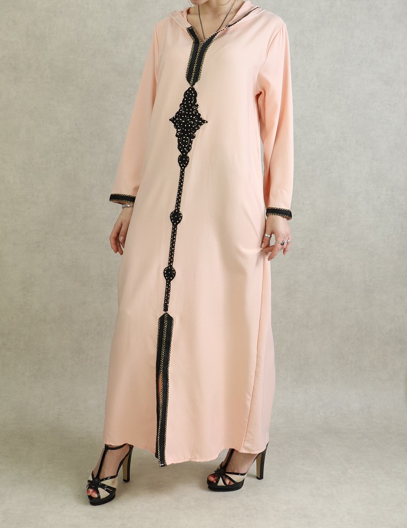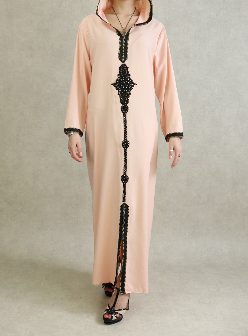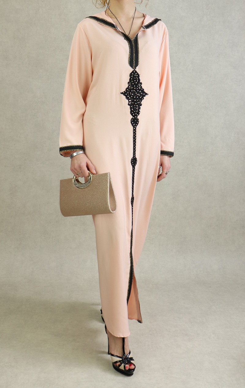 Djellaba marocaine avec broderies noires et strass dorées sur le devant, sur les poignets ainsi que le contour de la capuche.