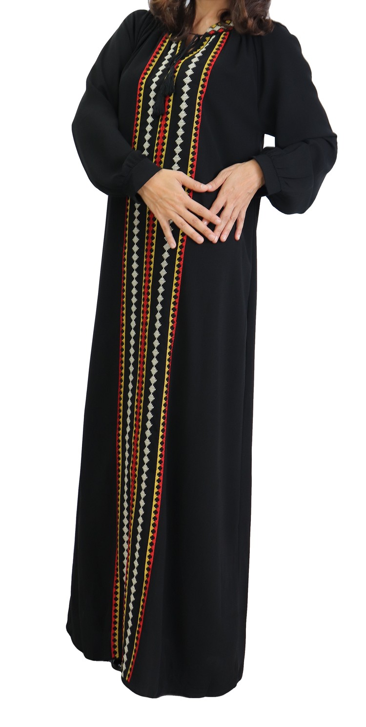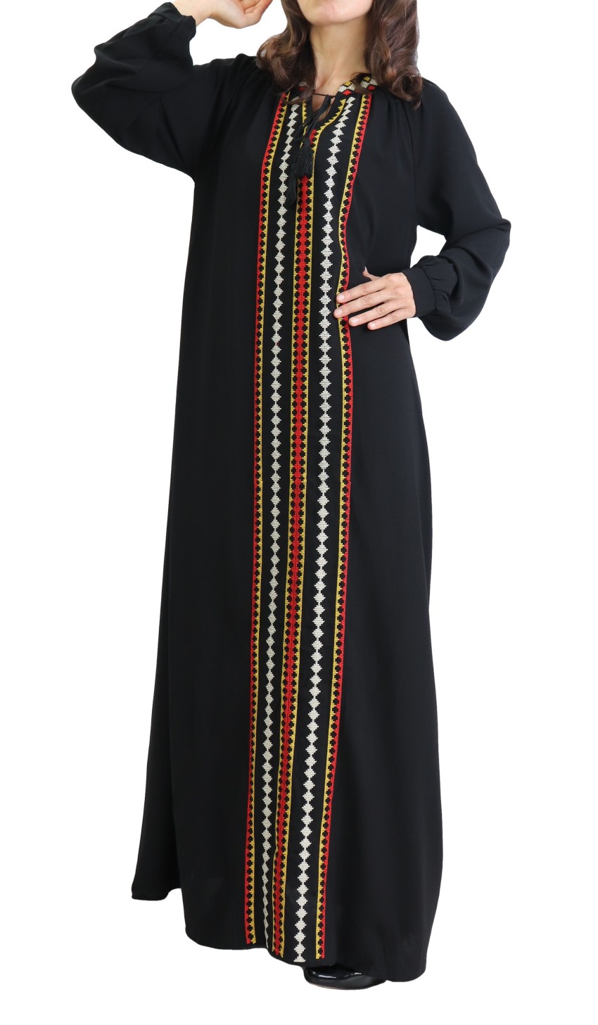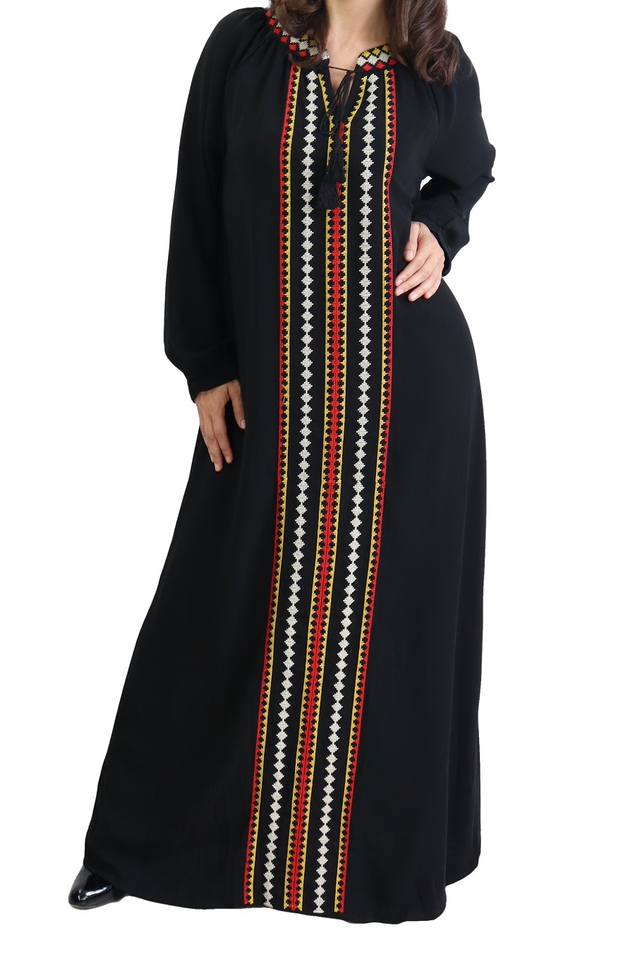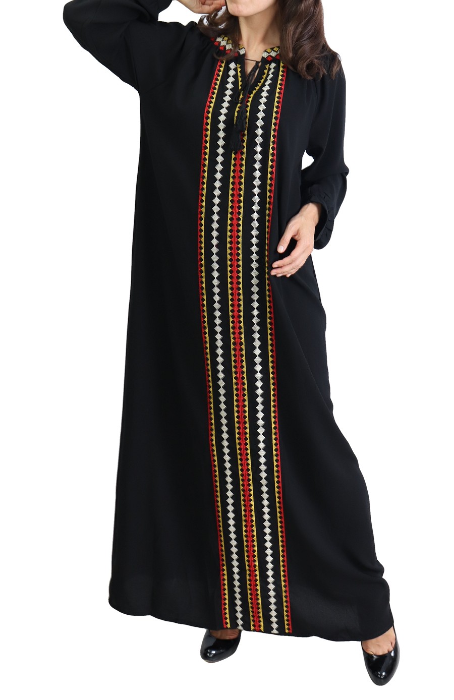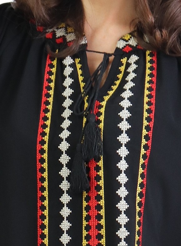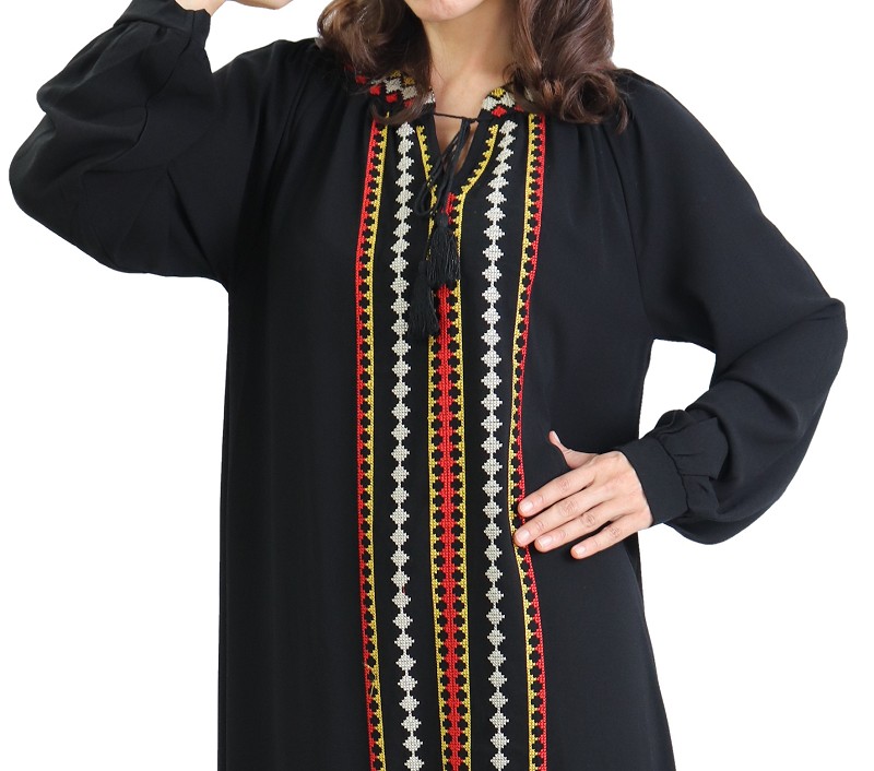Robe longue, col Mao à nouer brodé ainsi que sur toute la longueur, manches bouffantes. Cette robe par sa broderie originale vous apportera un supplément d'élégance.