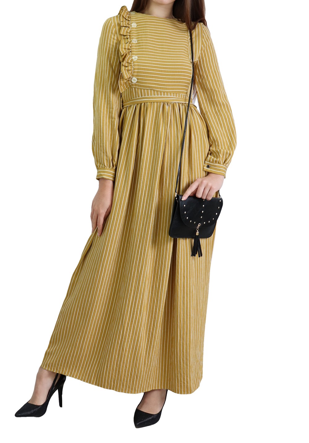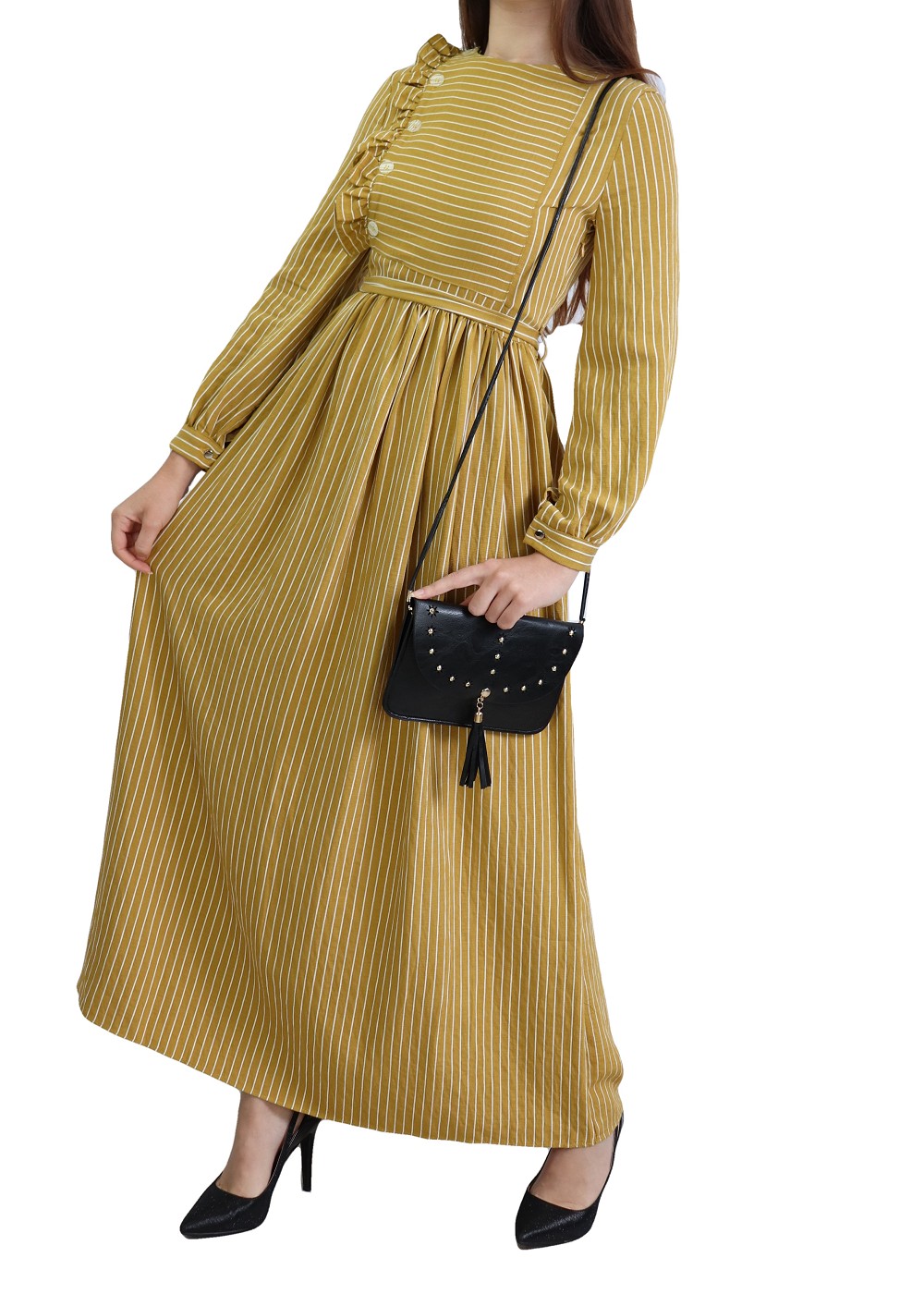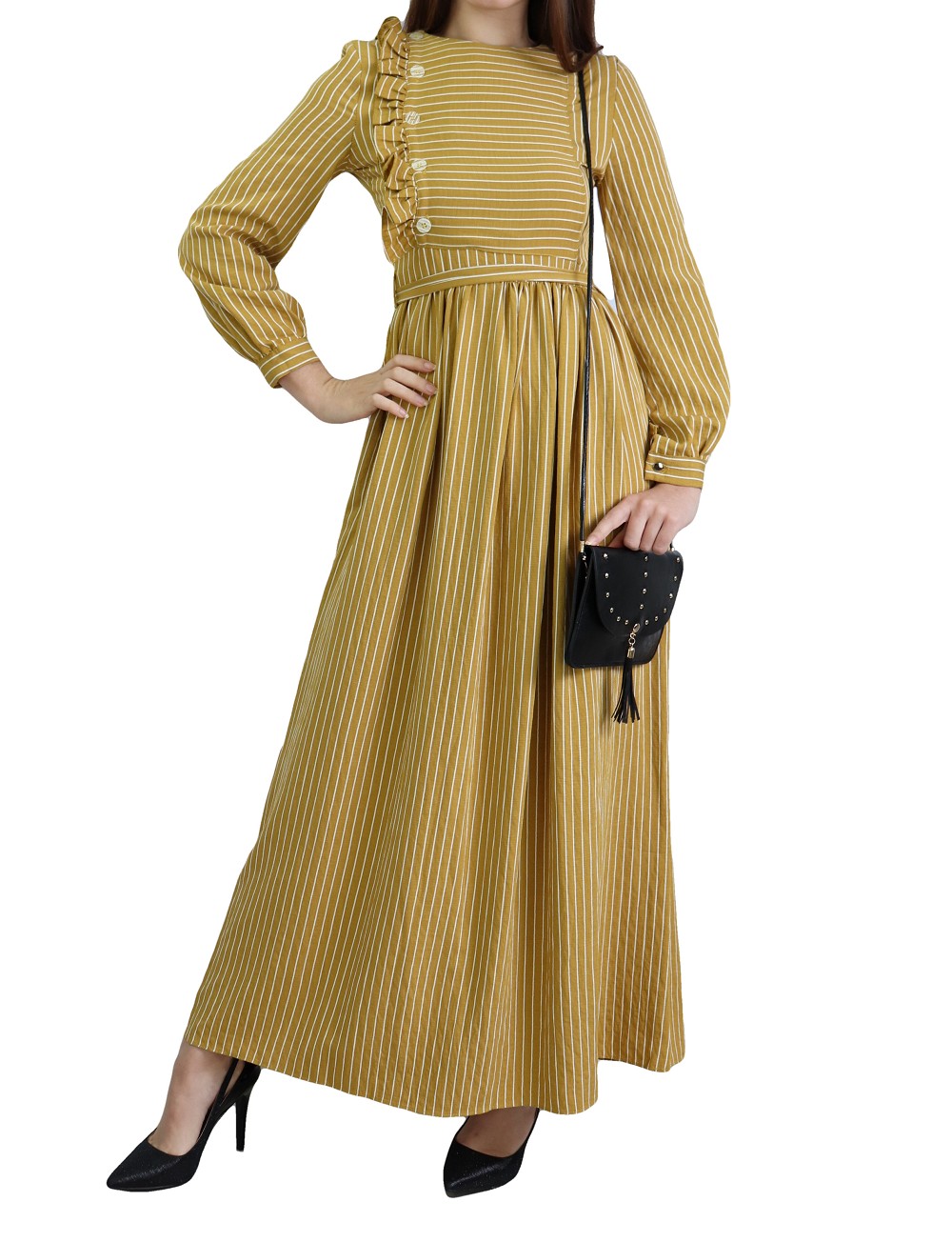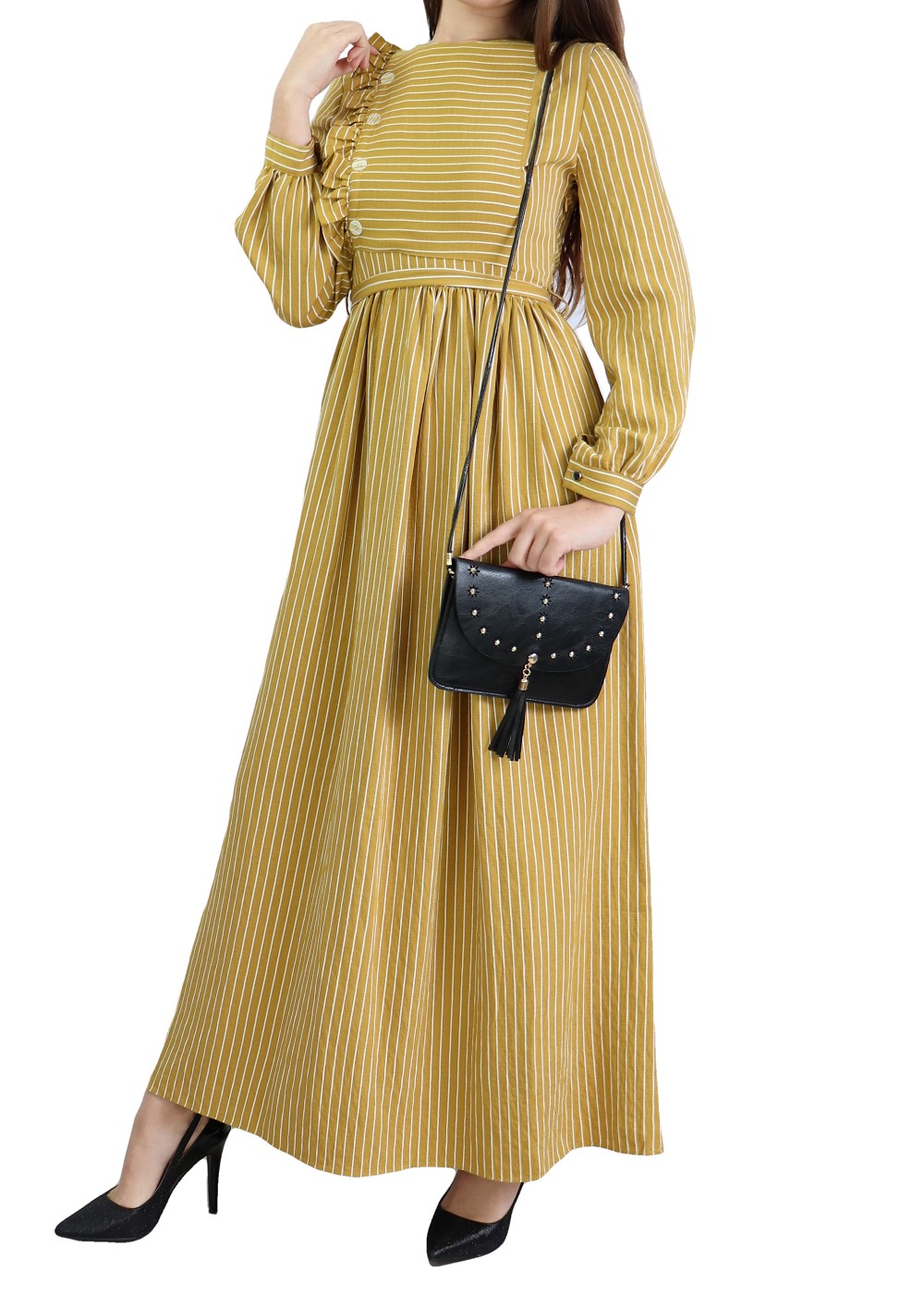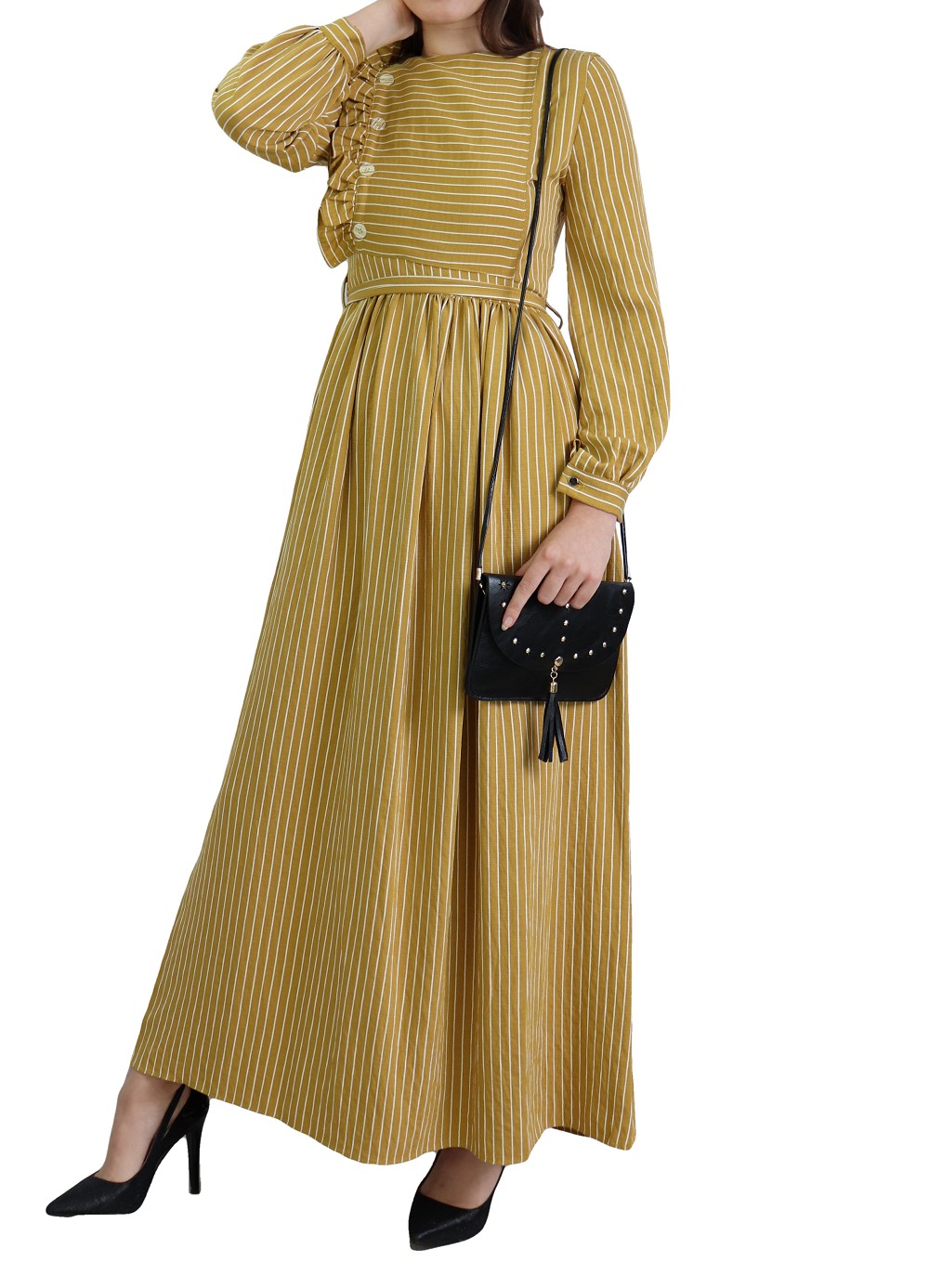 Robe casual longue évasée à rayures blanches pour femme - Couleur Moutarde Vetement & Accessoire