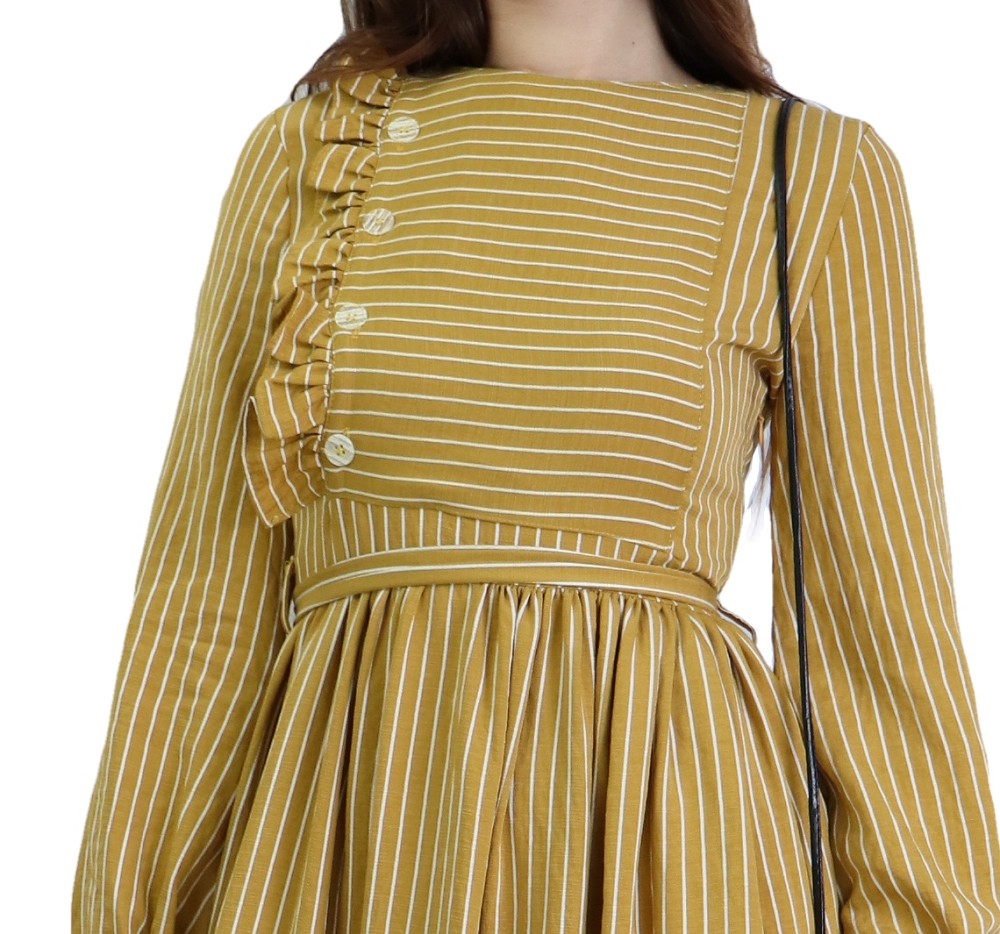 Robe casual longue evasee a rayures blanches pour femme - Couleur Moutarde
