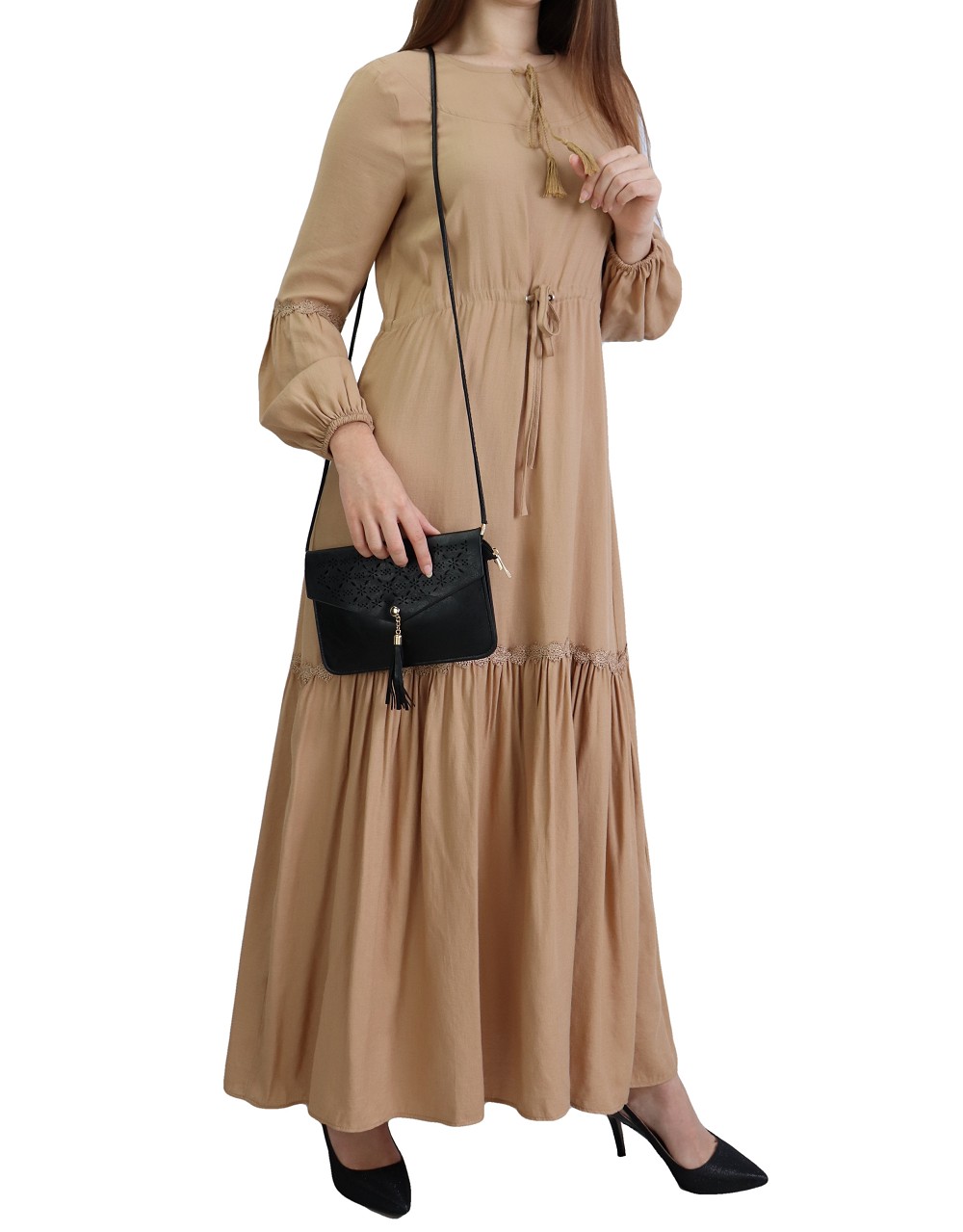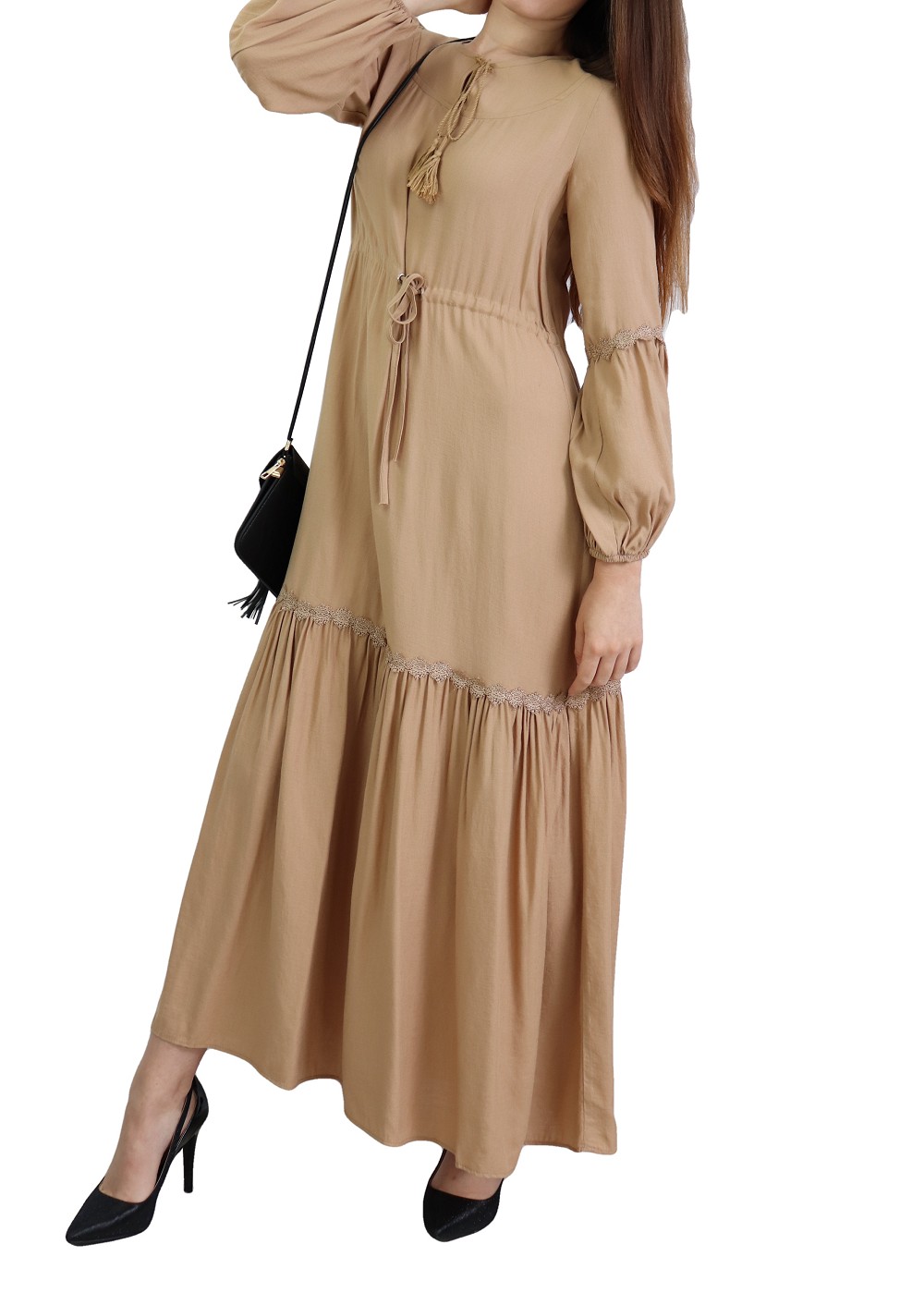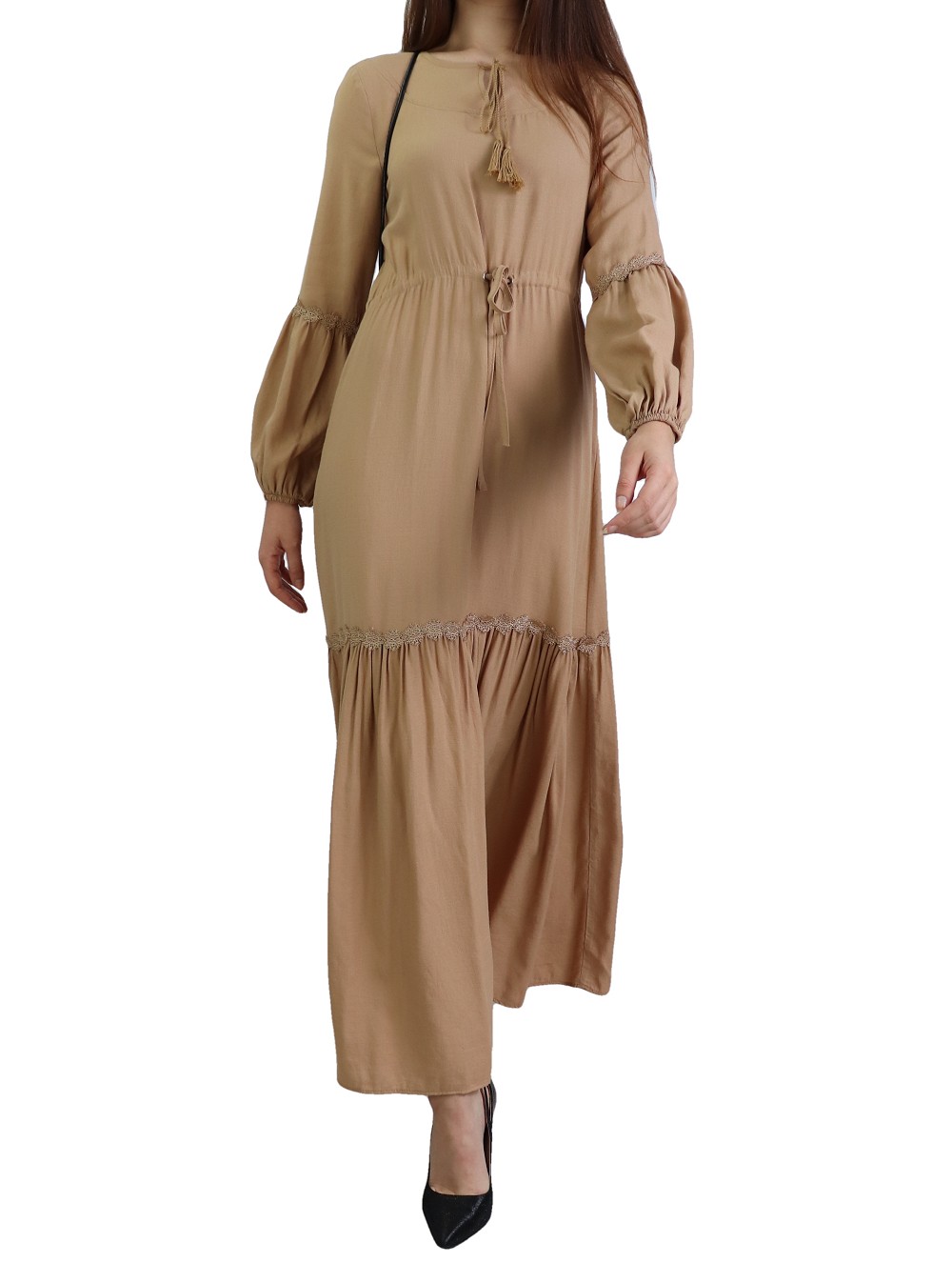Robe longue bordée d’un volant pour femme (Vêtement style habillé pour hijab) - Couleur kaki - REF. 35191 (26.00 €) - En Promotion à 19.90 €