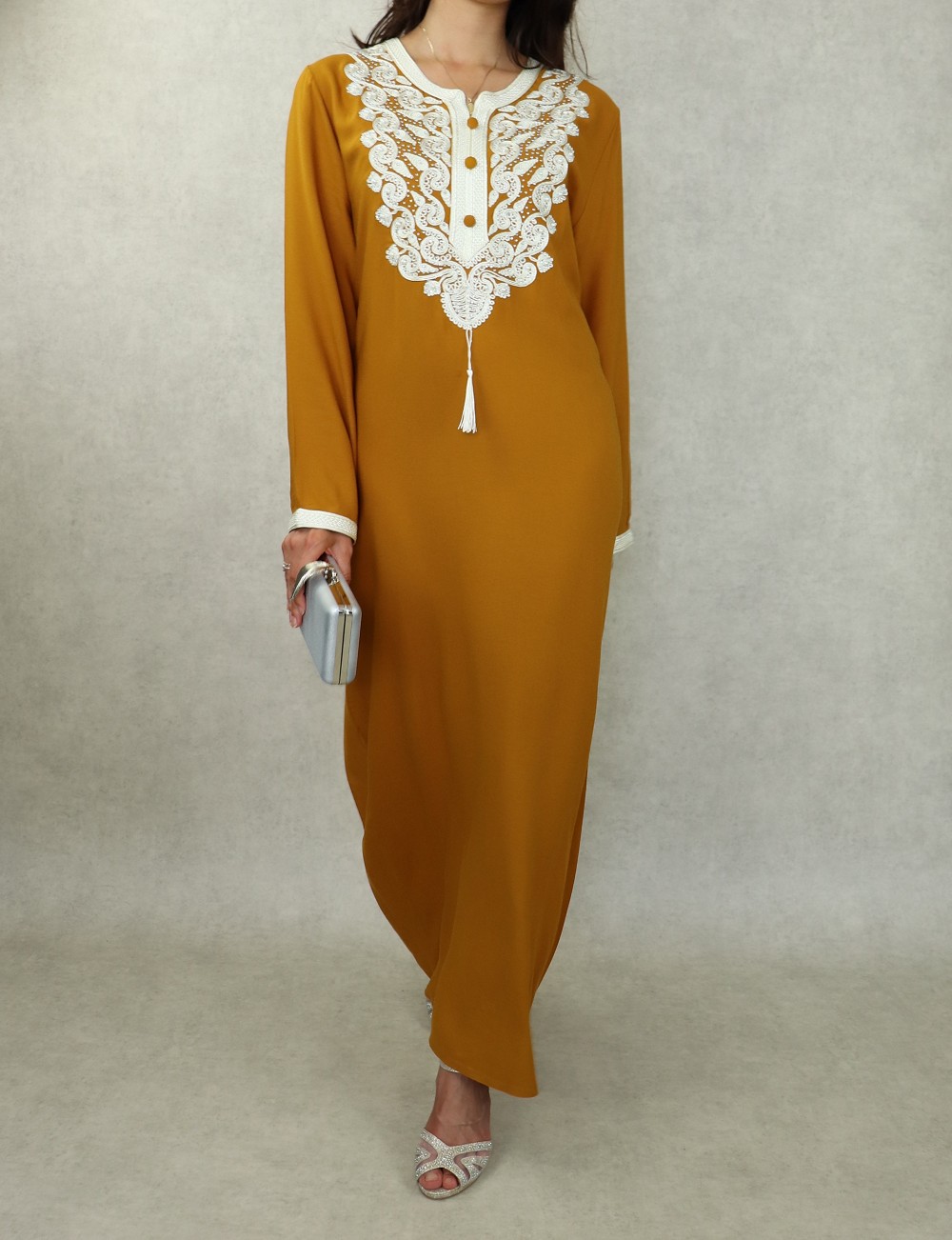 Robe orientale longue brodee pour femme - Couleur Jaune moutarde