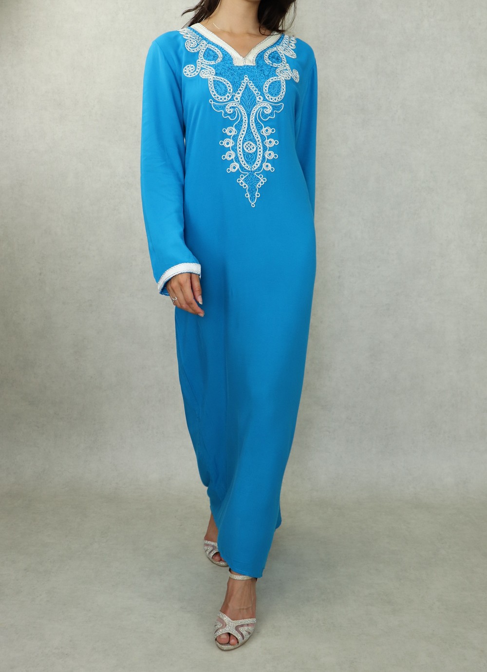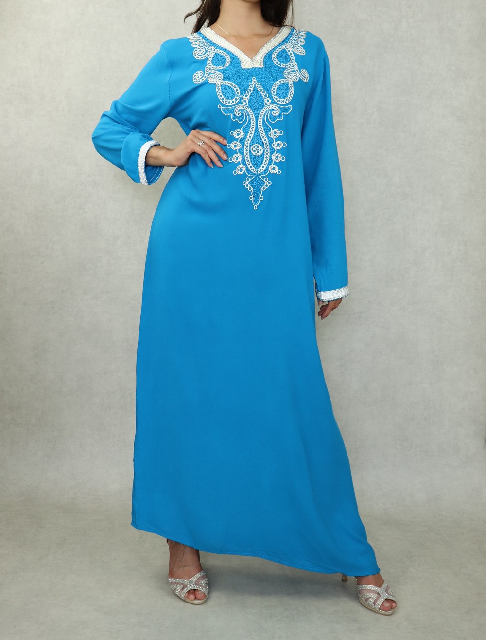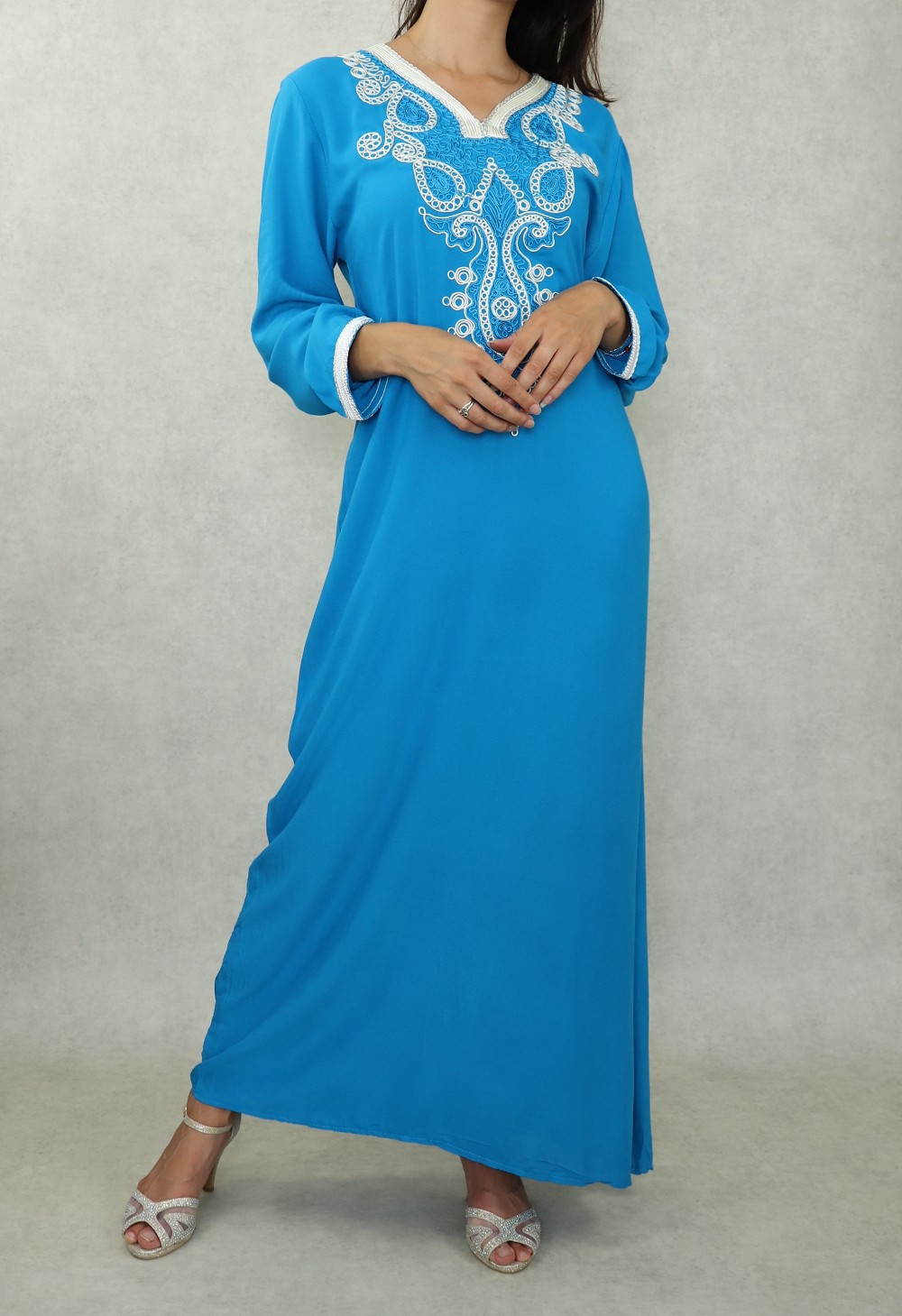 Robe orientale longue avec belles broderies en coton pour femme - Couleur Bleu Vetement & Accessoire