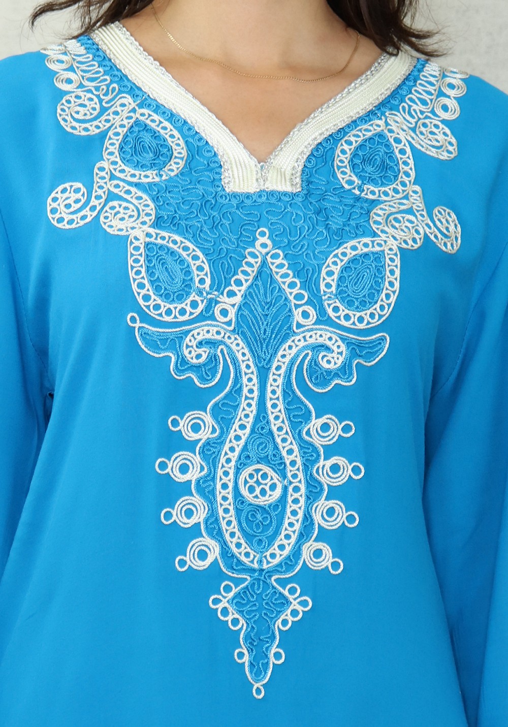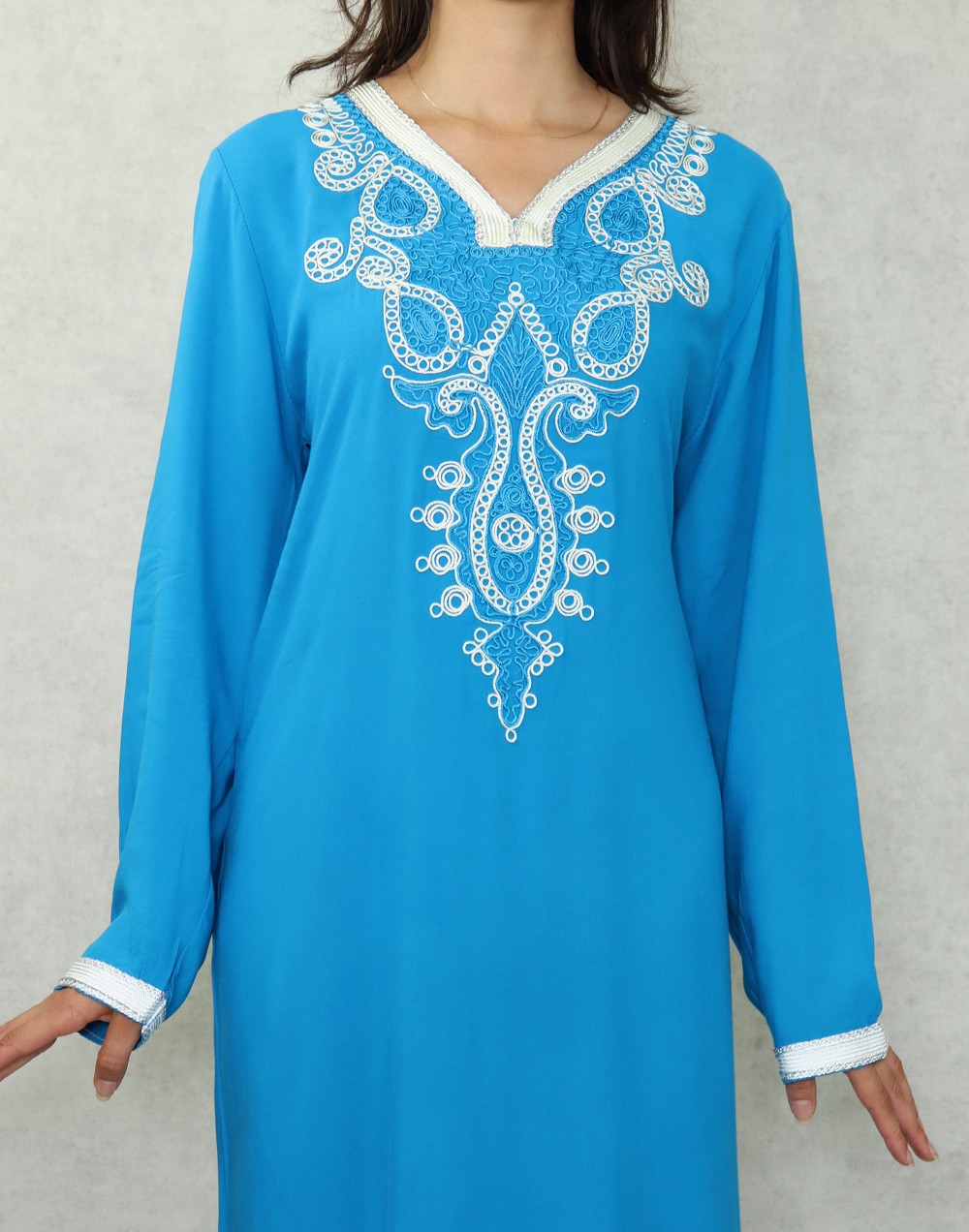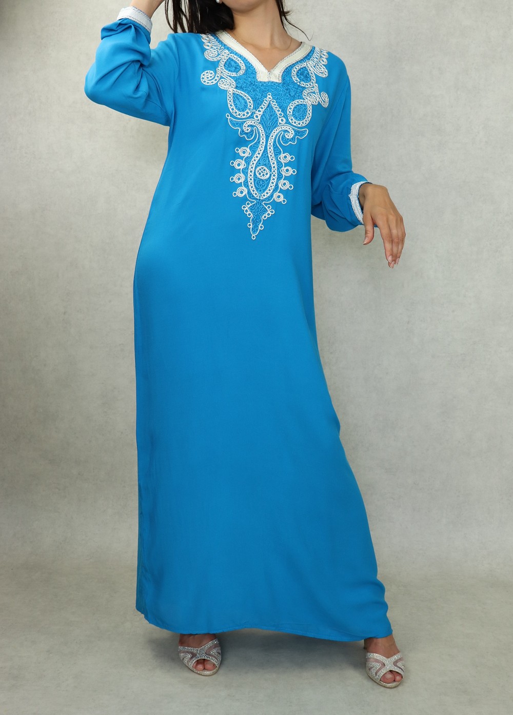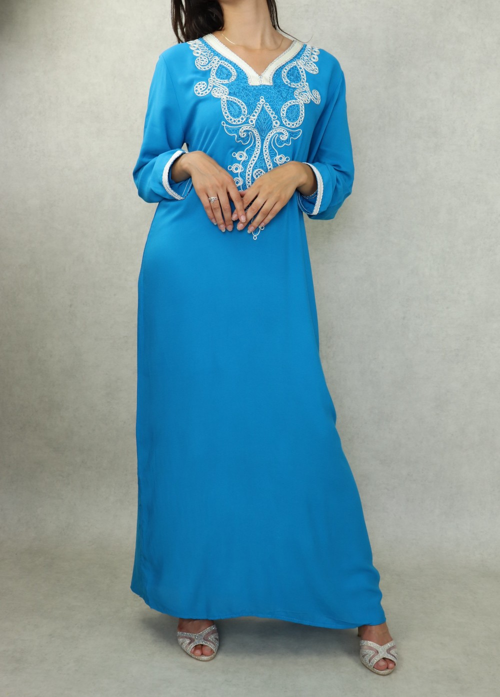Robe orientale longue avec belles broderies en coton pour femme - Couleur Bleu Vetement & Accessoire