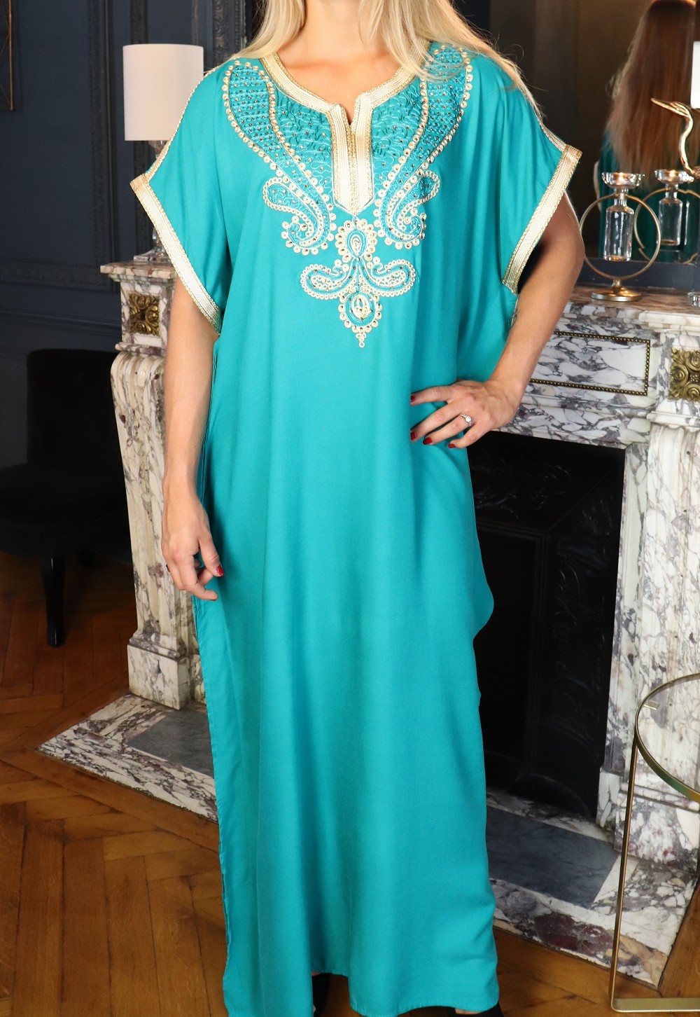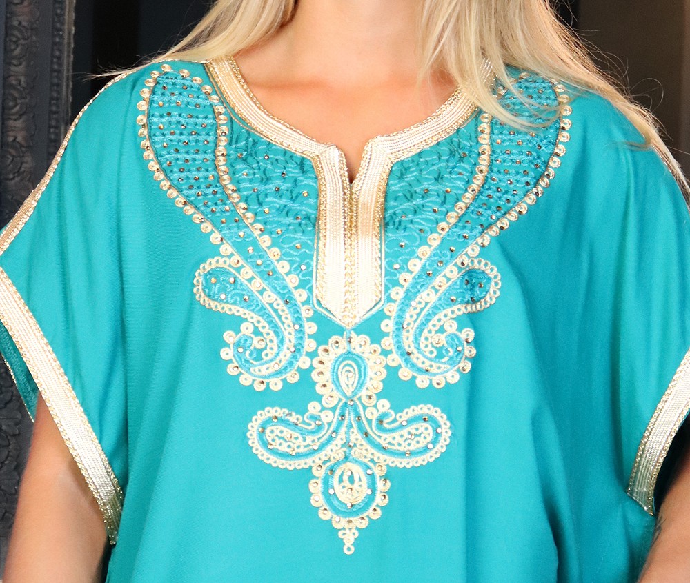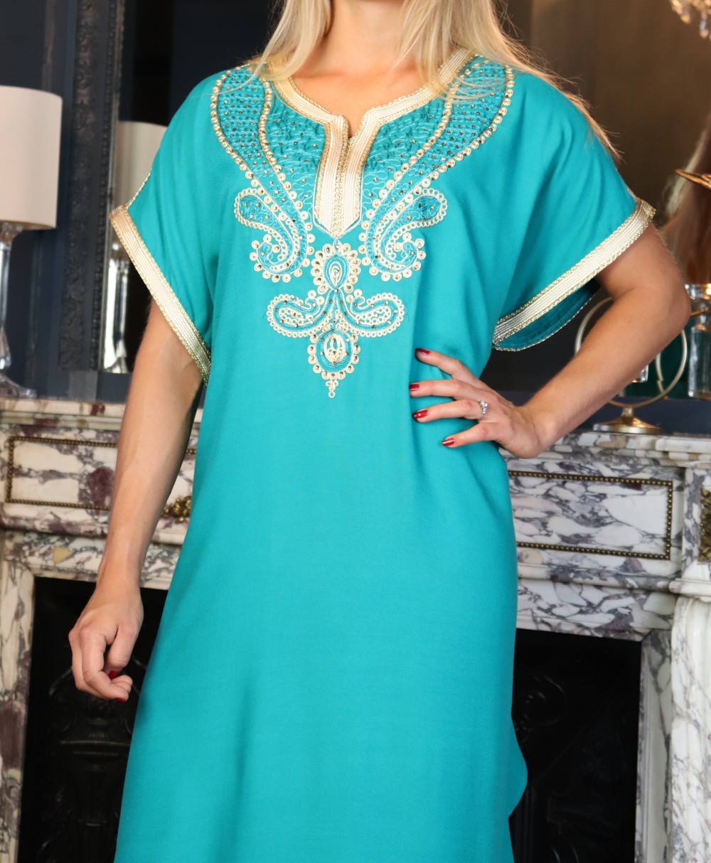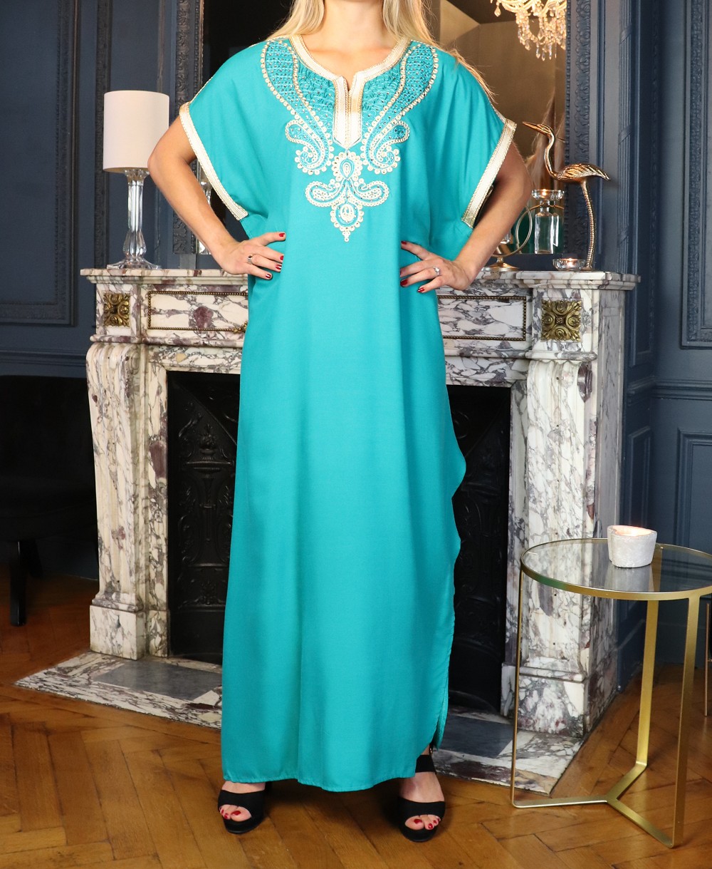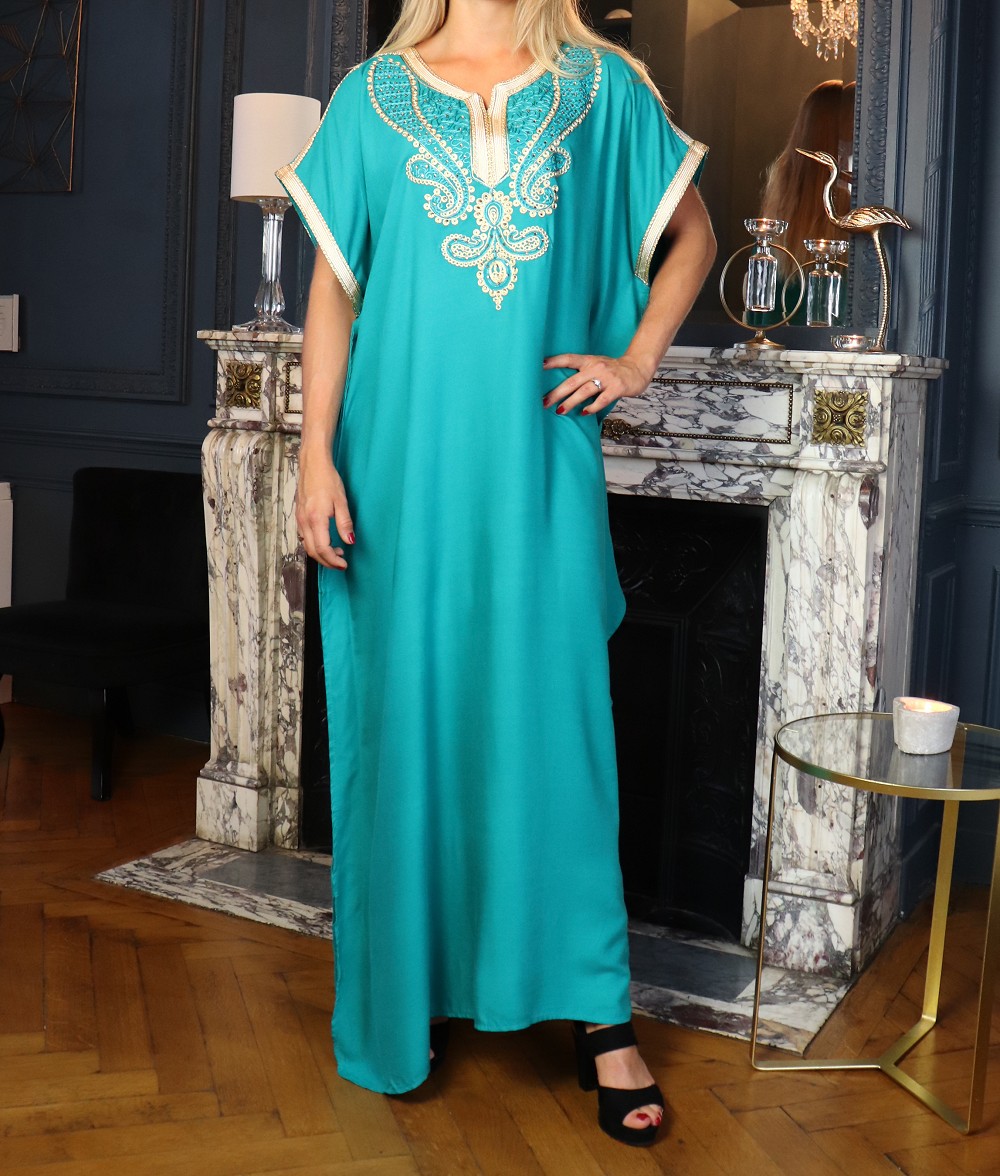 Robe orientale longue manche courte avec belles broderies pour femme - Couleur Vert émeraude Vetement & Accessoire