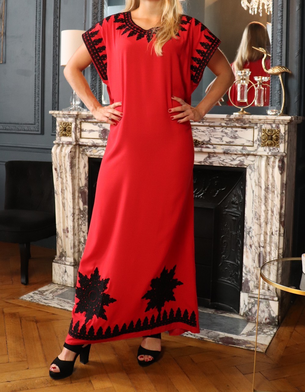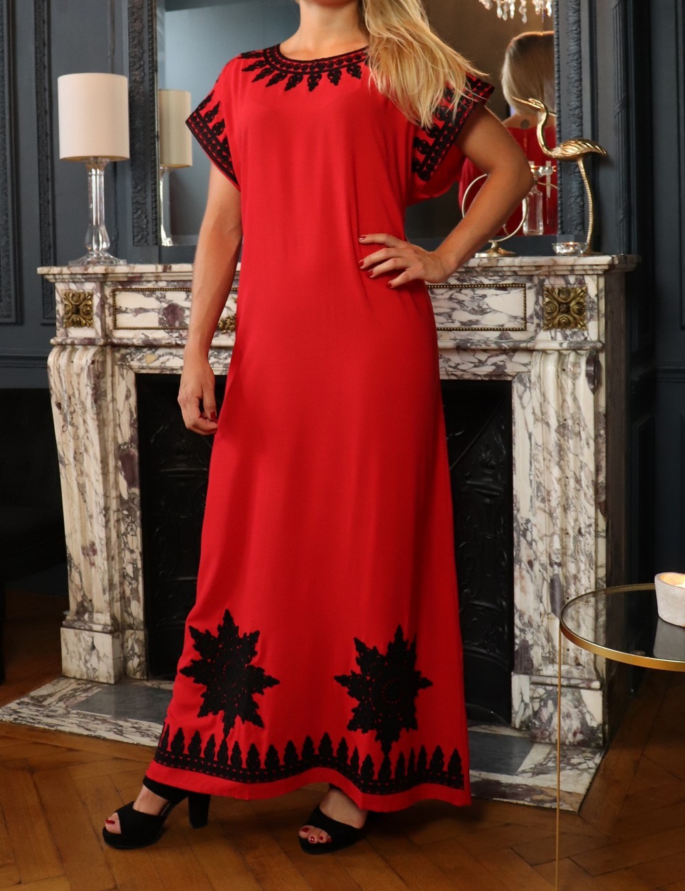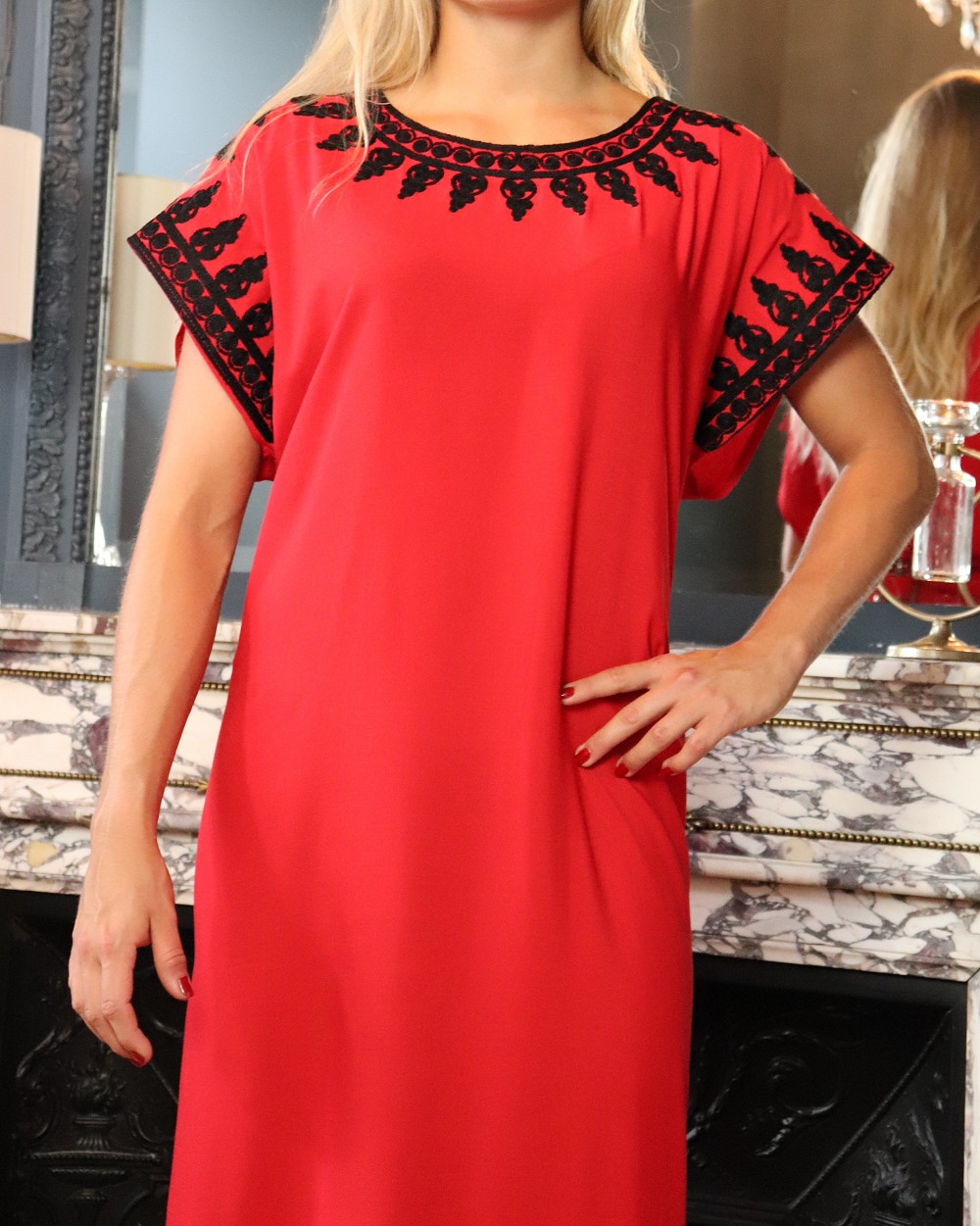 Cette belle robe rouge à manches courte est brodée en couleur noir de motifs orientaux sur le col rond et au manches ainsi sur le bas de la robe. Tour à tour décontractée ou plus sophistiquée au gré de vos envies, vous ne vous lasserez pas de vous glisser dans cette gandoura au tissu léger.