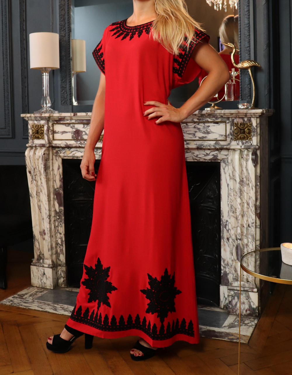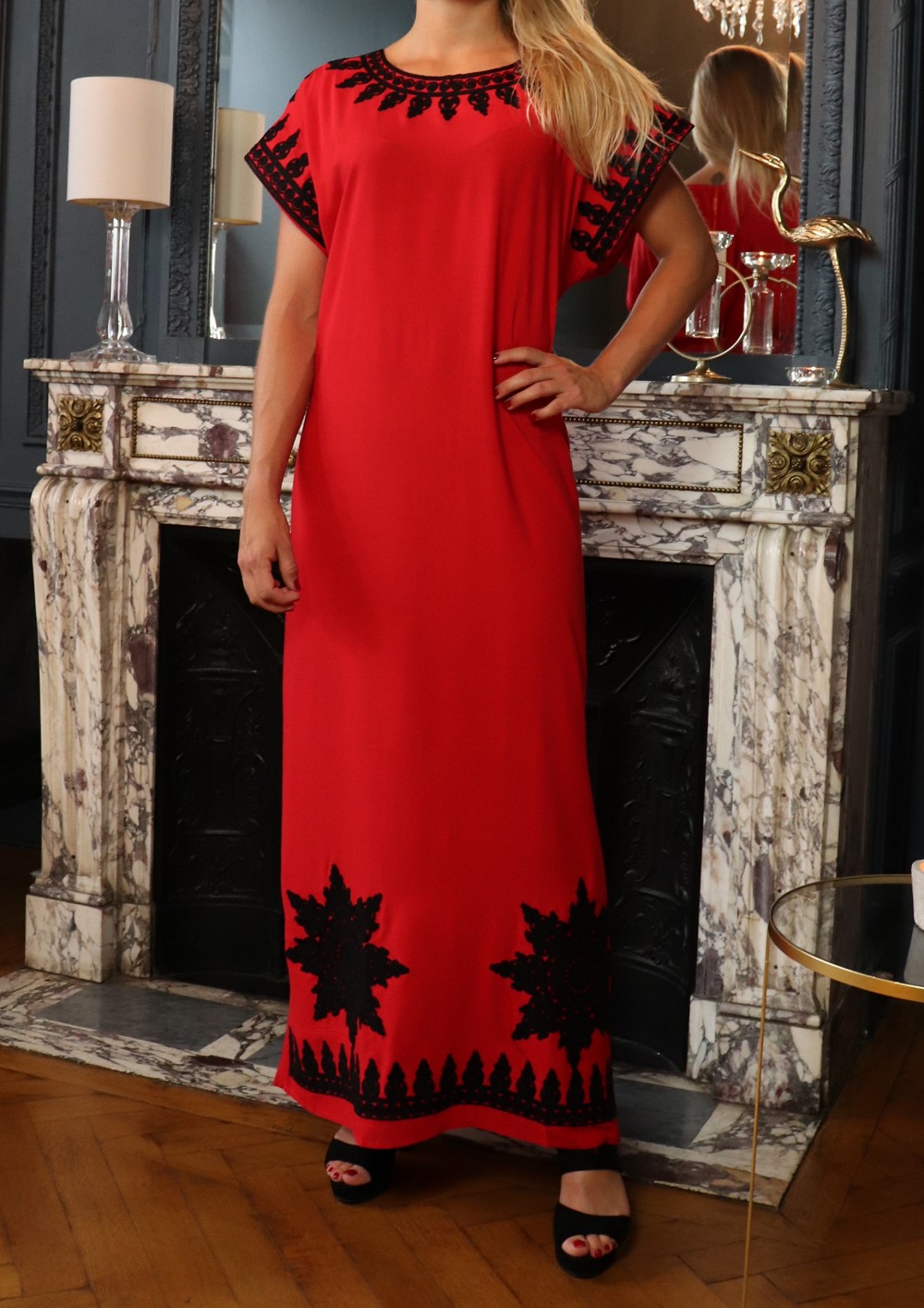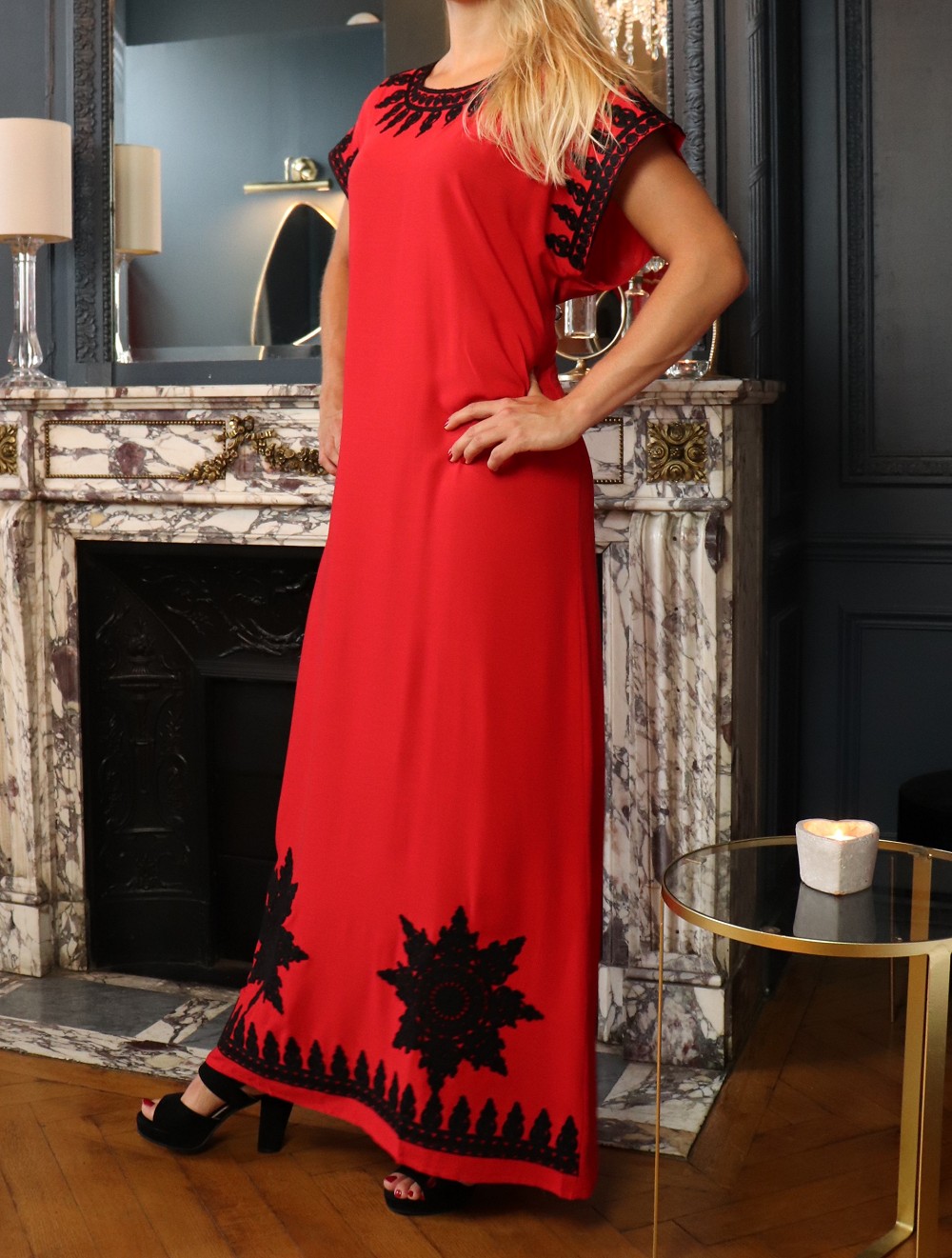 Cette belle robe rouge à manches courte est brodée en couleur noir de motifs orientaux sur le col rond et au manches ainsi sur le bas de la robe. Tour à tour décontractée ou plus sophistiquée au gré de vos envies, vous ne vous lasserez pas de vous glisser dans cette gandoura au tissu léger.