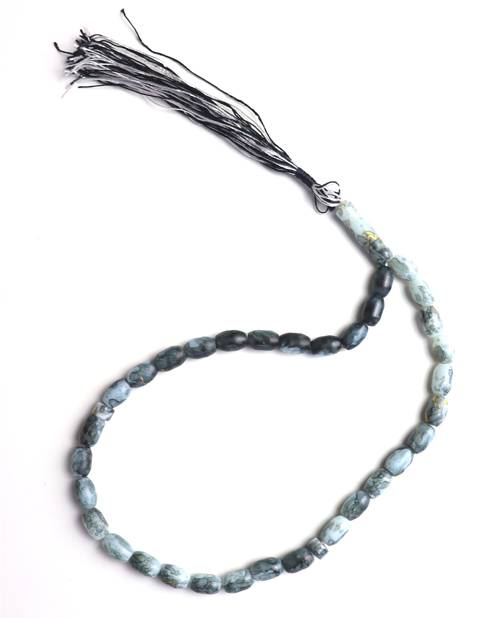 Chapelet 33 graines (perles en verre) de couleur gris marbre.