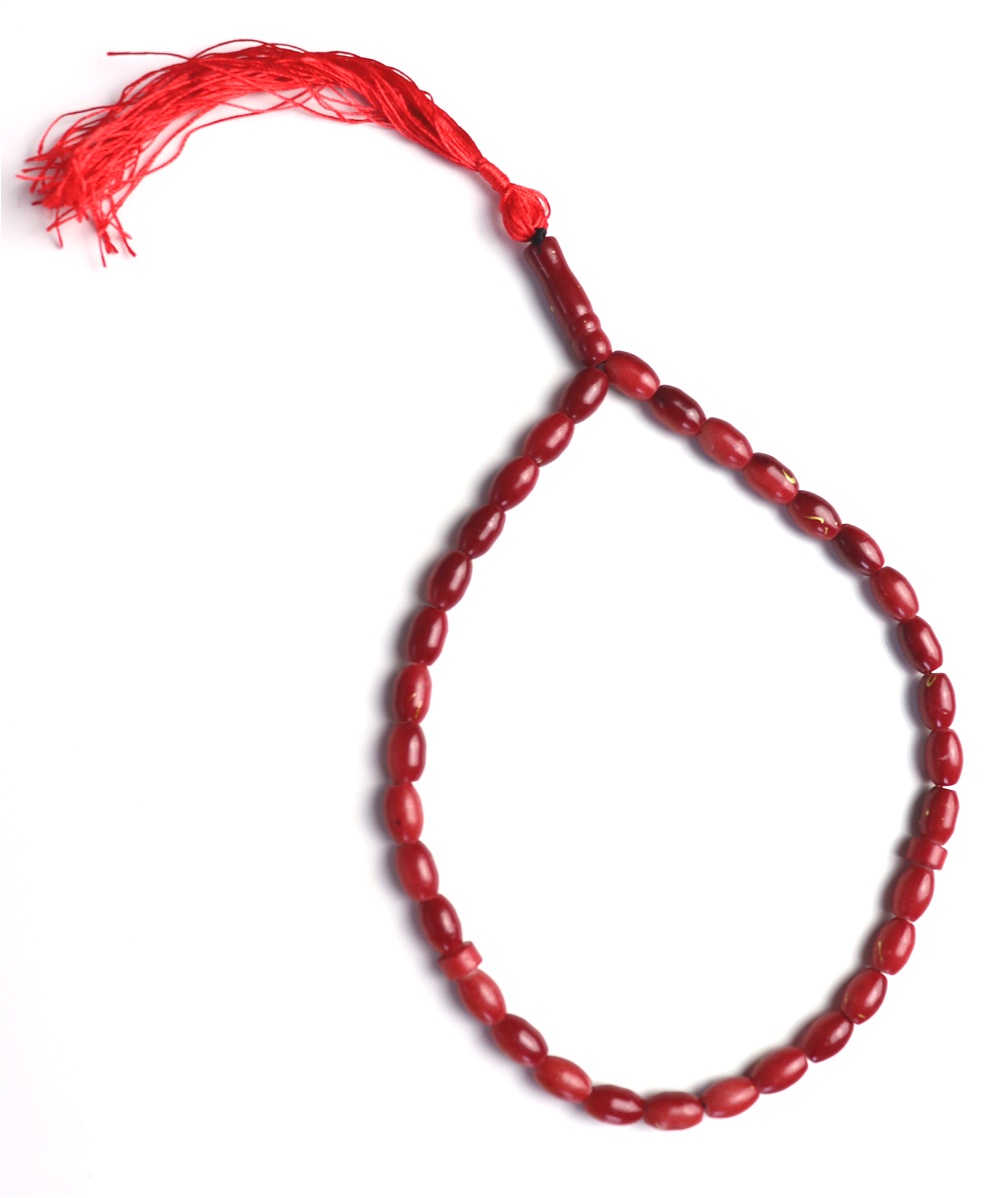 Chapelet 33 grains (perles ovales en verre) de couleur rouge corail, avec séparateur tous les 11 grains. Peut contenir de légers motifs dorés.