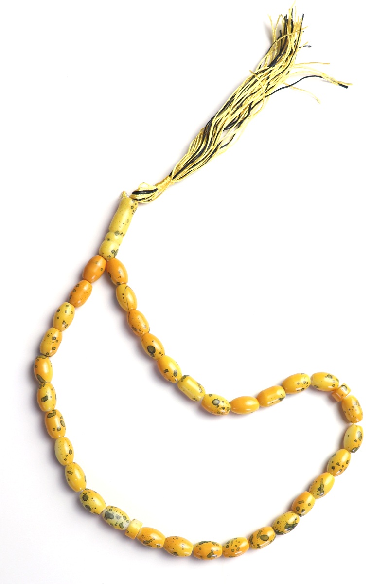 Chapelet 33 grains (perles ovales en verre) de couleur jaune, avec séparateur tous les 11 grains.