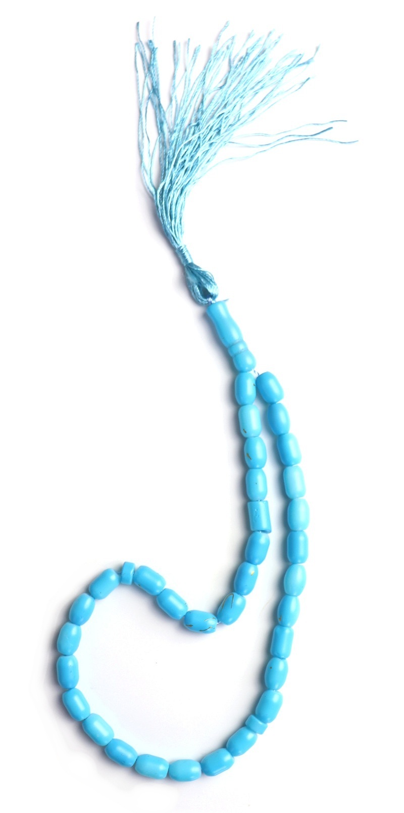 Chapelet 33 grains (perles ovales en verre) de couleur bleu ciel, avec séparateur tous les 11 grains.