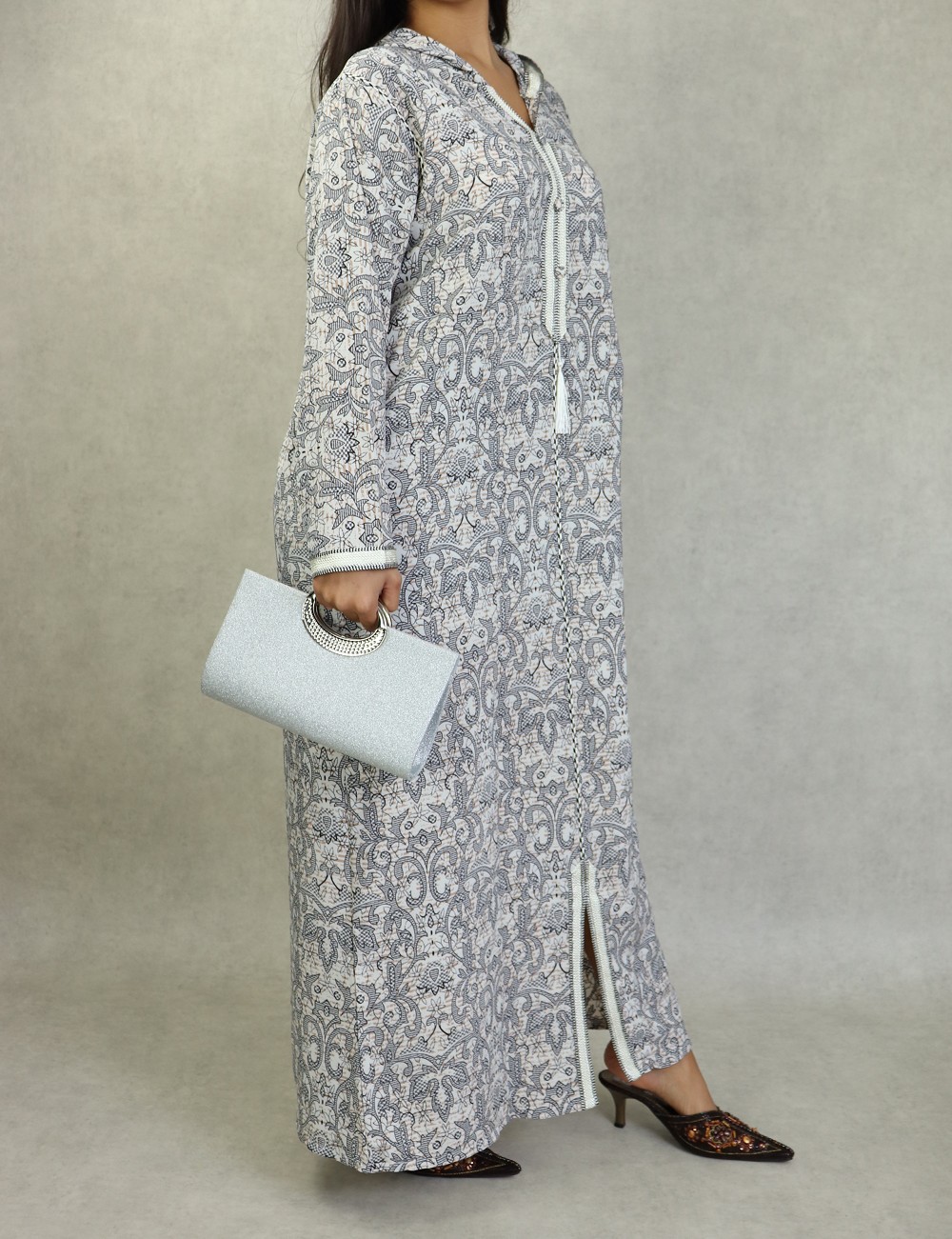 Robe longue, col en V, Manches longues, fluide et légère à fleurs, avec un liseré autour de la capuche, manches et ainsi sur le buste.